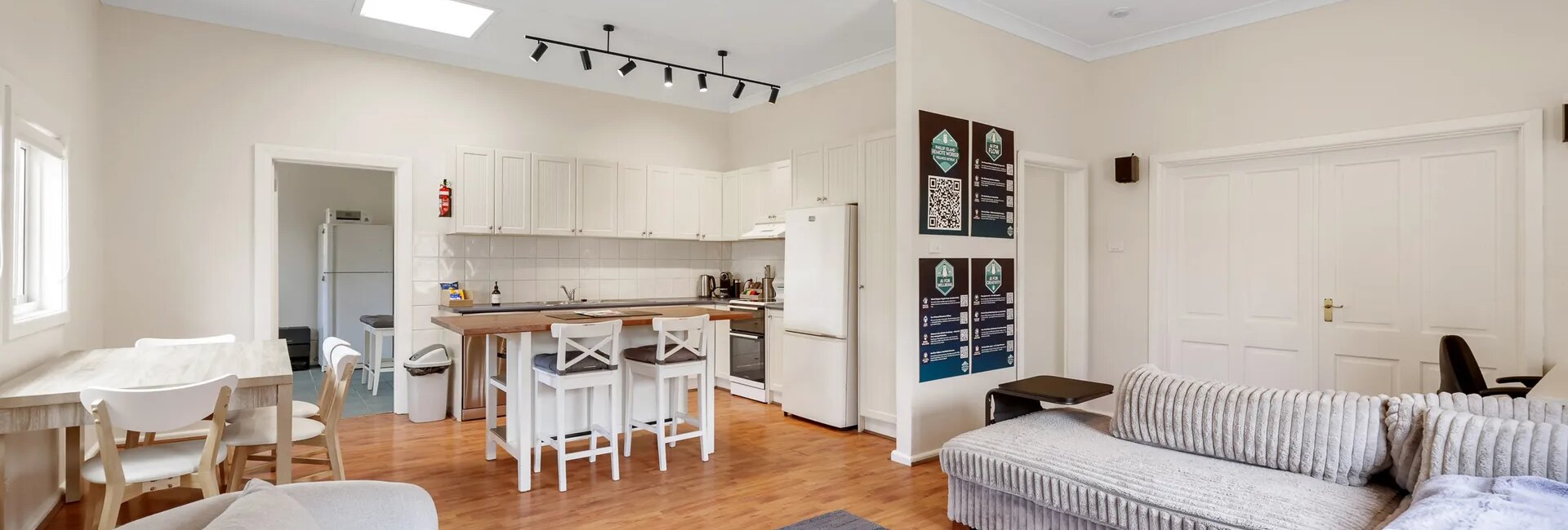 The hallway flows through to the Living Room (with an 85” Smart TV) and Office/Work from home area, thoughtfully tailored for remote workers with extremely fast WiFi, a large 48-inch widescreen, and a wall of QR codes offering fun local ideas and AI assistance. Adjacent is the Kitchen/Dining area, while a separate Toilet and fully equipped Laundry (with washing machine & clothes dryer) add extra convenience for guests.