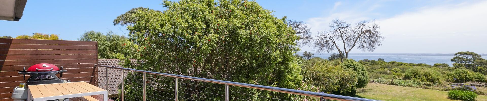 The upstairs deck (with gas BBQ, 2 x armchairs and 6-seater table with chairs & bench seats) has incredible uninterupted water views over the rear yard and nature reserve. The single Garage (with 2nd fridge, beach trolley, chairs & tent) has internal access into the home and parking for one car, with space for another car in front of the Garage.