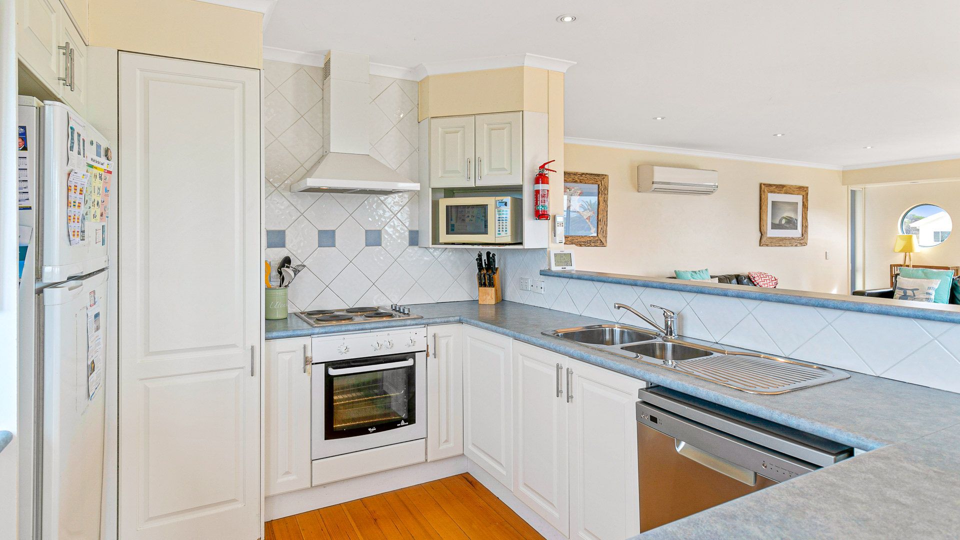The fully appointed kitchen is equipped with modern cooking utensils, crockery, cutlery, microwave, Aldi pod coffee machine, toaster, kettle, etc. plus a double sink, large fridge (2nd fridge in laundry), dishwasher, electric oven and cook top.