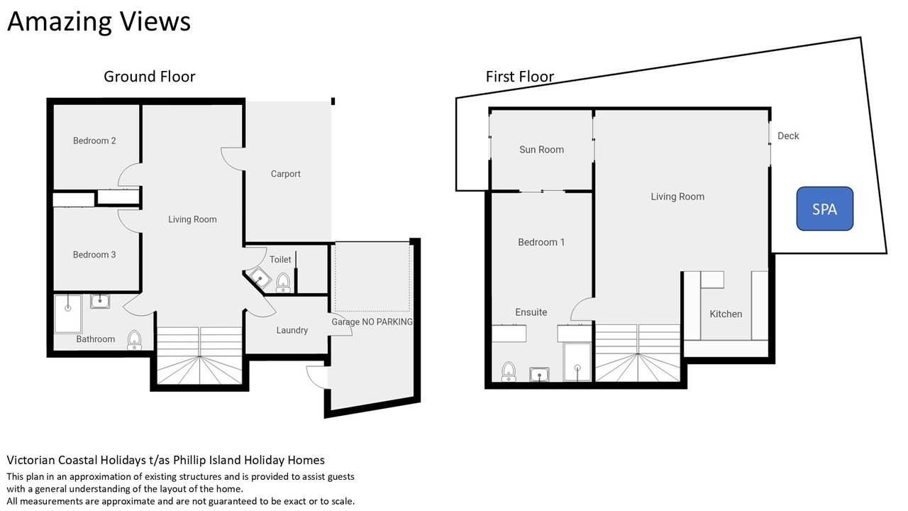 The downstairs Living Room (with 42" TV) provides access to Bedrooms 2 and 3 (each with BIR), a Bathroom (with shower & toilet) a Laundry (with washing machine) and another separate Toilet. Upstairs, the open plan Kitchen/Dining/Living Room (with 56" smart TV & a selection of board games) affords magnificent 180 degree water views. Also off this is Bedroom 1 (with BIR) that has delightful water views, a Bathroom (with shower & toilet) and a glass walled sun room. The stunning views (from which the home derives its name) are able to be enjoyed from the Living Room, Sun Room and Bedroom 1.