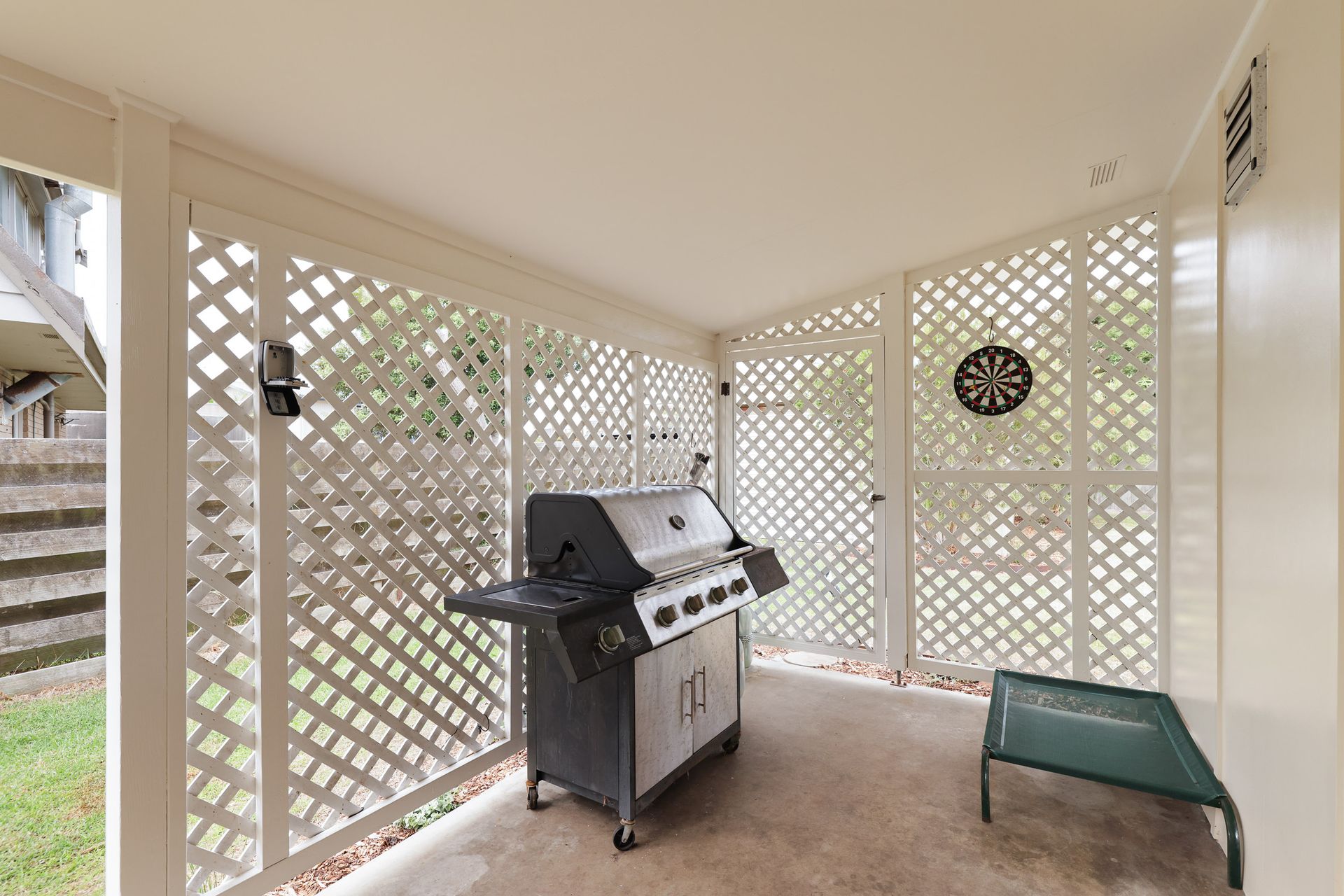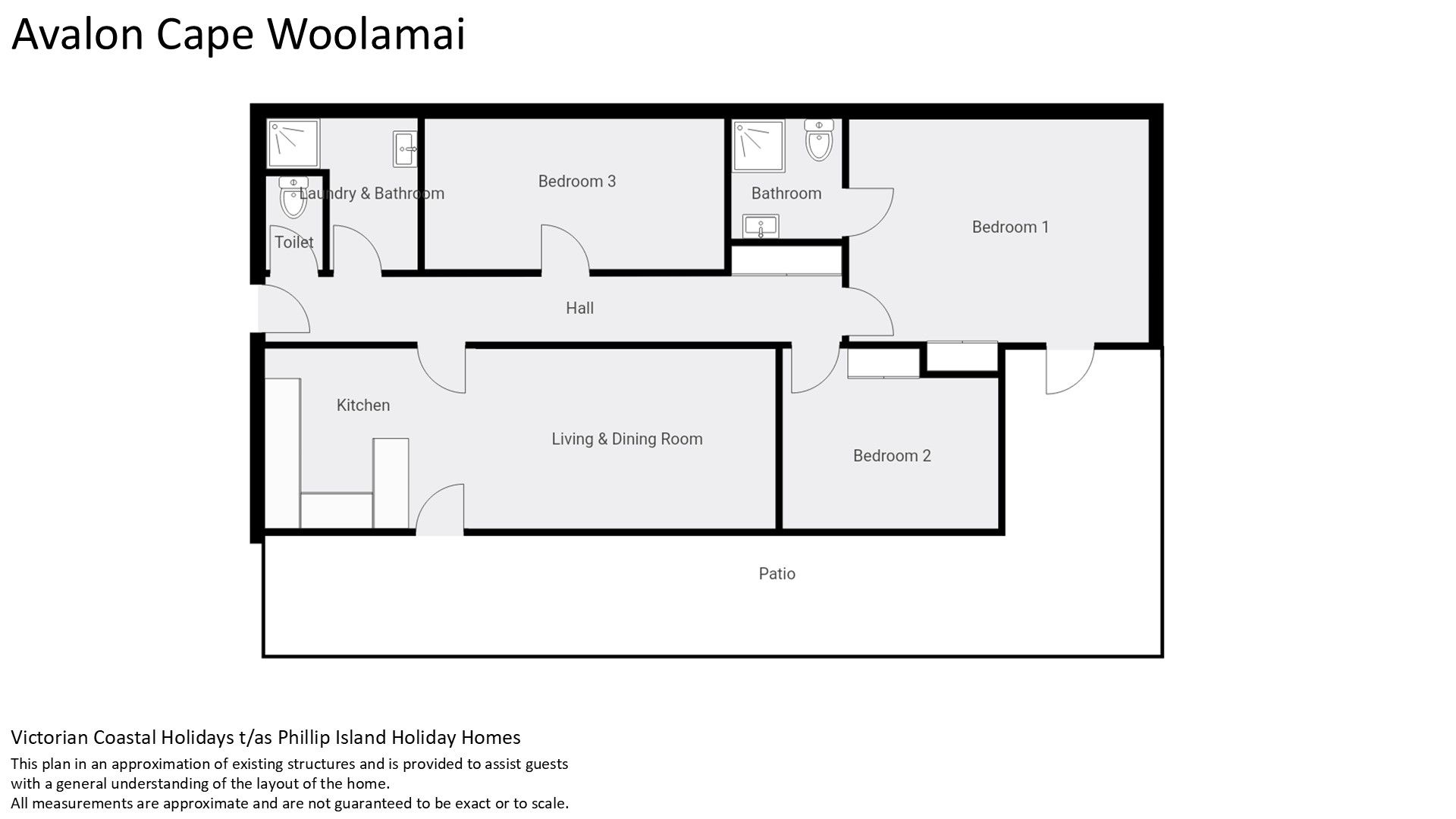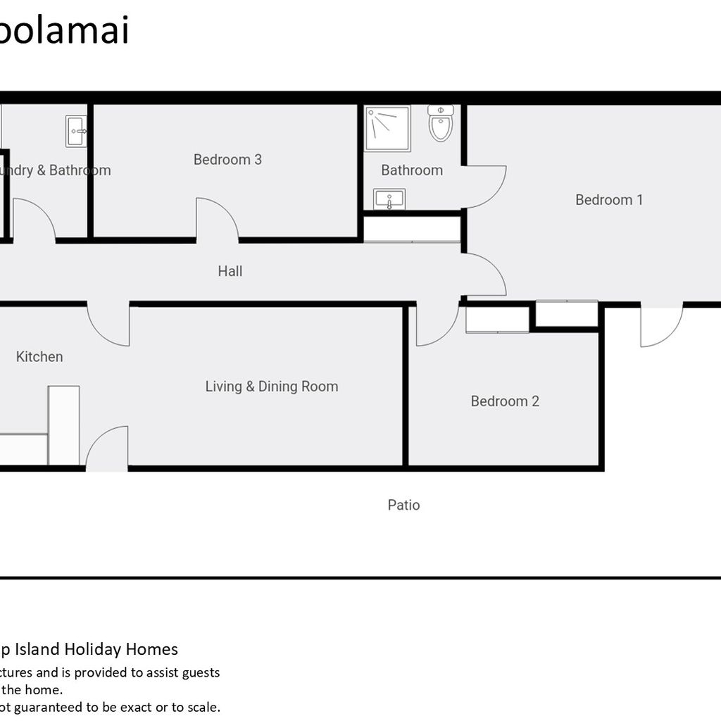 The central hall provides access to the open plan Kitchen/Dining/Living Room (with 60" smart TV, DVD player & movie library) which in turn leads out to the covered Patio. Also off the Hall are Bedroom 2 (with BIR), Bedroom 3 (with chest of drawers & hanging rack), a fully equipped Laundry/Bathroom (with washing machine, clothes dryer, shower with hip bath & basin) and Bedroom 1 with BIR and an ensuite (with shower & toilet) that also opens on to the covered Patio.
