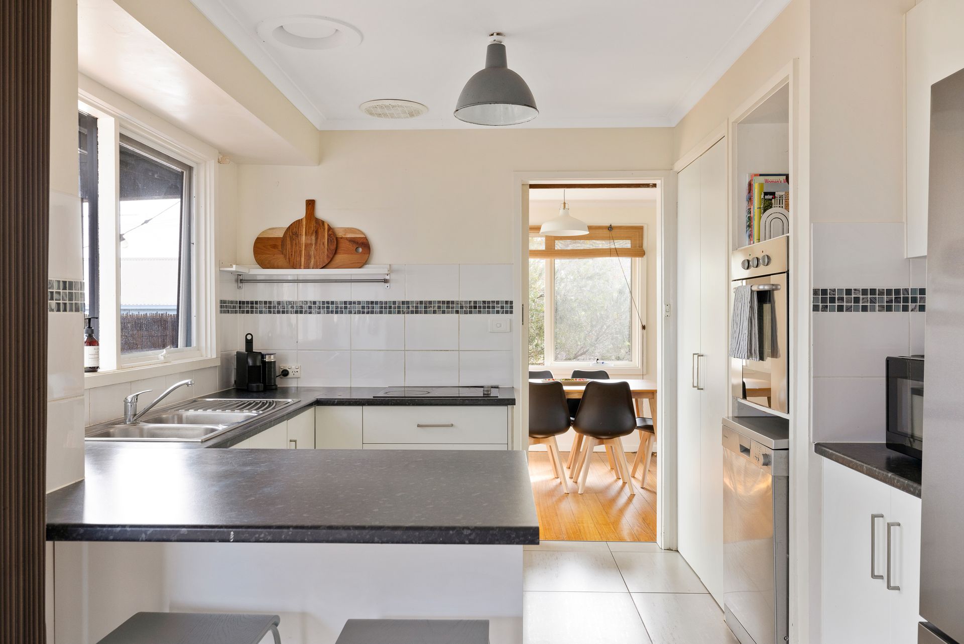 The fully appointed kitchen is equipped with cooking utensils, crockery, cutlery, microwave, Nespresso pod coffee machine, toaster, kettle, etc. plus a double sink, fridge, dishwasher, electric oven and cook top.