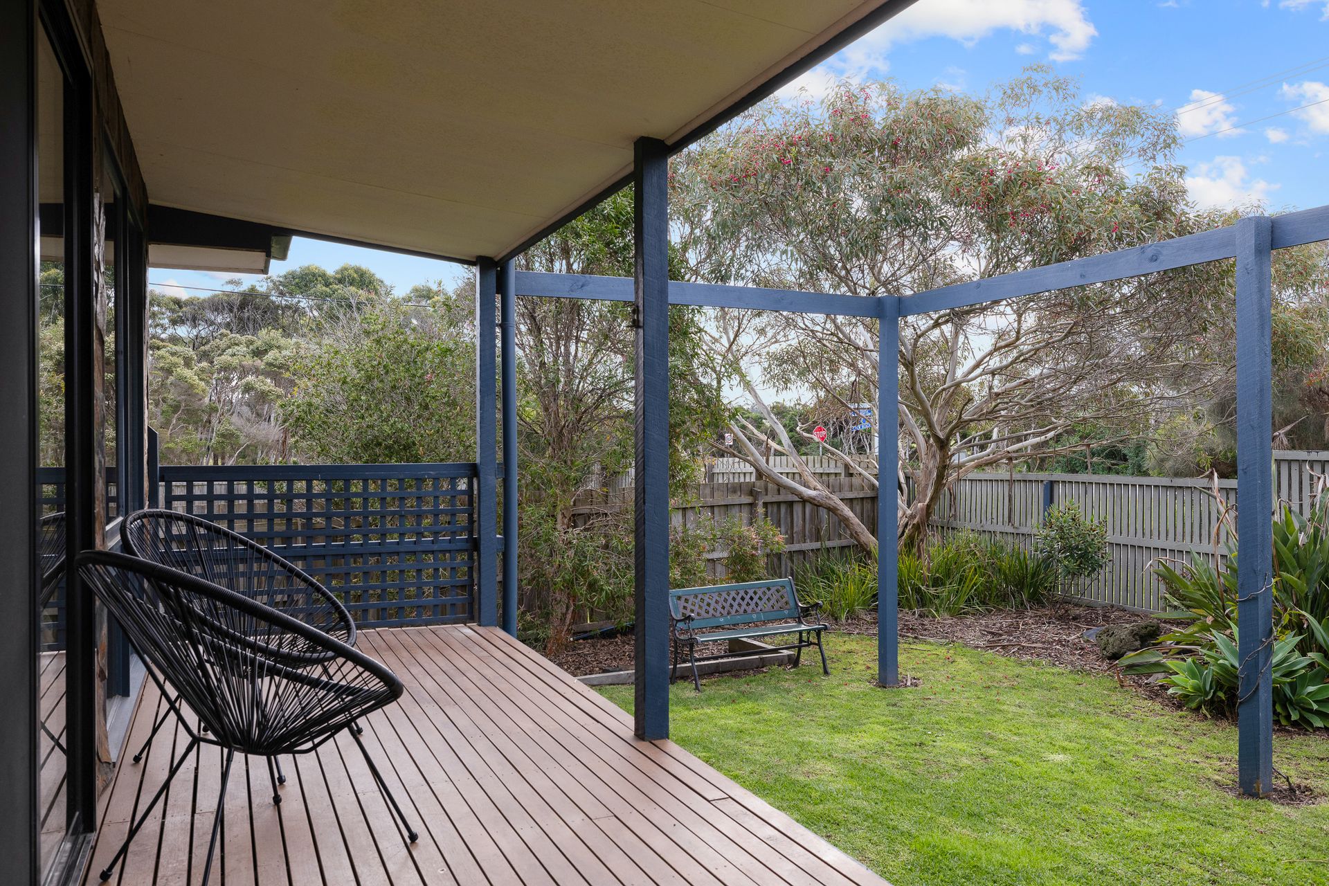 The large open plan Living/Dining Room (with smart TV, Blutooth JBL sound bar speaker & wood heater) is a lovely space to relax. The rear-facing Kitchen overlooks the outdoor entertaining area, and provides access to the fully equipped Laundry (with washing machine & clothes dryer). A central hallway leads to Bedroom 1 which has an ensuite (with shower & toilet), Bedrooms 2 and 3 (each with BIR), and a Bathroom (with shower over a bath & toilet). There is also a delightful sunroom (accessed through Bedroom 2 or the front deck).
