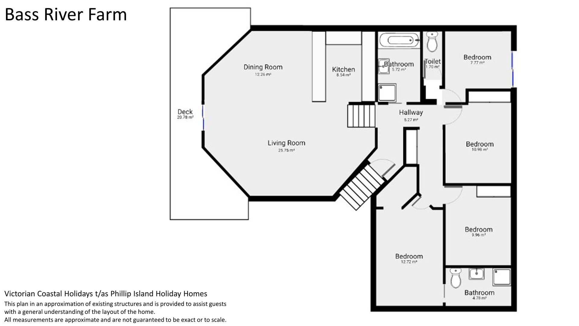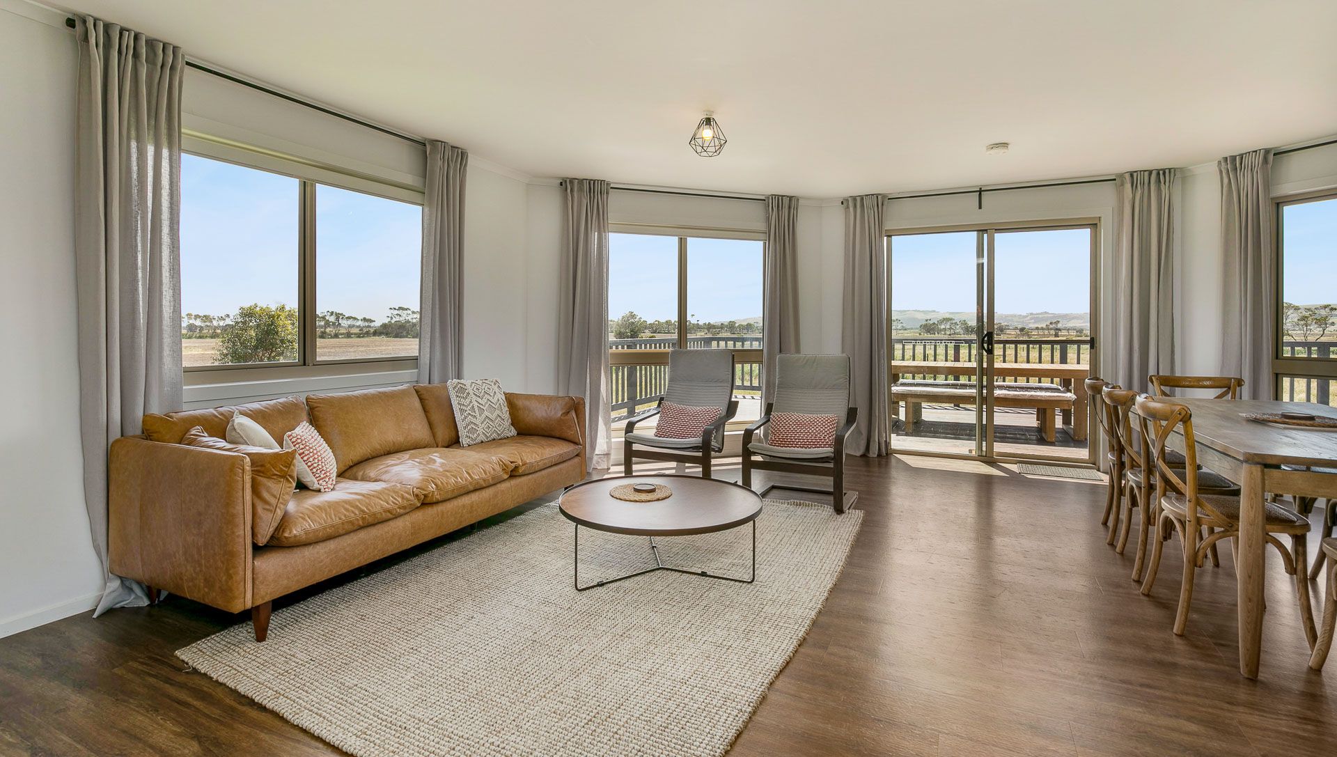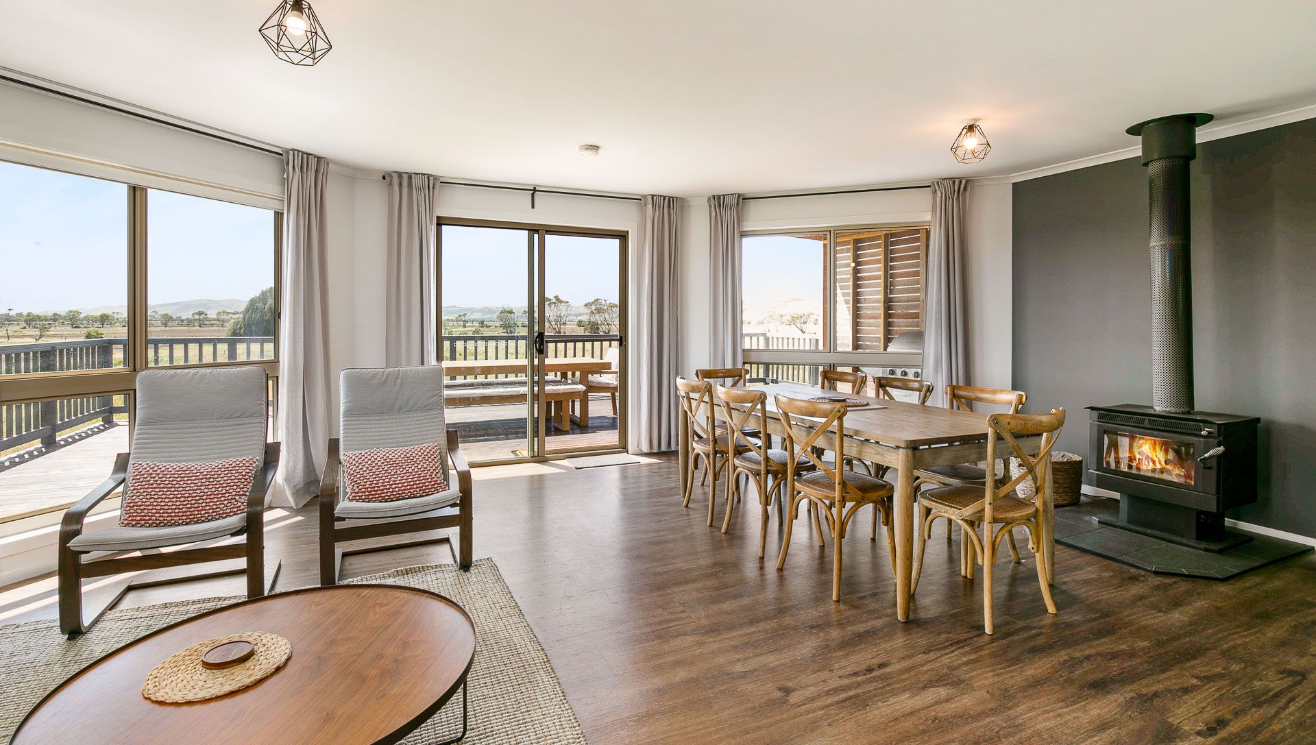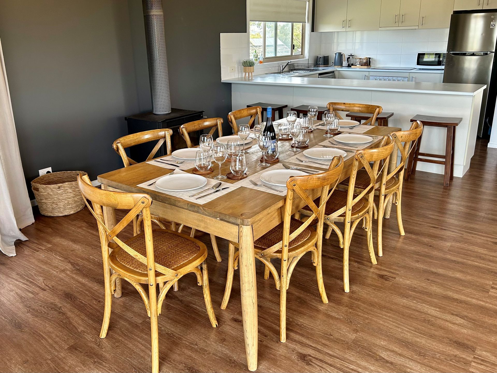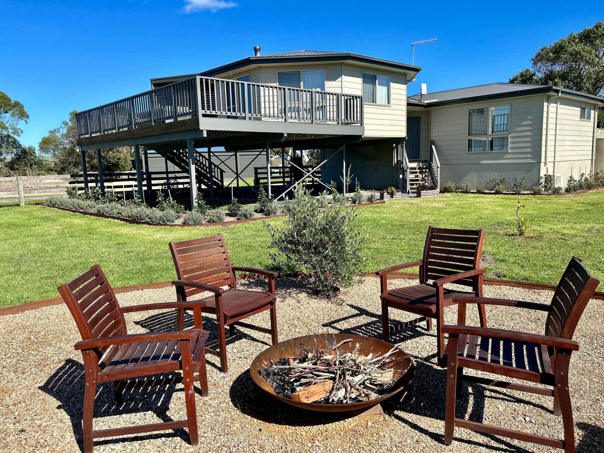 Featuring a large outside deck with barbecue facilities and long dining table, Bass River Farm provides spacious secluded accommodation to relax and unwind. Set on acreage next to the Bass River, the farm is home to friendly miniature Galloway cows, chickens and Guinea fowl. A wide array of beautiful native water birds also visit Bass River farm. For this reason, unfortunately the farm is definitely not pet friendly and we are not able to accommodate groups with pets. A firepit and seating area has also been added to the home, making the outdoor area even more attractive on those winter days and nights. You will need to supply your own firewood and matches.