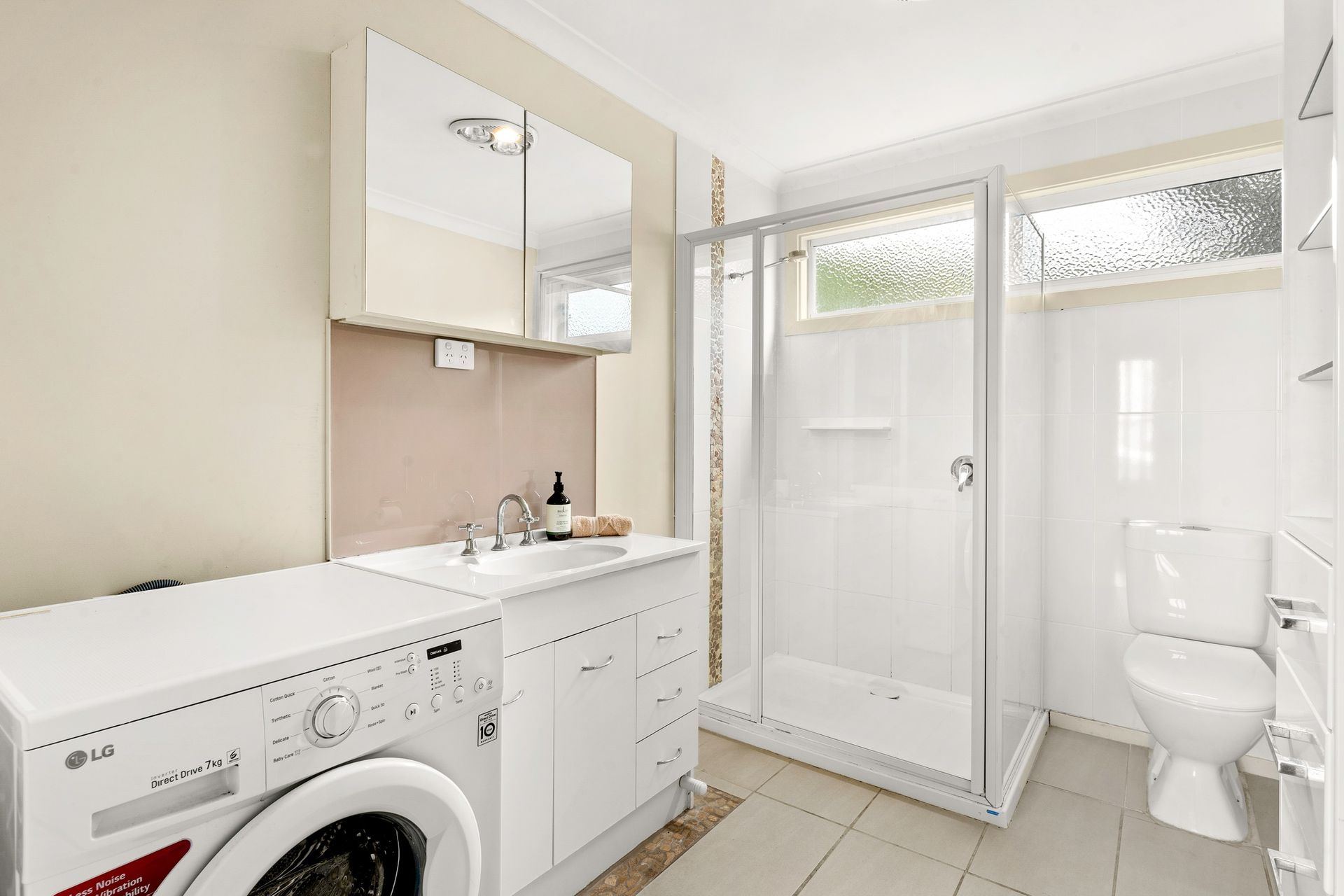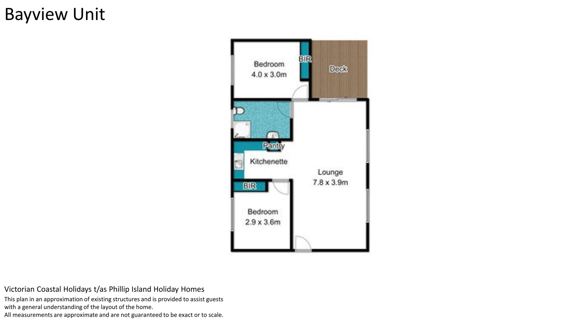 The unit has an open plan living area (with tv) with the kitchenette to one side. Both of the bedrooms have built in robes and share access to the central bathroom (with shower & toilet).