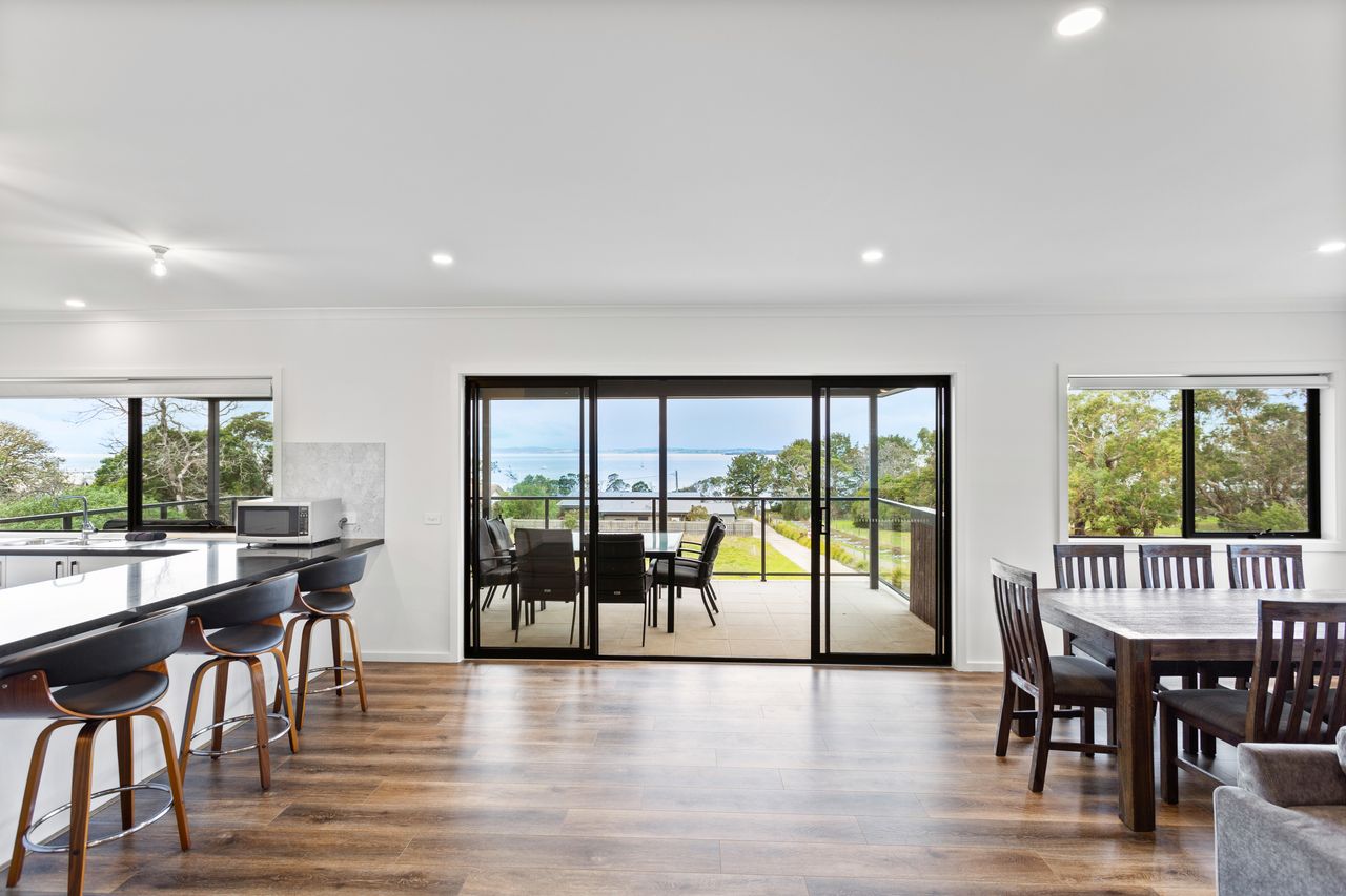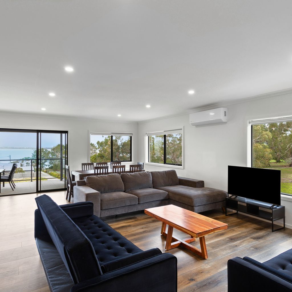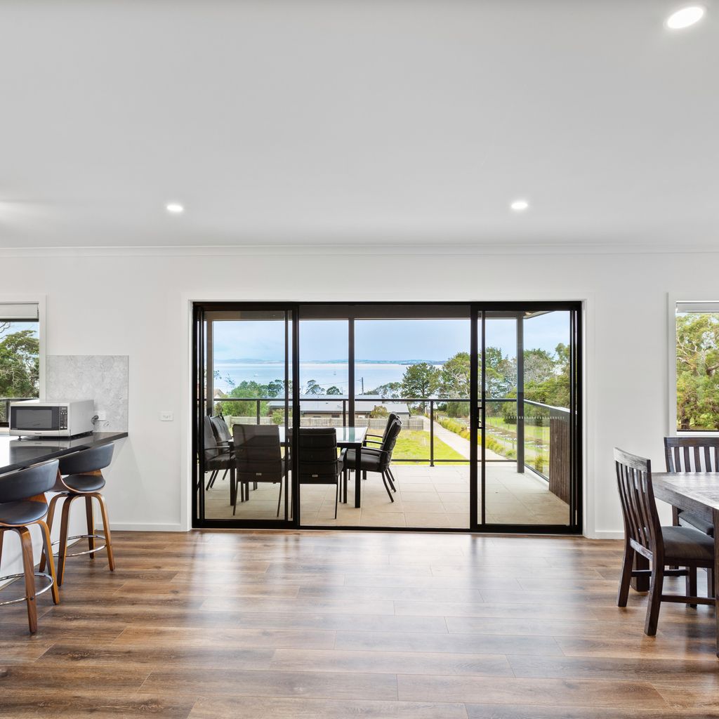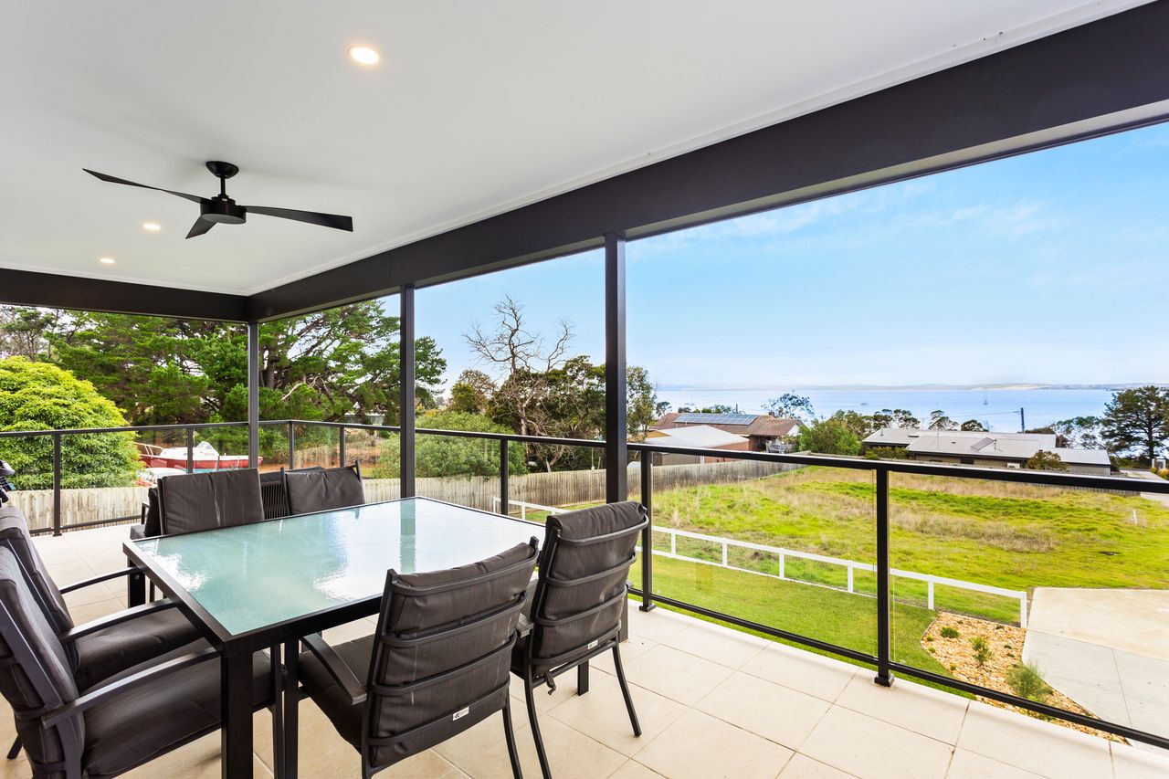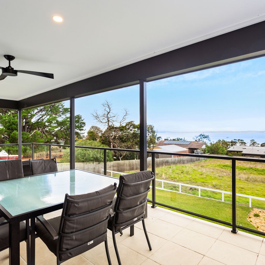 The fantastic covered upstairs front Verandah (with gas BBQ, table for 6 and two small outdoor lounges) has stunning water views over the Churchill Island Marine National Park. The downstairs Alfresco (with seating for 6) overlooks the yard, and there is a Double Garage (with table tennis table & internal access). Parking is available for up to 4 cars in the long, wide driveway.