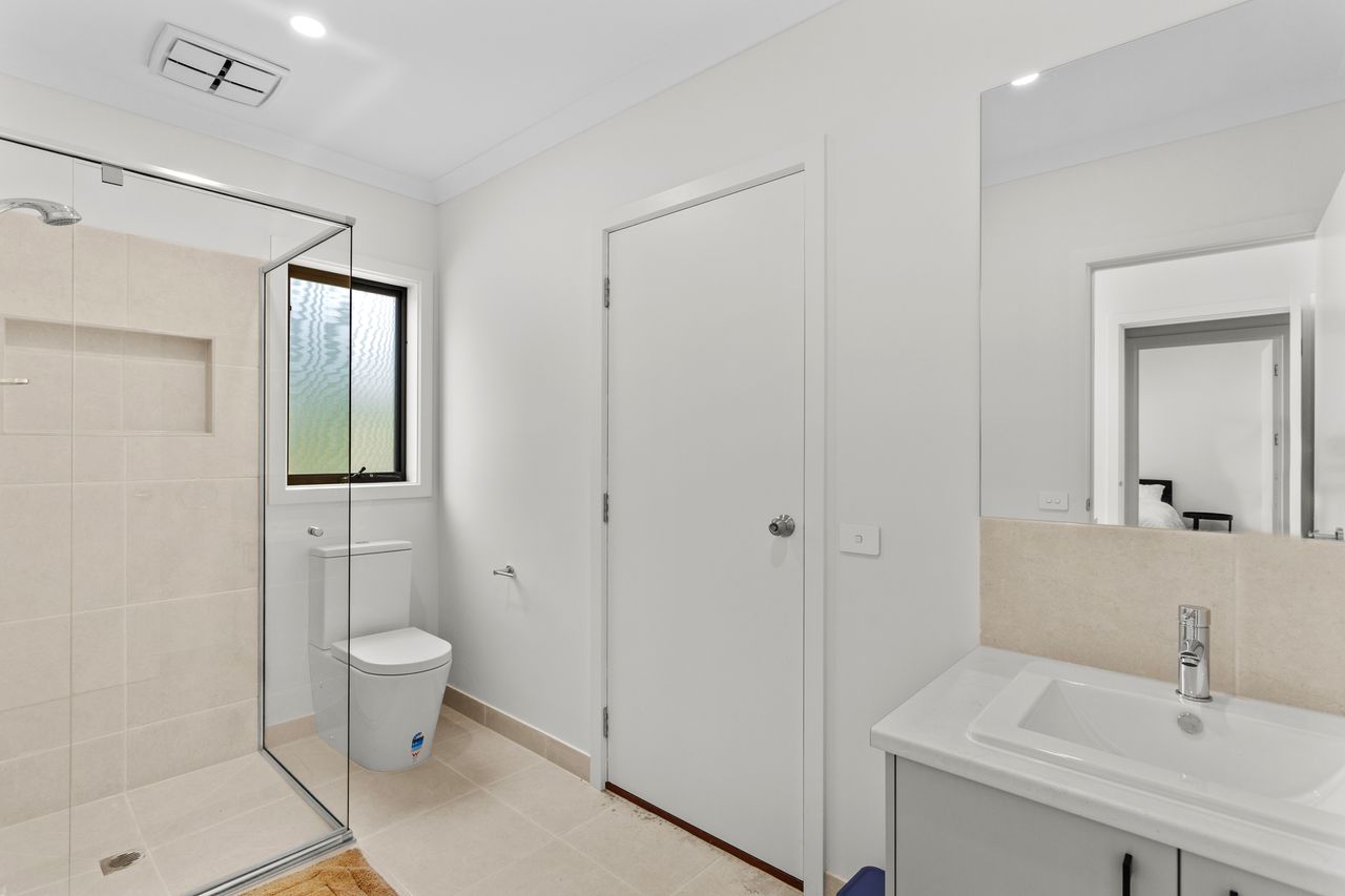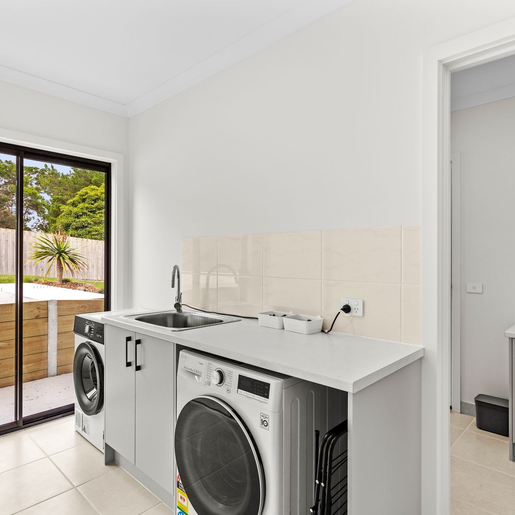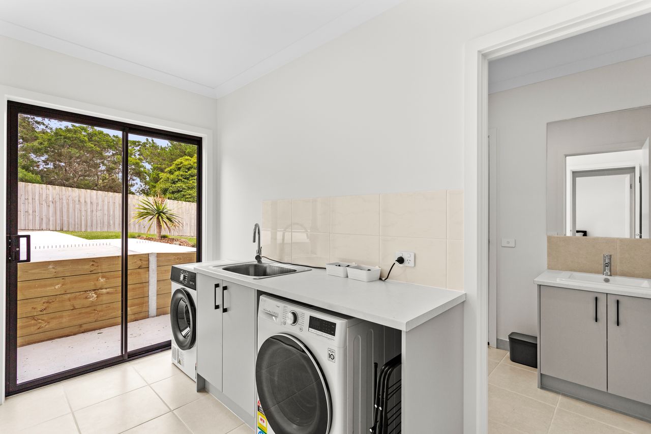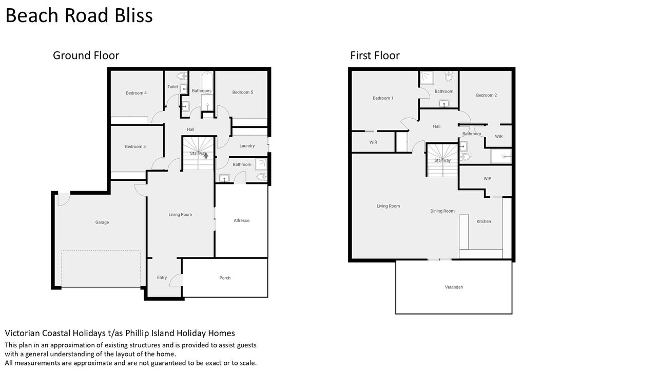 The downstairs Living Room (with a full sized fridge and selection of card & board games) flows out to the covered Ground Floor Alfresco, and has internal access to the Garage. A hallway leads to Bedrooms 3, 4 and 5 (each with BIR), a Bathroom (with shower & bath), a separate Toilet and a fully equipped Laundry (with washing machine & clothes dryer), which in turn leads to another Bathroom (with shower & toilet).
