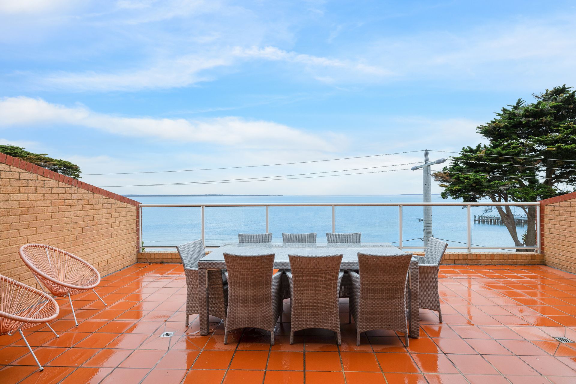 The large semi-covered balcony (with 8-seater outdoor setting and gas BBQ) provides stunning 180 degree views over the Cowes beach. The apartment is one of 12 apartments that has access to the shared indoor swimming pool (6.5m x 2.7m, managed by 3rd party) and toilets/change rooms which are accessed via a central courtyard. There is one dedicated car space in the secure shared underground car park and the apartment is accessed via a lift from the car park or lobby (there are also stairs). There is also direct access from within the complex to the rear of the Thompson Road shopping precinct.