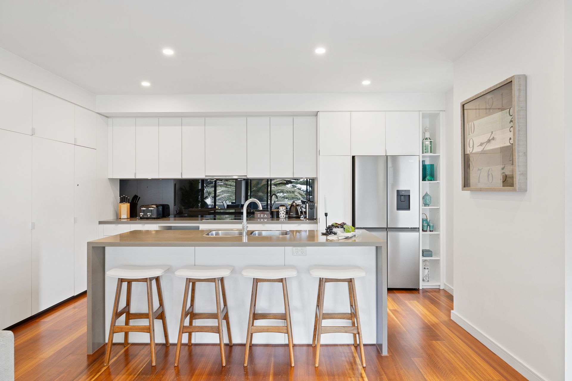 The fully appointed kitchen is equipped with cooking utensils, crockery, cutlery, microwave, Aldi pod coffee machine, toaster, kettle, etc. plus a double sink, fridge (with plumbed filtered water & automatic ice maker), dishwasher, electric oven and cook top.