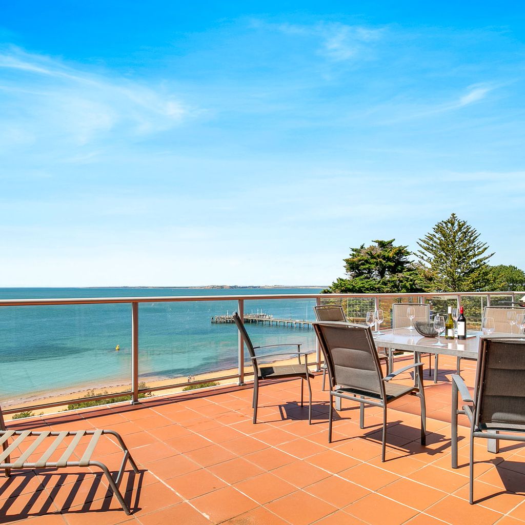 The enormous balcony along the entire front of the Penthouse has a great outdoor setting and BBQ, and provides uninterrupted 180 degree views of Cowes beach. The home has a single car garage with internal access (via stairs) and with space to park an additional car in front of the garage door.