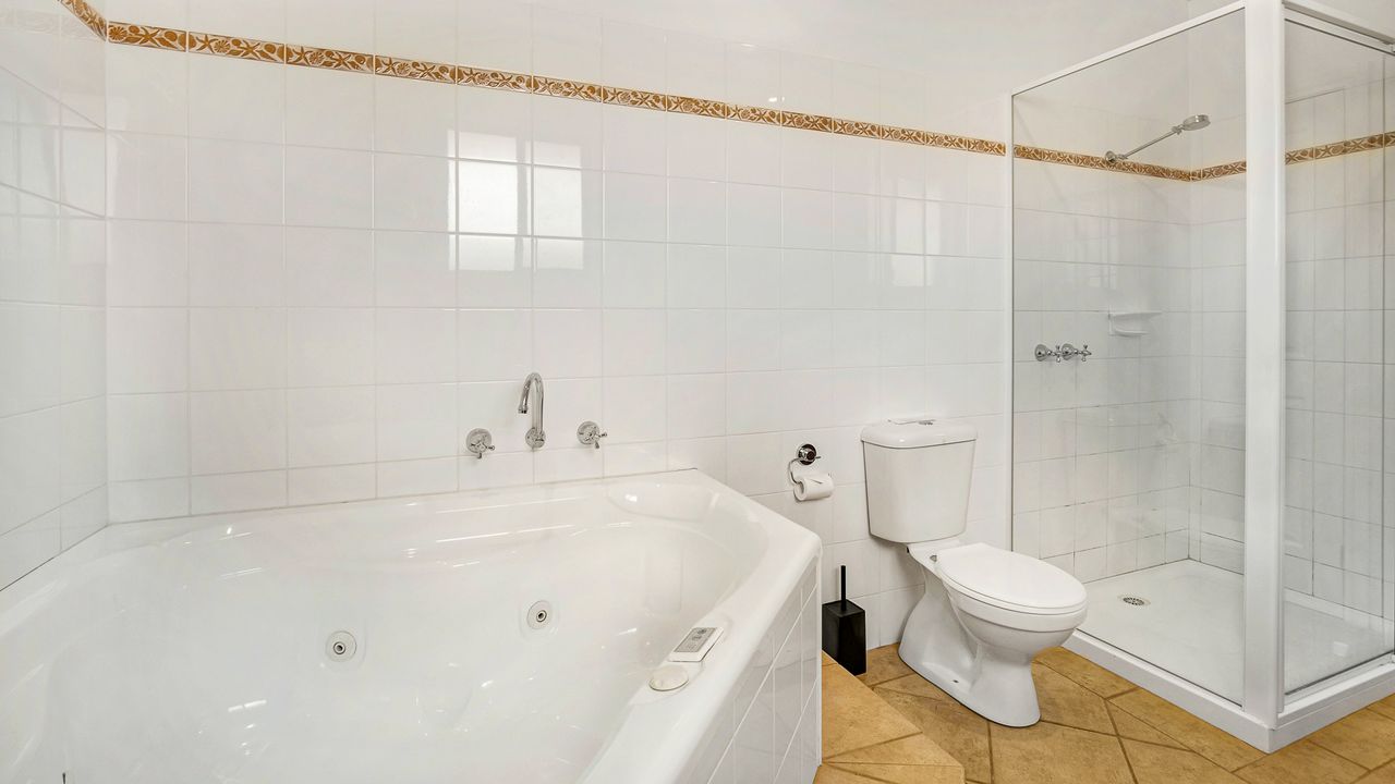 The vast open plan kitchen/dining/living area (with a giant flat-screen TV and CD player ) leads to the spacious Master bedroom (with its own large, flat-screen TV ), plus a huge en-suite bathroom with a corner spa bath. The other 2 bedrooms share the main bathroom (with separate toilet).