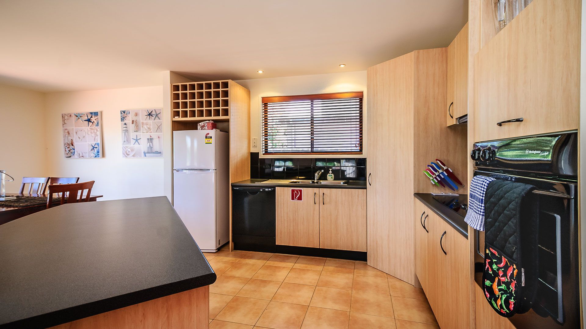 The fully appointed kitchen is equipped with cooking utensils, crockery, cutlery, microwave, an Aldi pod coffee machine, toaster, kettle, etc. plus a double sink, fridge, dishwasher, electric cook top and oven.