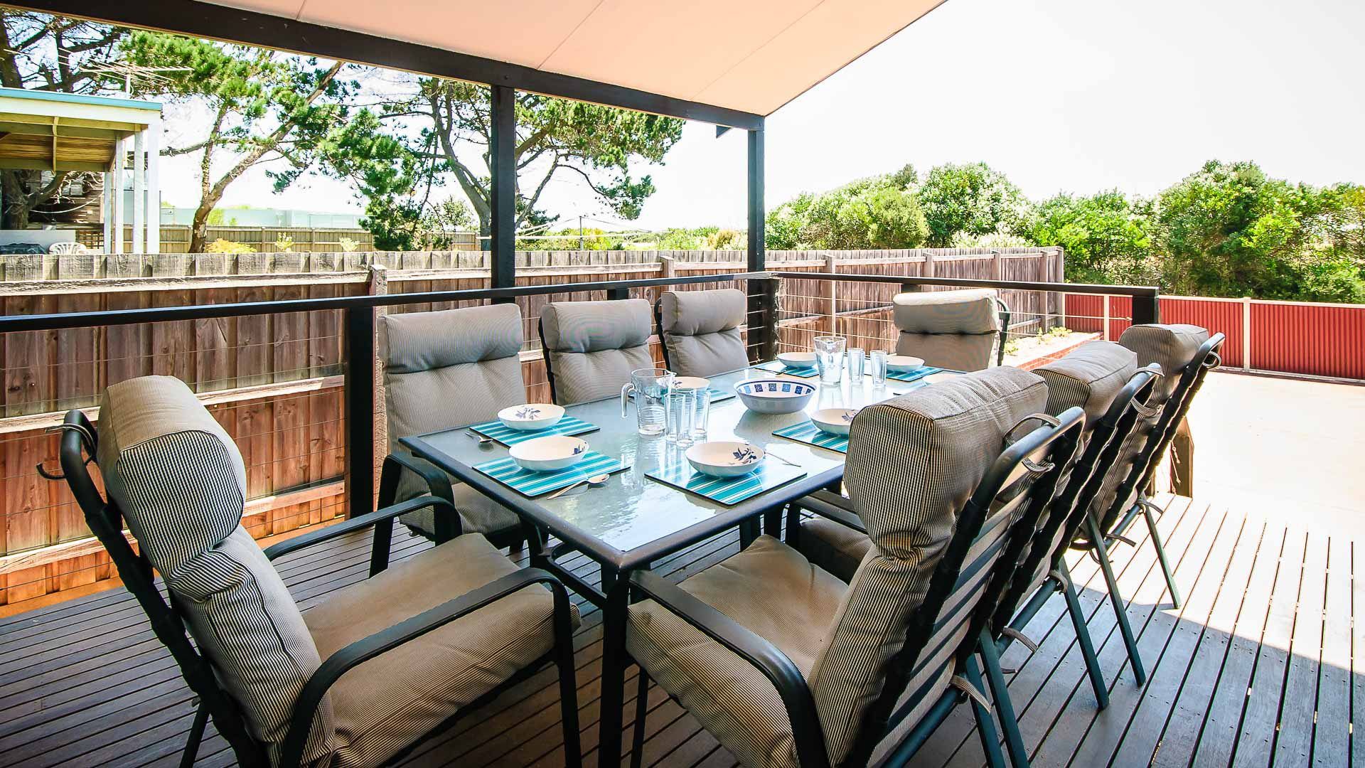 The immense, fully roofed rear deck includes a classy, eight-seater outdoor setting and the ubiquitous four-burner barbie! There is an enclosed yard for your four-legged guests too. There is also an outdoor hot and cold water shower.