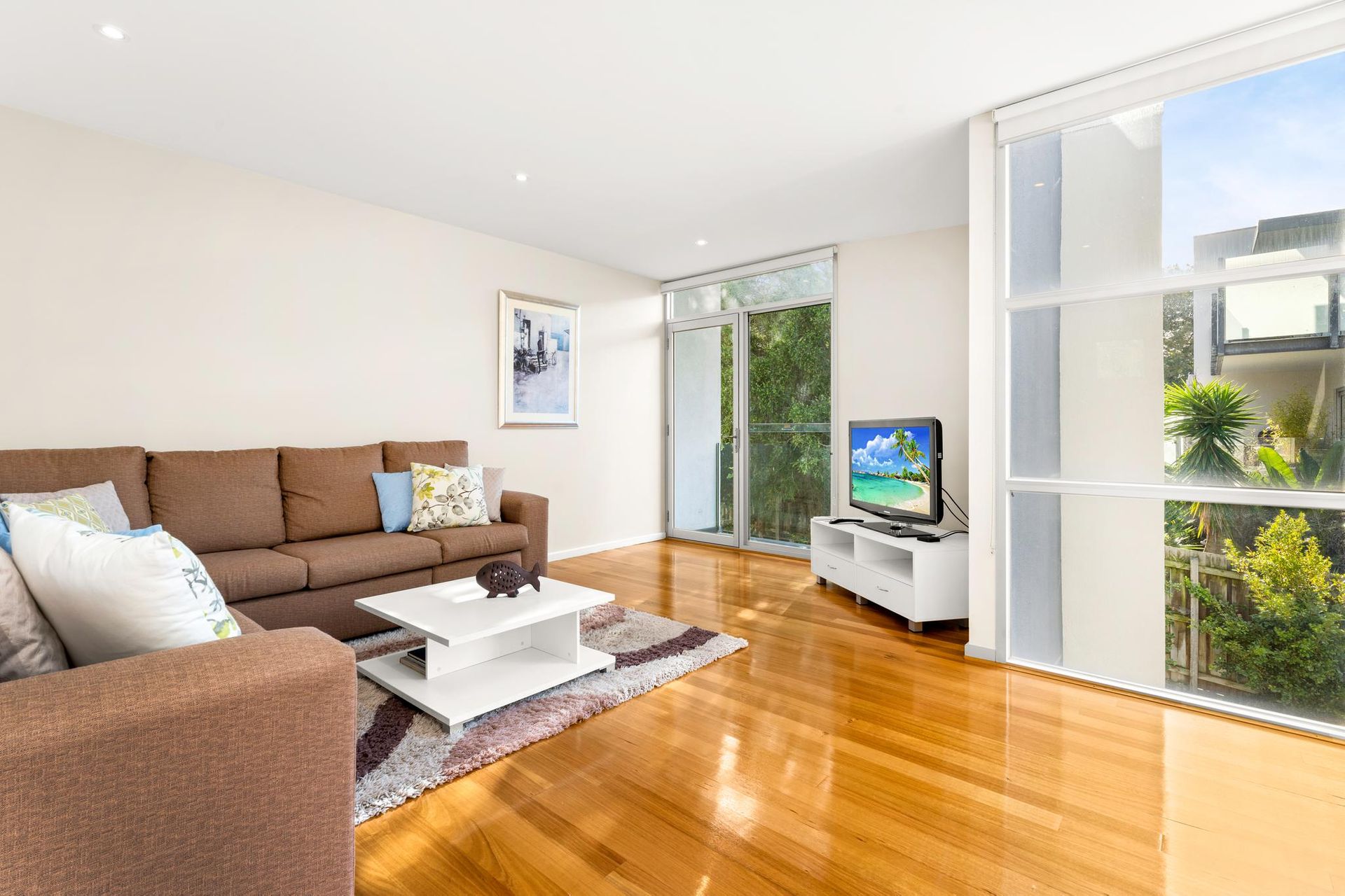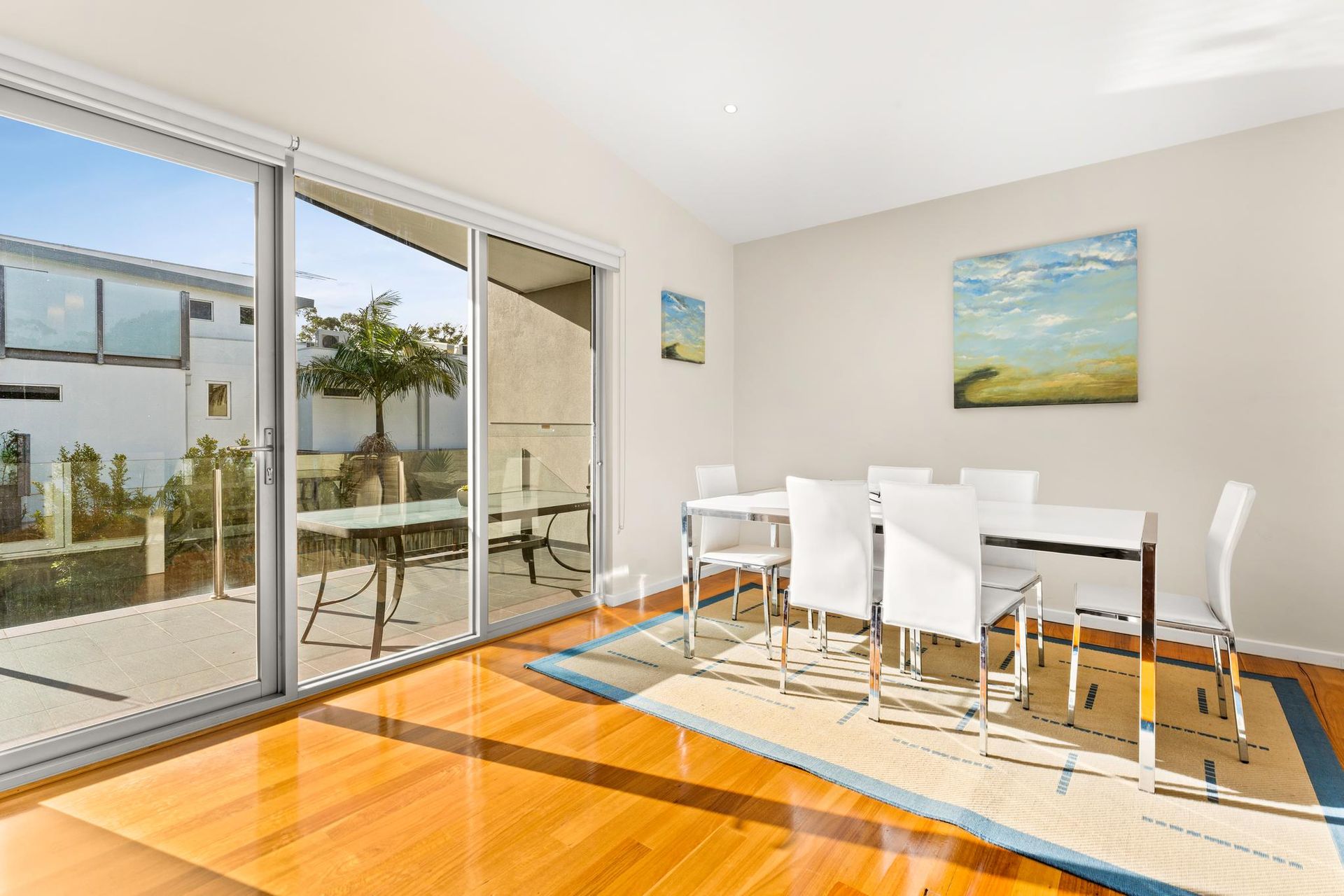 Upstairs is the large open plan kitchen/dining room and living room (with TV, AppleTV & DVD player), access on to the large first floor balcony and a separate powder room.