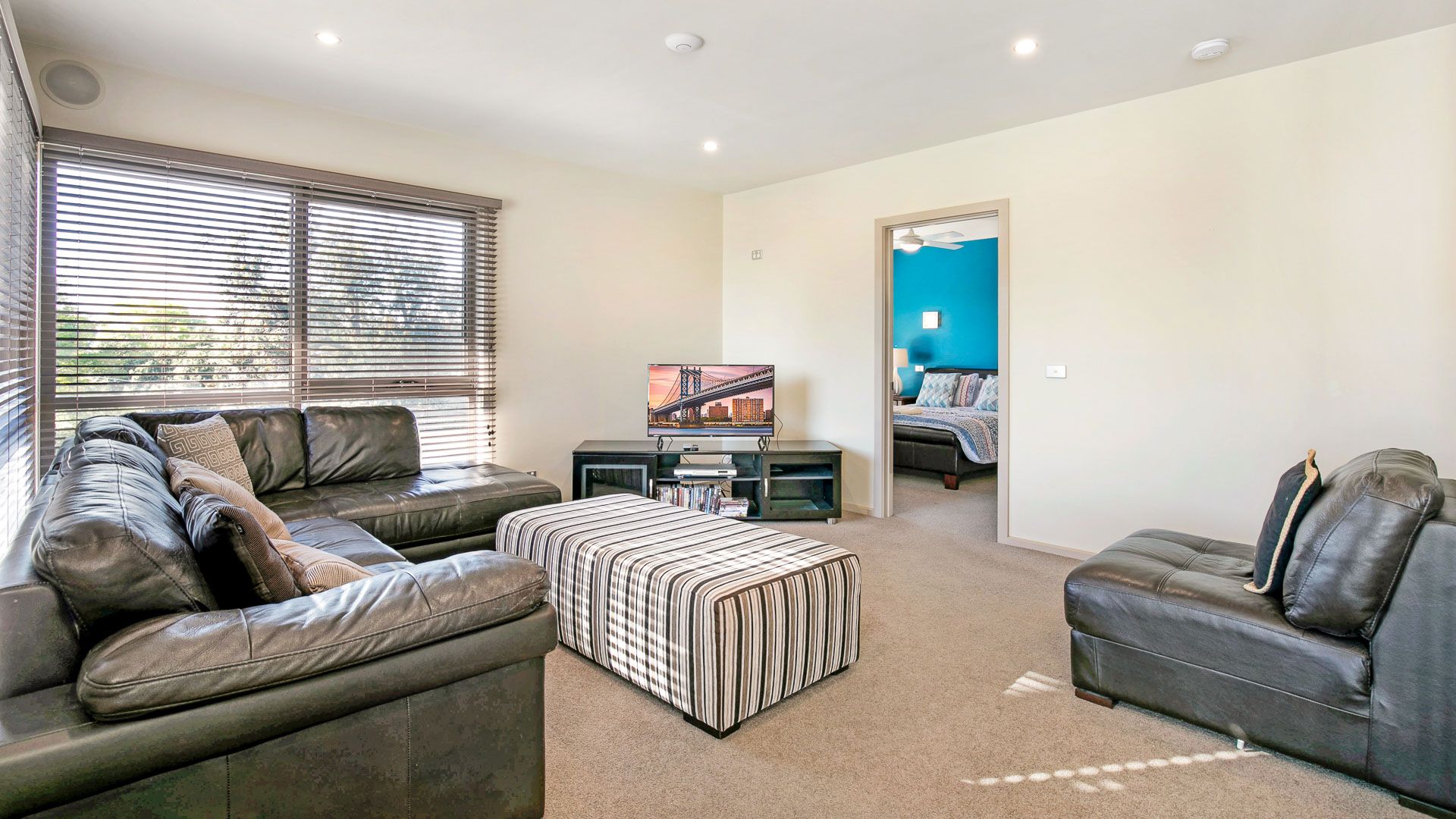 Upstairs is Bedroom 1 which features a TV & WIR, as well as an ensuite (with shower and basin) and a separate Toilet. The large upstairs Living area has a bar (with TV and DVD player). Downstairs is the large open plan Kitchen/Living/Dining room (with TV and chromecast). Bedroom 2 has a TV, BIR and an ensuite (with shower, toilet and basin), while the other three downstairs Bedrooms (all with BIR) share access to the main Bathroom (with bath & shower) and a separate Toilet.