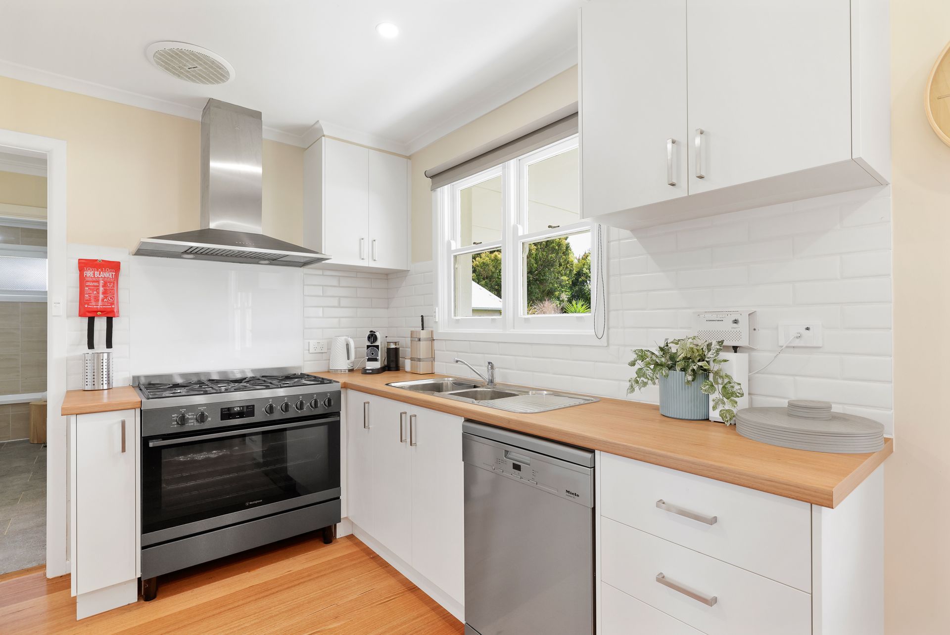 The fully appointed kitchen is equipped with cooking utensils, crockery, cutlery, microwave, Delonghi (Nespresso compatible) pod coffee machine, toaster, kettle, etc. plus a double sink, fridge, dishwasher, 900mm electric oven with inbuilt air fryer and 5-burner gas cook top.