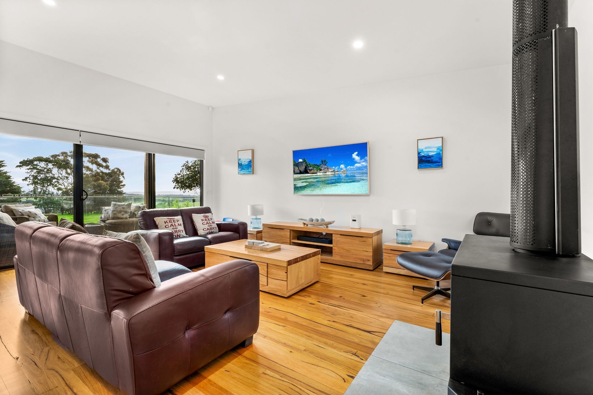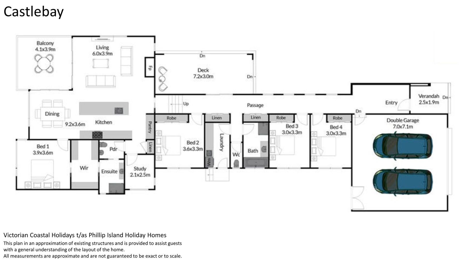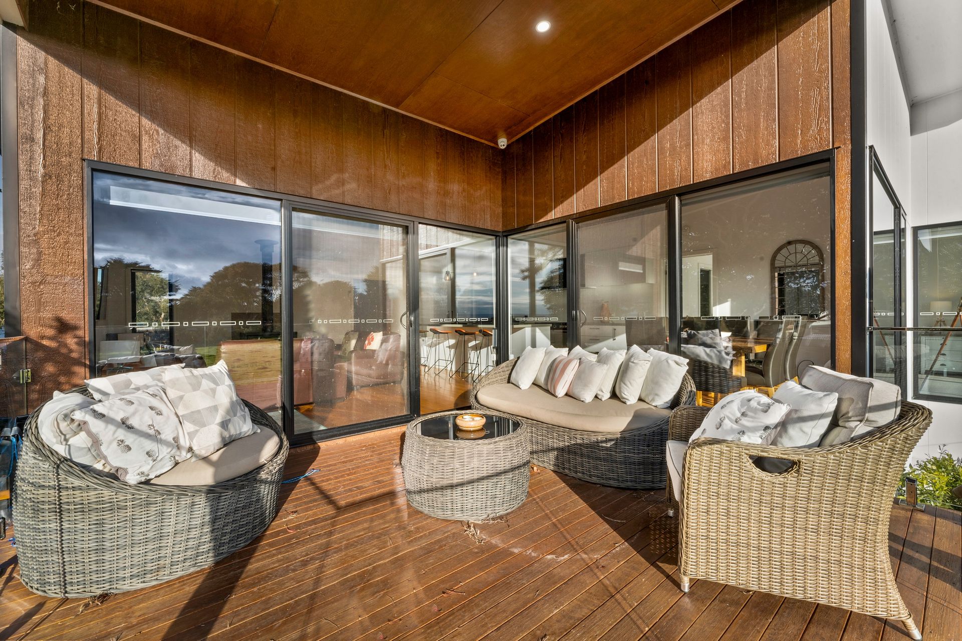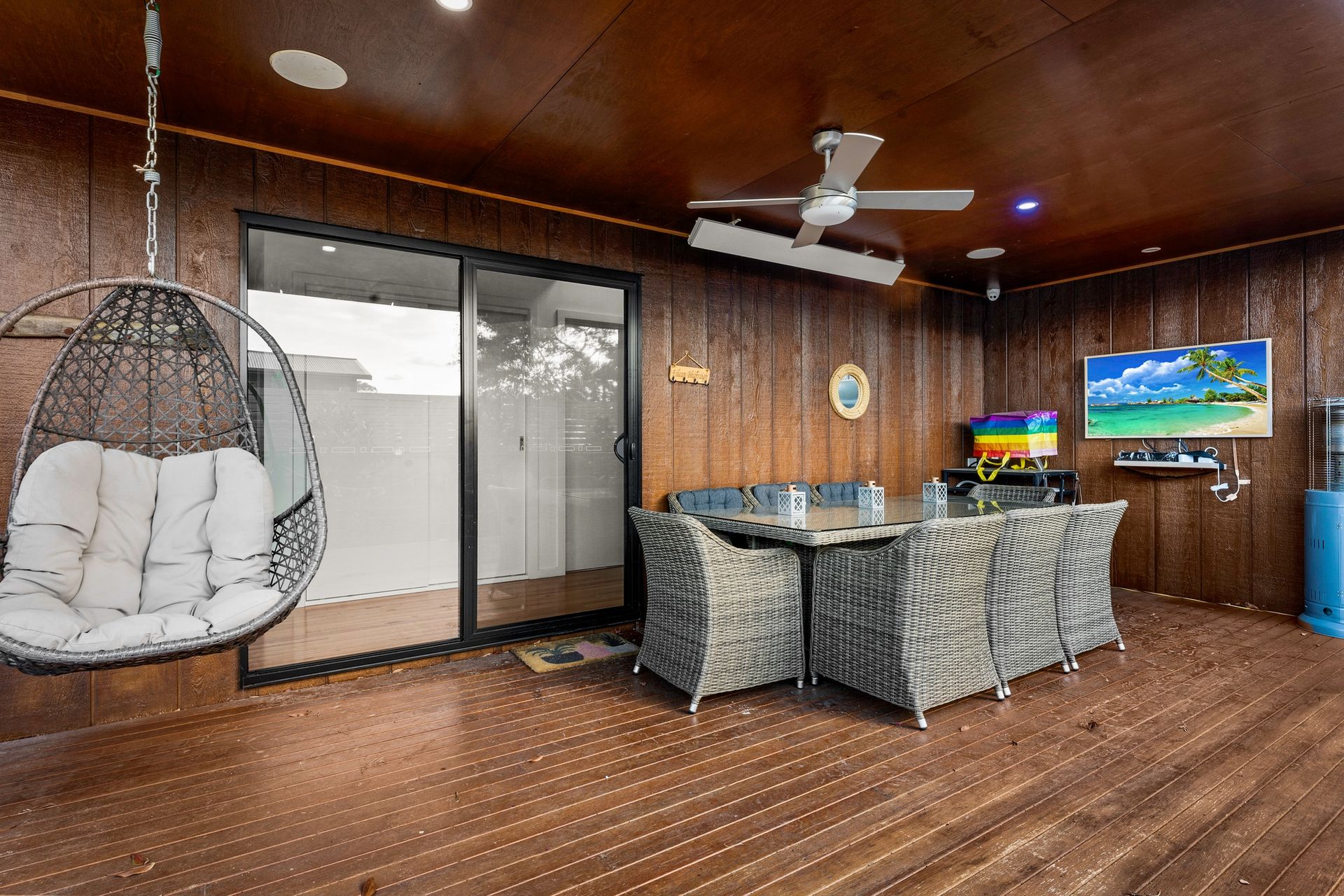 The large double garage (with Wii & smart TV and a second fridge) has internal access into the home as well into the fully enclosed rear yard. The side semi-covered deck (accessed from the central hallway) has a table and seating for 8, wall mounted smart TV, an outdoor heater, ceiling fan and gas BBQ. The covered rear deck provides incredible uninterupted views across westernport bay to the Mornington Pennisula and has a sofa, chair and coffee table.