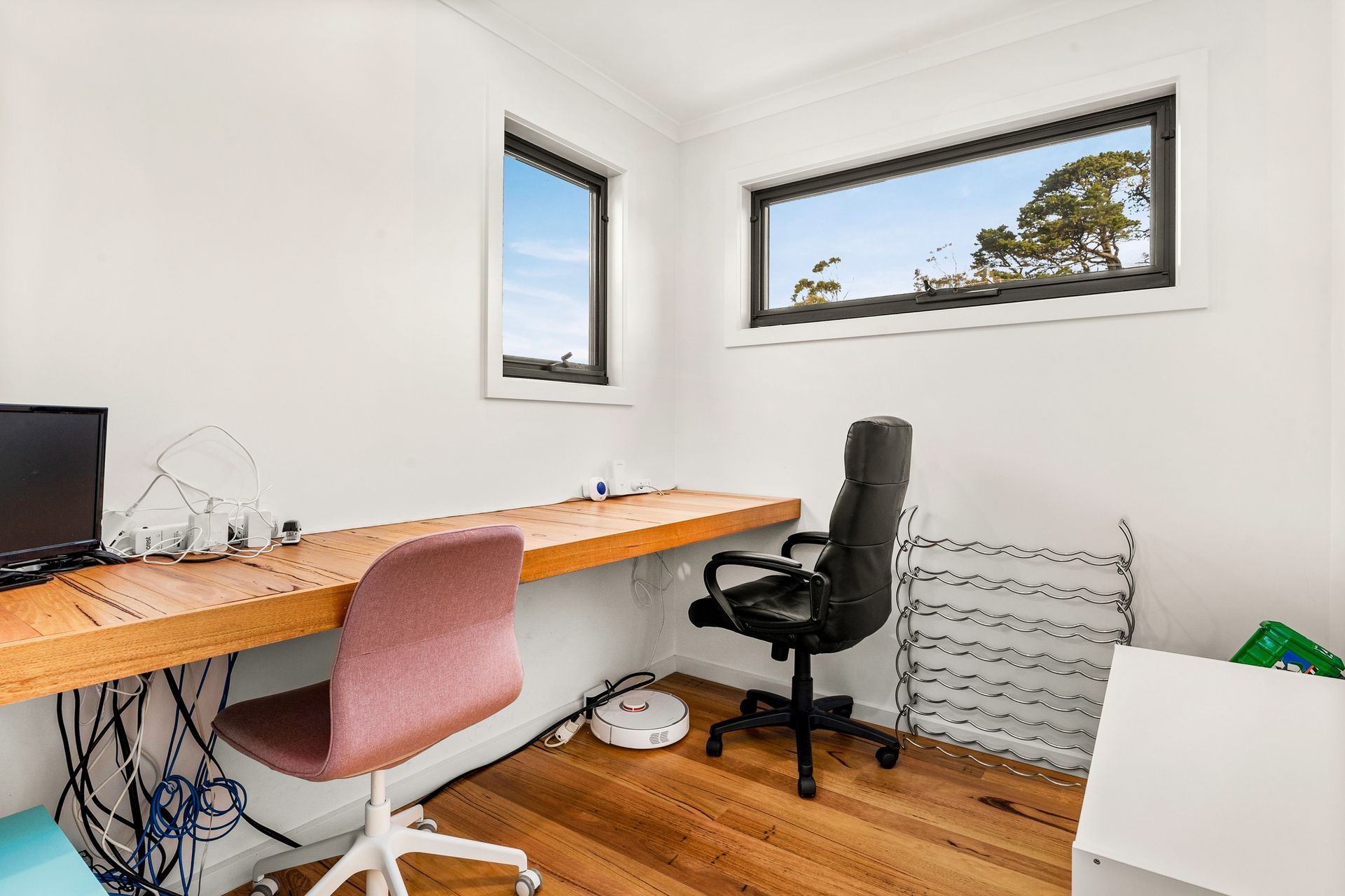 The long central hallway leads from the entrance of the home and provides access to bedrooms 2, 3 and 4 (all with BIR), the main bathroom (with bath & shower), separate toilet, internal entrance to the double garage, a side covered deck and laundry. At the end of the hallway are four steps leading up to the rear open plan kitchen / dining / living room (with coonara style wood heater, smart TV & Sonos sound system plus many games & toys for kids) with an amazing rural outlook, and provides access to the rear covered balcony. The main bedroom has a smart TV, walk through robe and ensuite (with shower and dual entry toilet). Also on this level is a study (with built in desk chairs & toys for kids) and the powder room (which is dual entry with the en-suite).