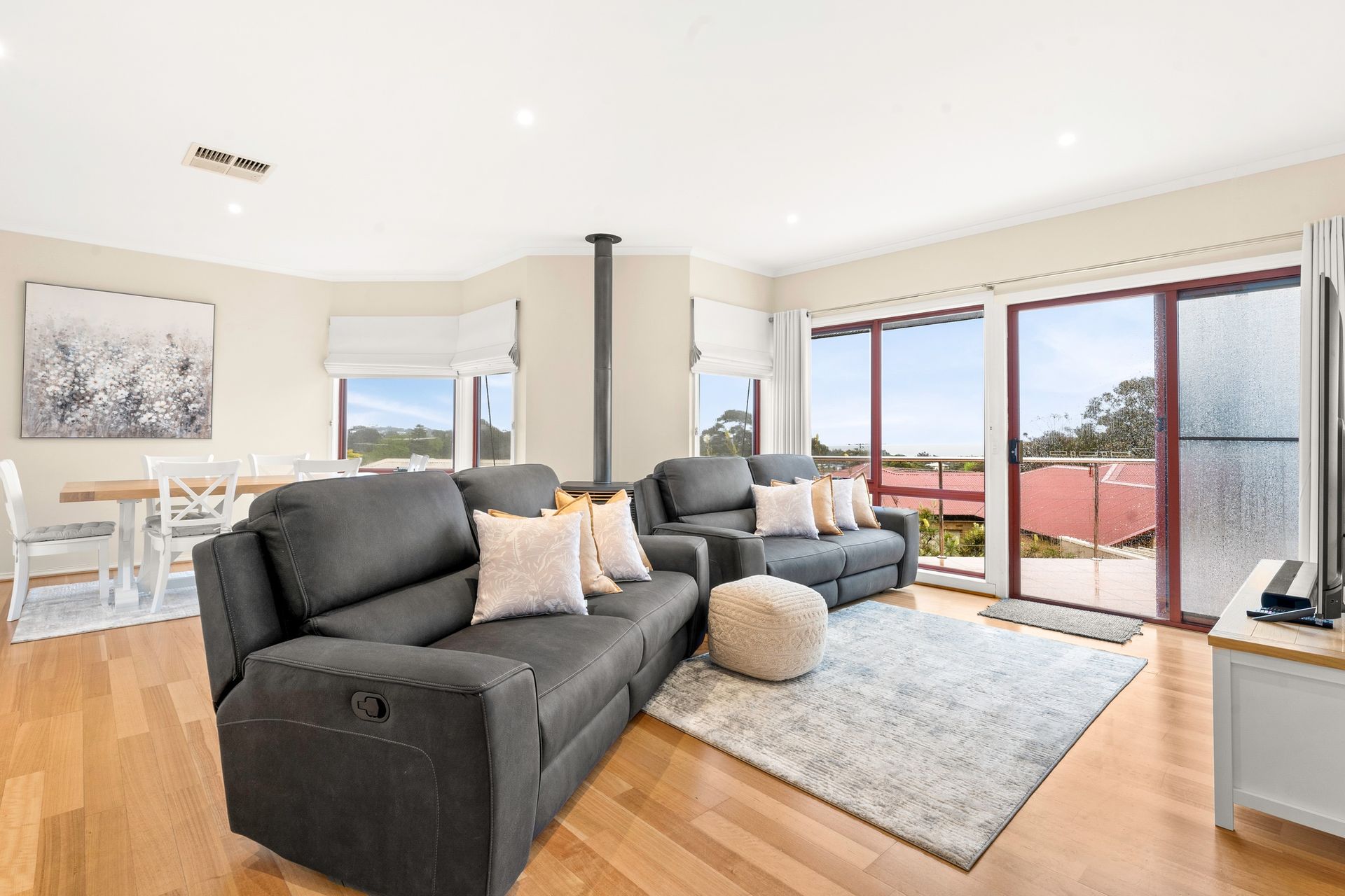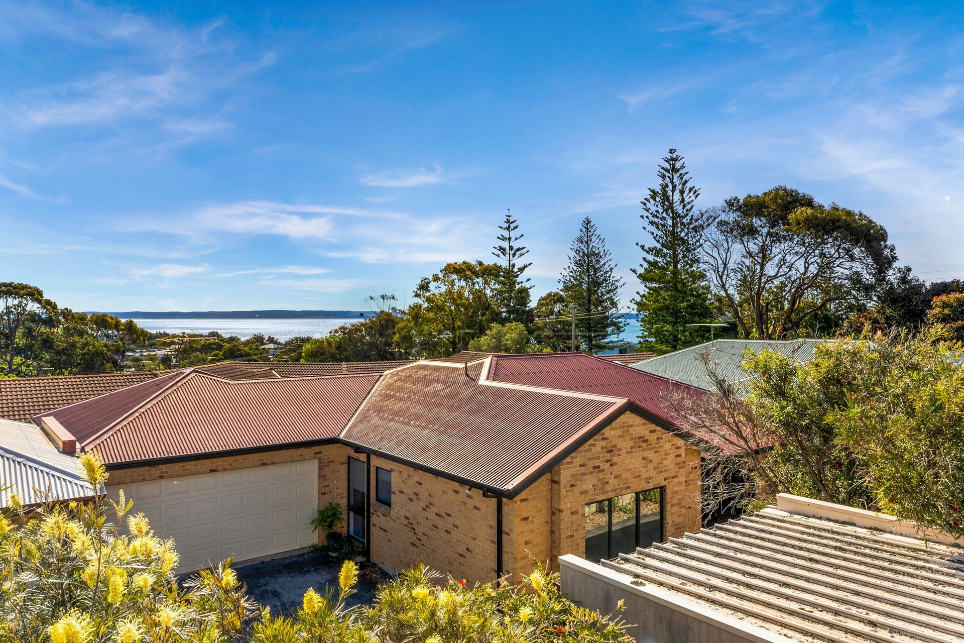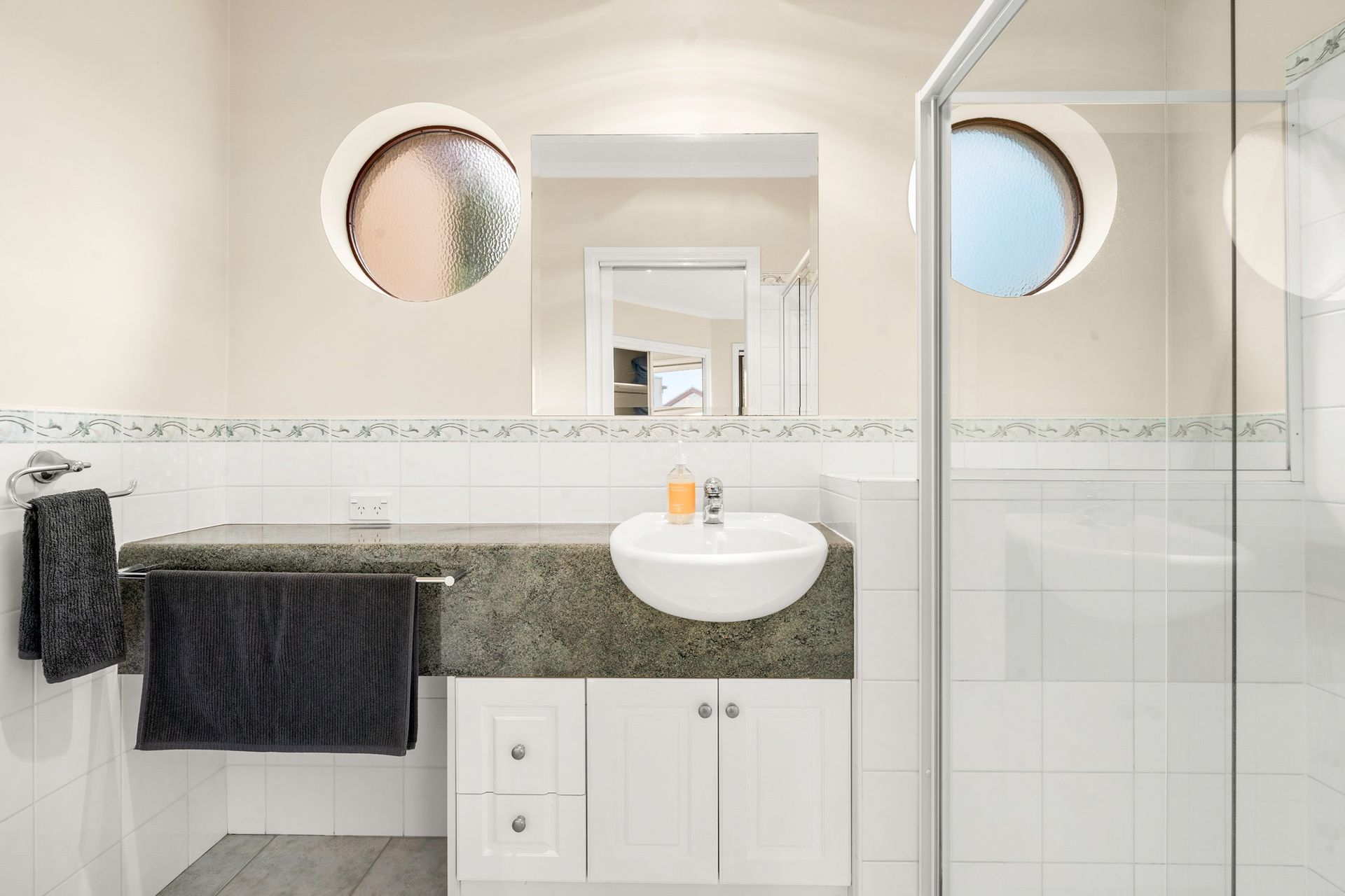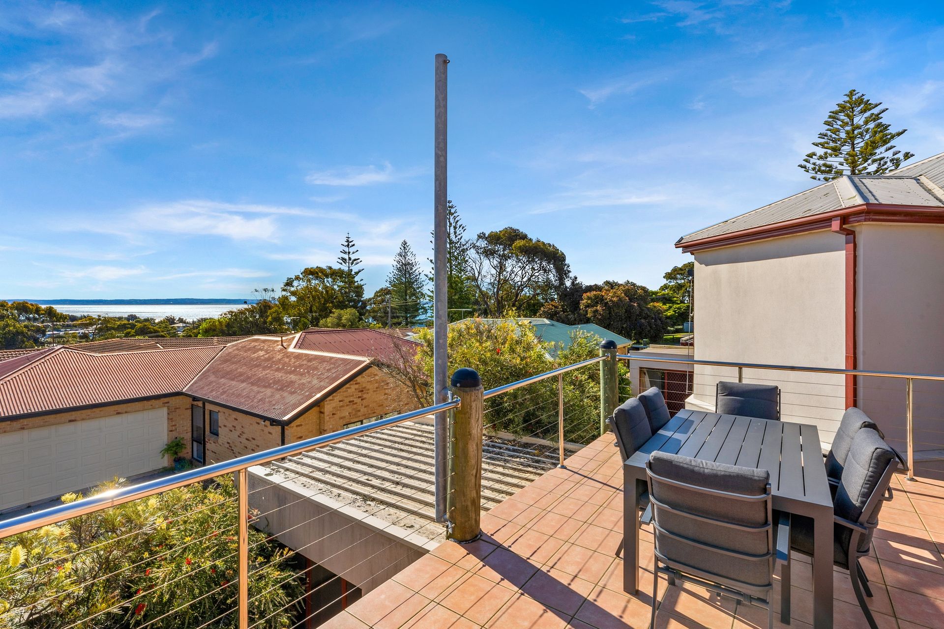 The rear courtyard is fully enclosed, providing the perfect place for kids to play. The upstairs balcony (with gas BBQ & 6-seater outdoor dining table) has delightful bay views. The long single garage (7.5m long, with direct access to the rear yard) provides parking for one car with space for another vehicle in front of the Garage.