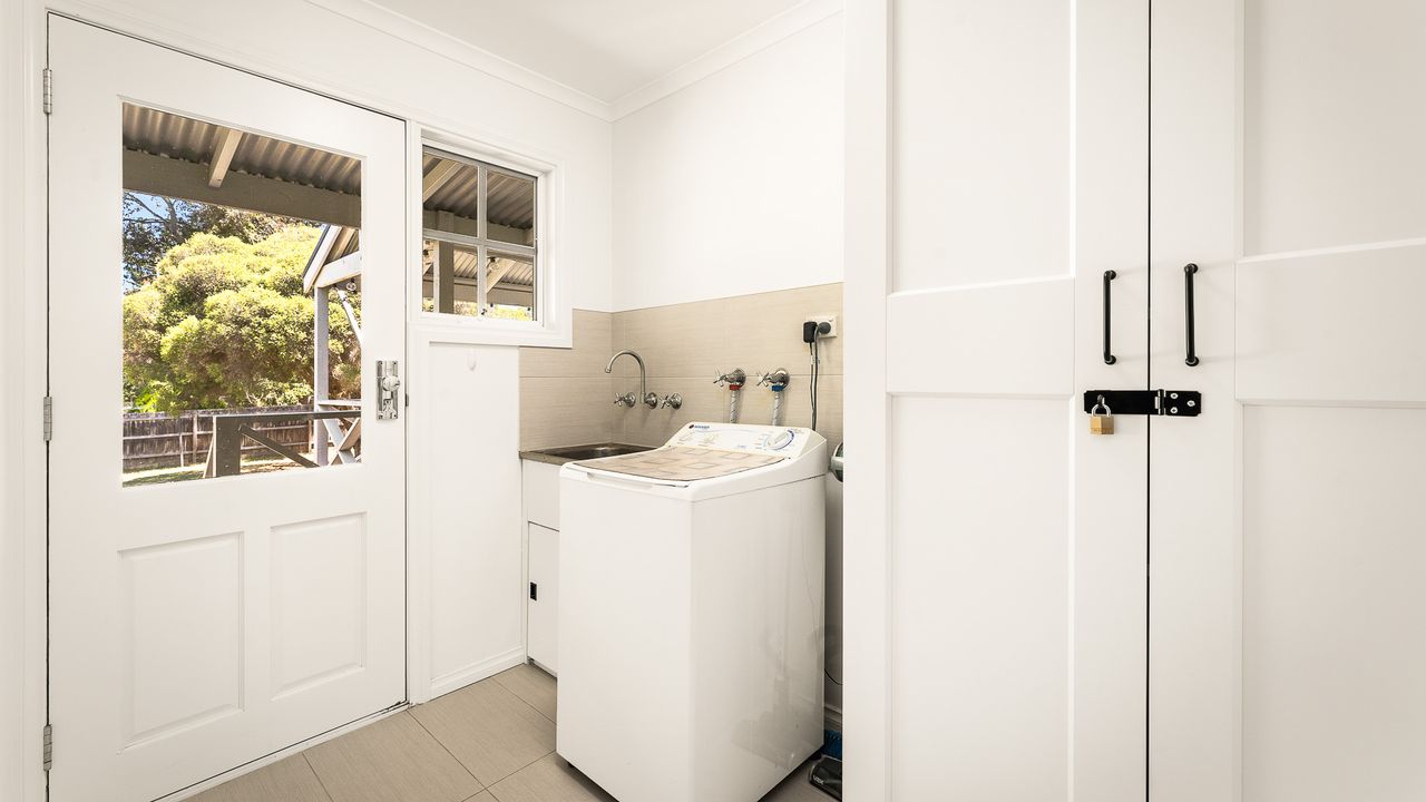 The open plan Kitchen/Dining/Living room (with coonara wood heater, large screen smart TV) provides access to the rear deck and yard. The central hallway leads from the Living room to the fully equipped Laundry (with washing machine & clothes dryer), central Bathroom (with bath, shower and toilet) and a second separate toilet. All three Bedrooms have BIR.