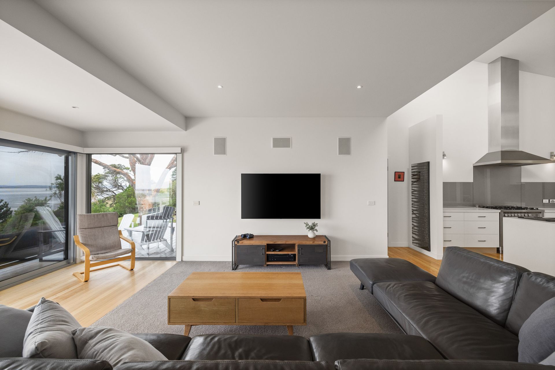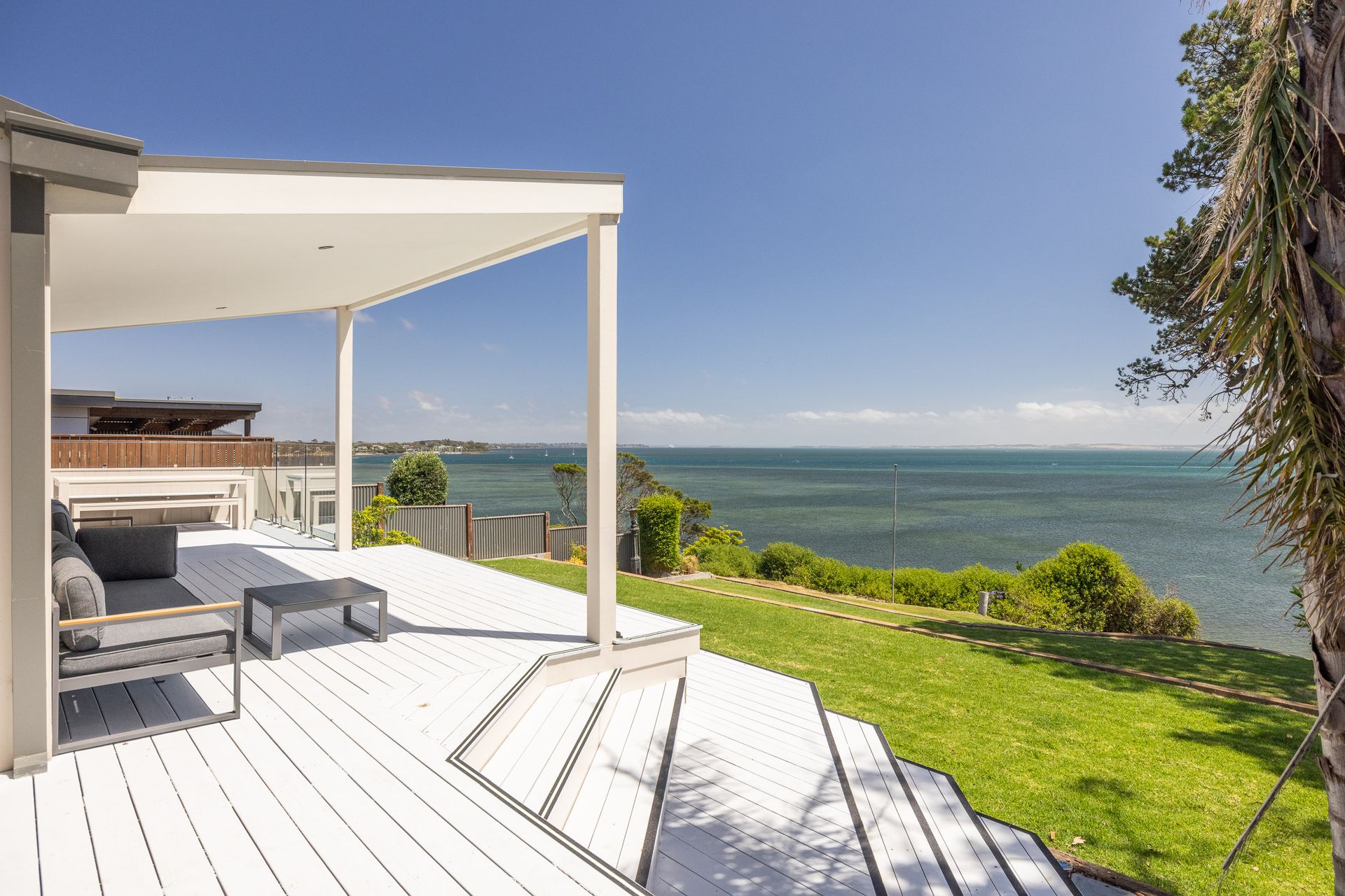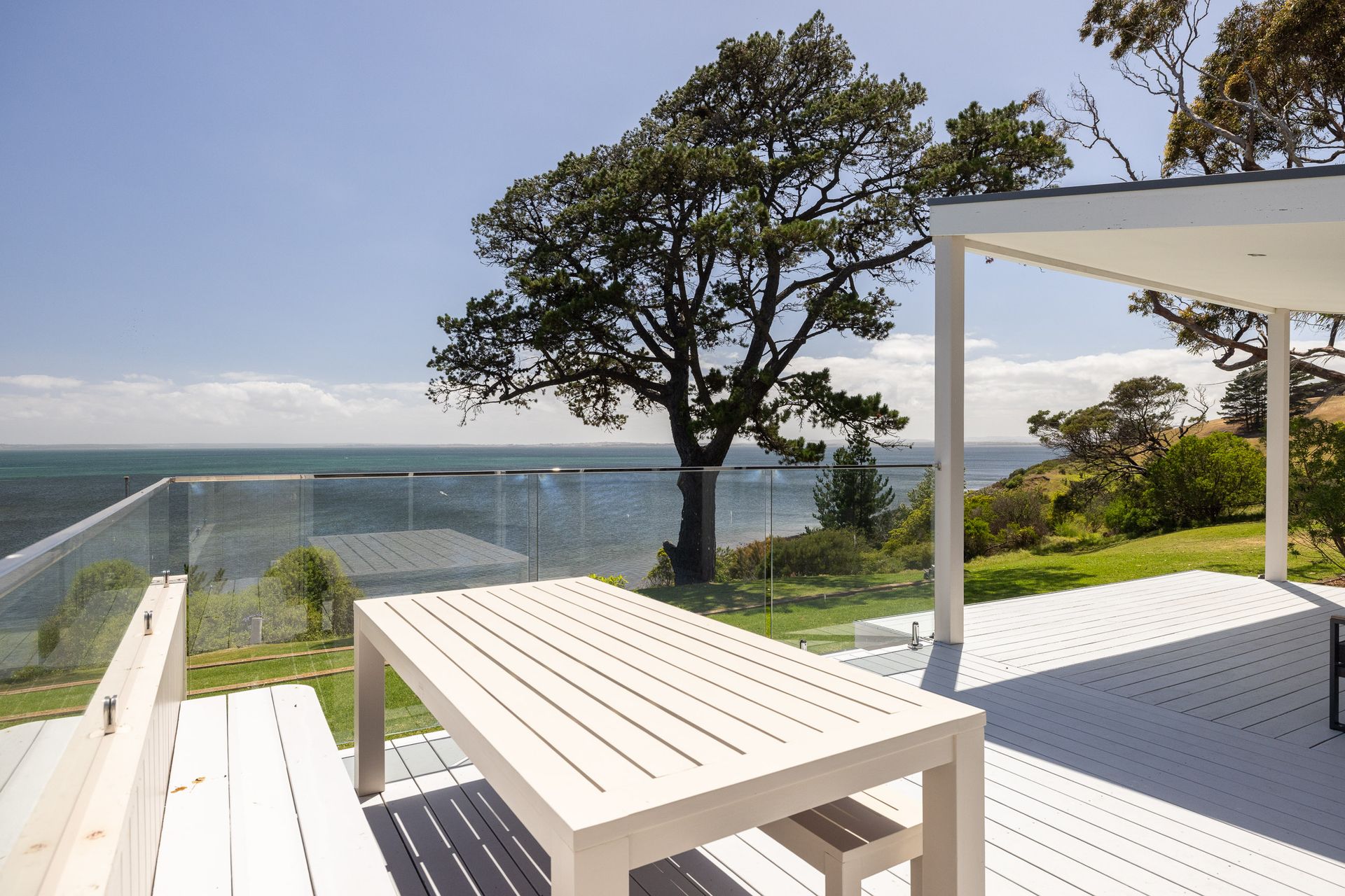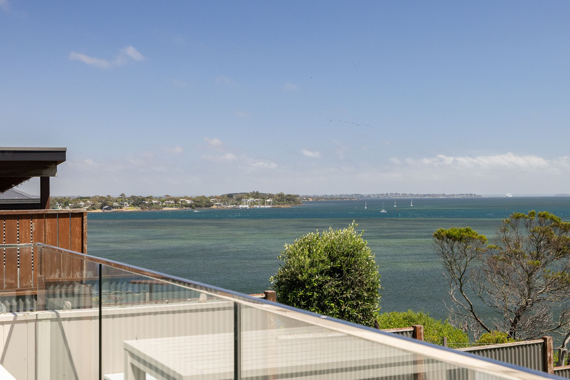 The large semi-covered Deck has incredible water views looking over French Island National Park. The double Garage (with table tennis table and couches) Is not for parking, however there is space for 3 vehicles (cars and/or a boat) in front of the Garage in the driveway. The closest swimming beach is a four minute drive away.