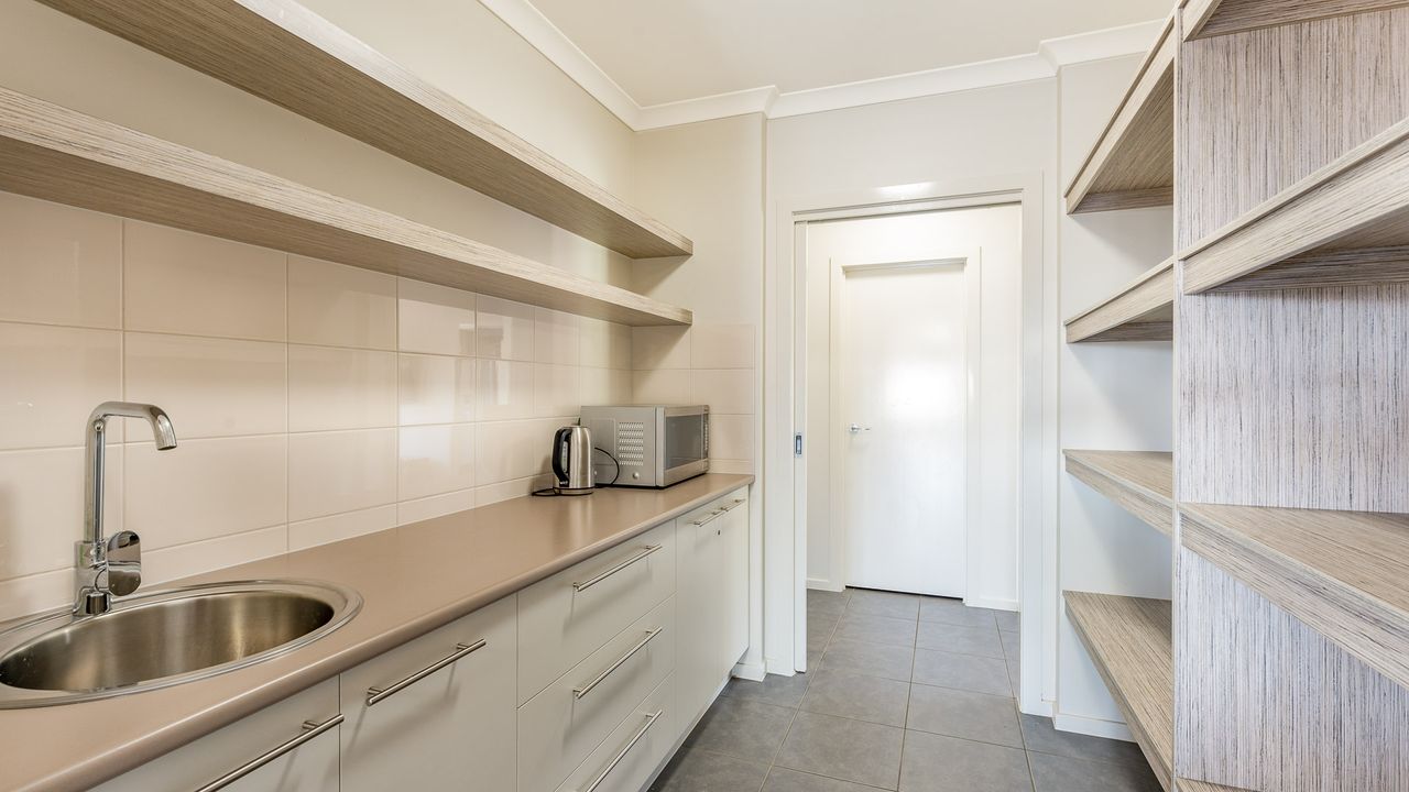 The fully appointed kitchen is equipped with cooking utensils, crockery, cutlery, microwave, toaster, kettle, etc, plus a double sink, large walk-through pantry, fridge, dishwasher, electric oven and gas cook top.