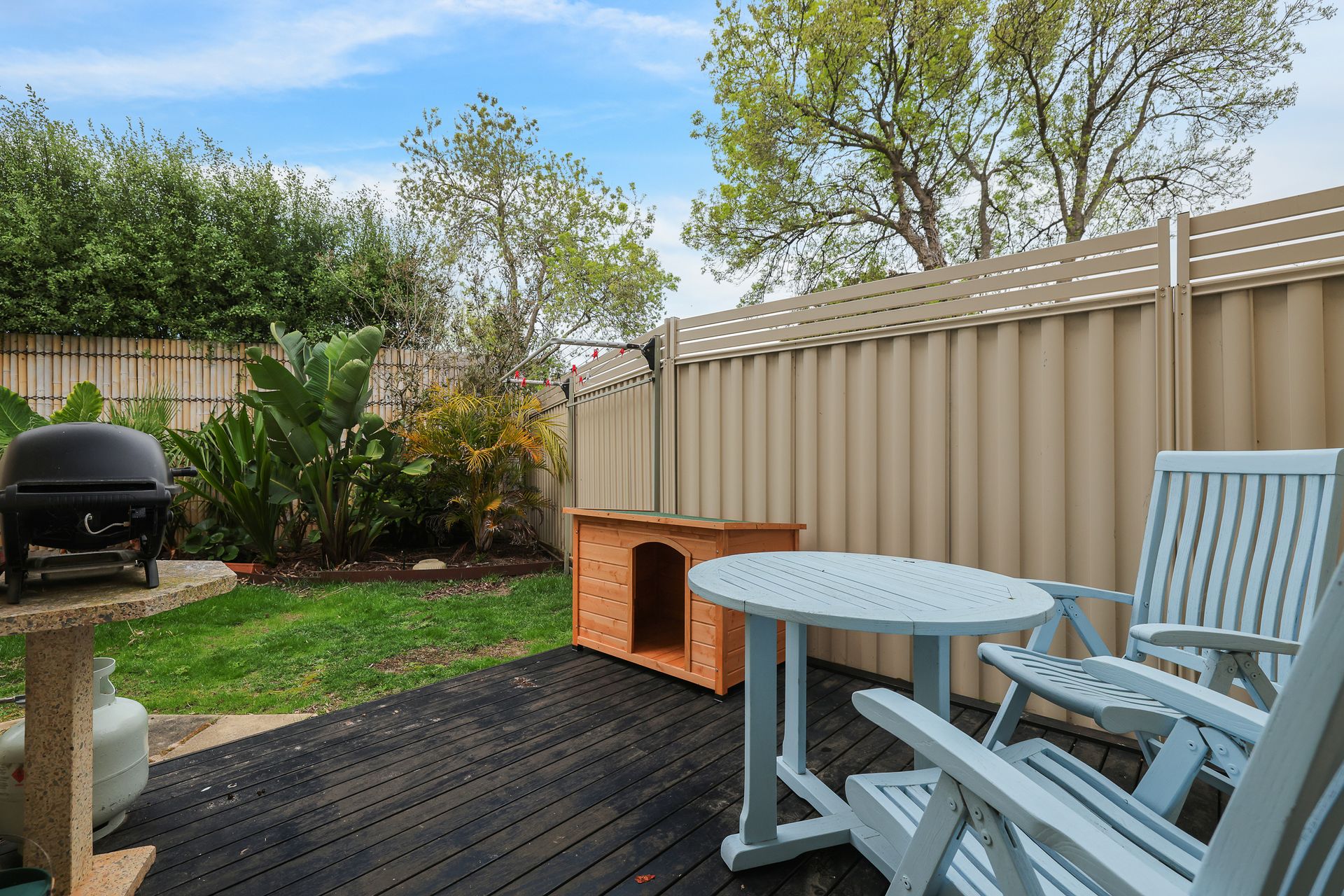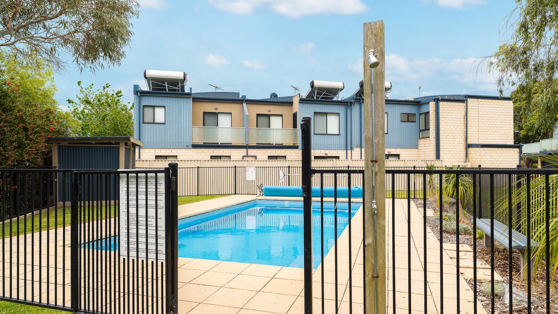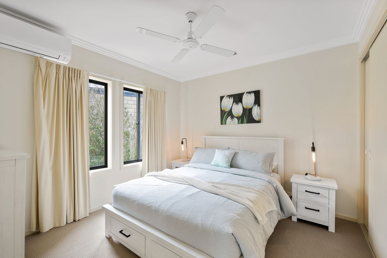 The ground floor Deck & Patio (with 4 seater table & 2 recliners) overlooks the grassy fully enclosed rear courtyard with dog kennel (please note, smaller dogs would be more suited to this space). The upstairs Balcony (with sunshade awning, gas BBQ, 6 chairs & 2 recliners) overlooks the shared facilities, including a solar-heated in-ground pool and shady communal BBQ area. There is a Double Garage (with foldup table tennis table & internal access to the home) that accommodates 2 cars plus some additional communal parking spots which are available on a first-come, first-served basis.