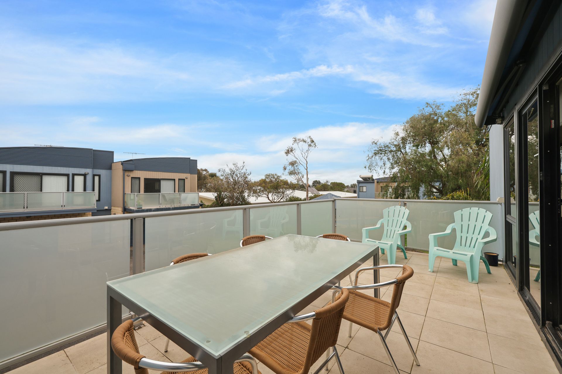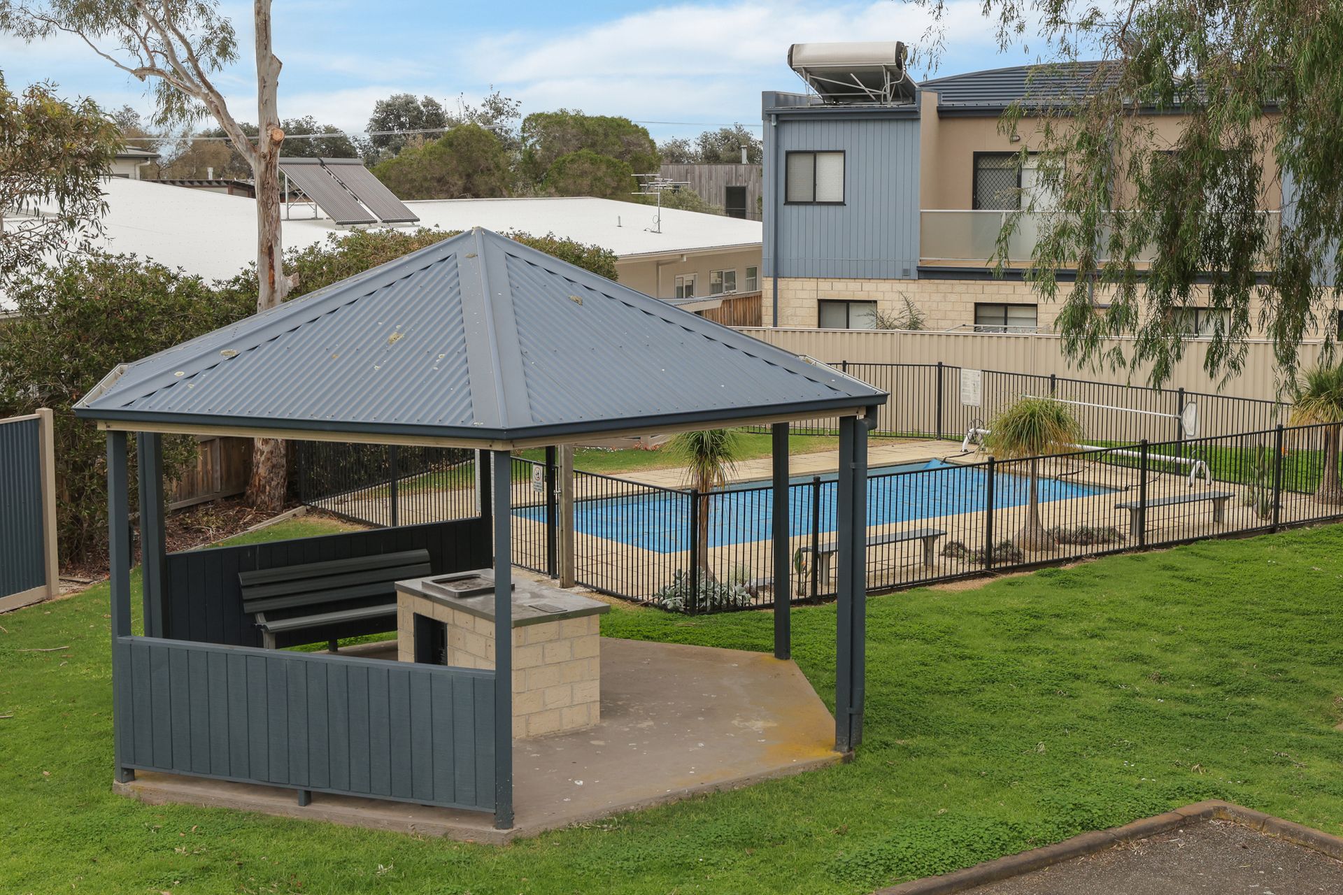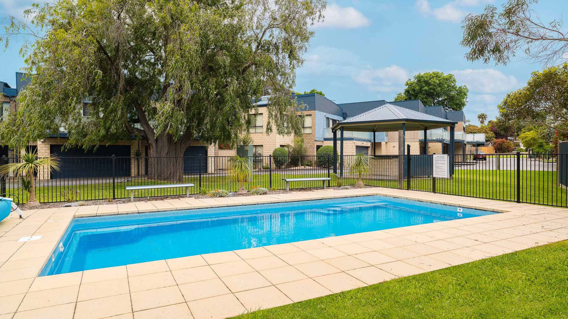The ground floor Deck & Patio (with 4 seater table & 2 recliners) overlooks the grassy fully enclosed rear courtyard with dog kennel (please note, smaller dogs would be more suited to this space). The upstairs Balcony (with sunshade awning, gas BBQ, 6 chairs & 2 recliners) overlooks the shared facilities, including a solar-heated in-ground pool and shady communal BBQ area. There is a Double Garage (with foldup table tennis table & internal access to the home) that accommodates 2 cars plus some additional communal parking spots which are available on a first-come, first-served basis.