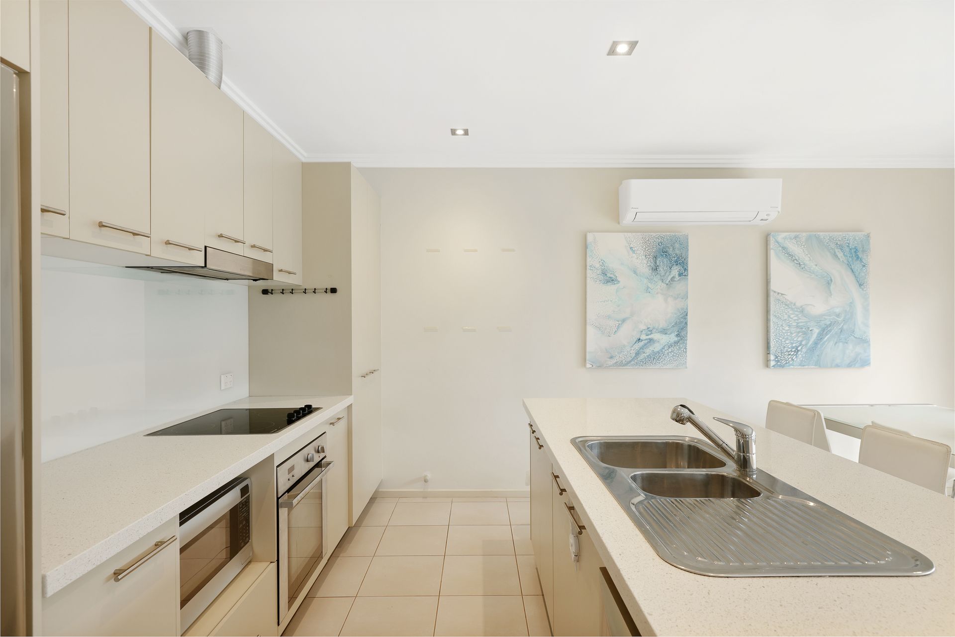 The fully appointed kitchen is equipped with cooking utensils, crockery, cutlery, microwave, Nespresso pod coffee machine, toaster, kettle, etc. plus a double sink, fridge, dishwasher, electric oven and induction cook top.