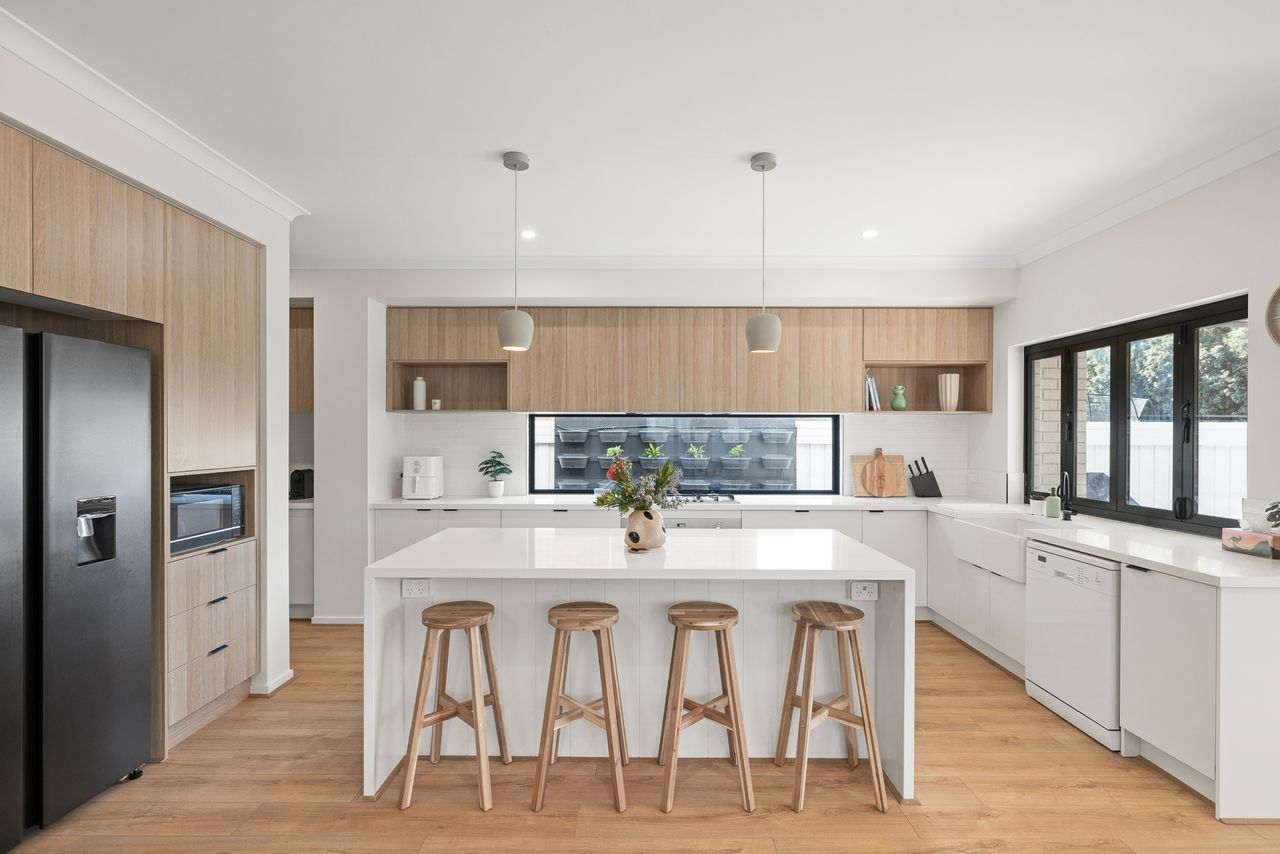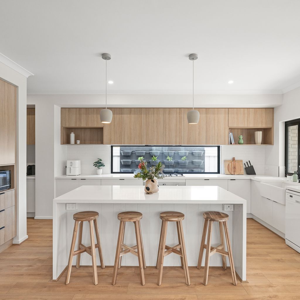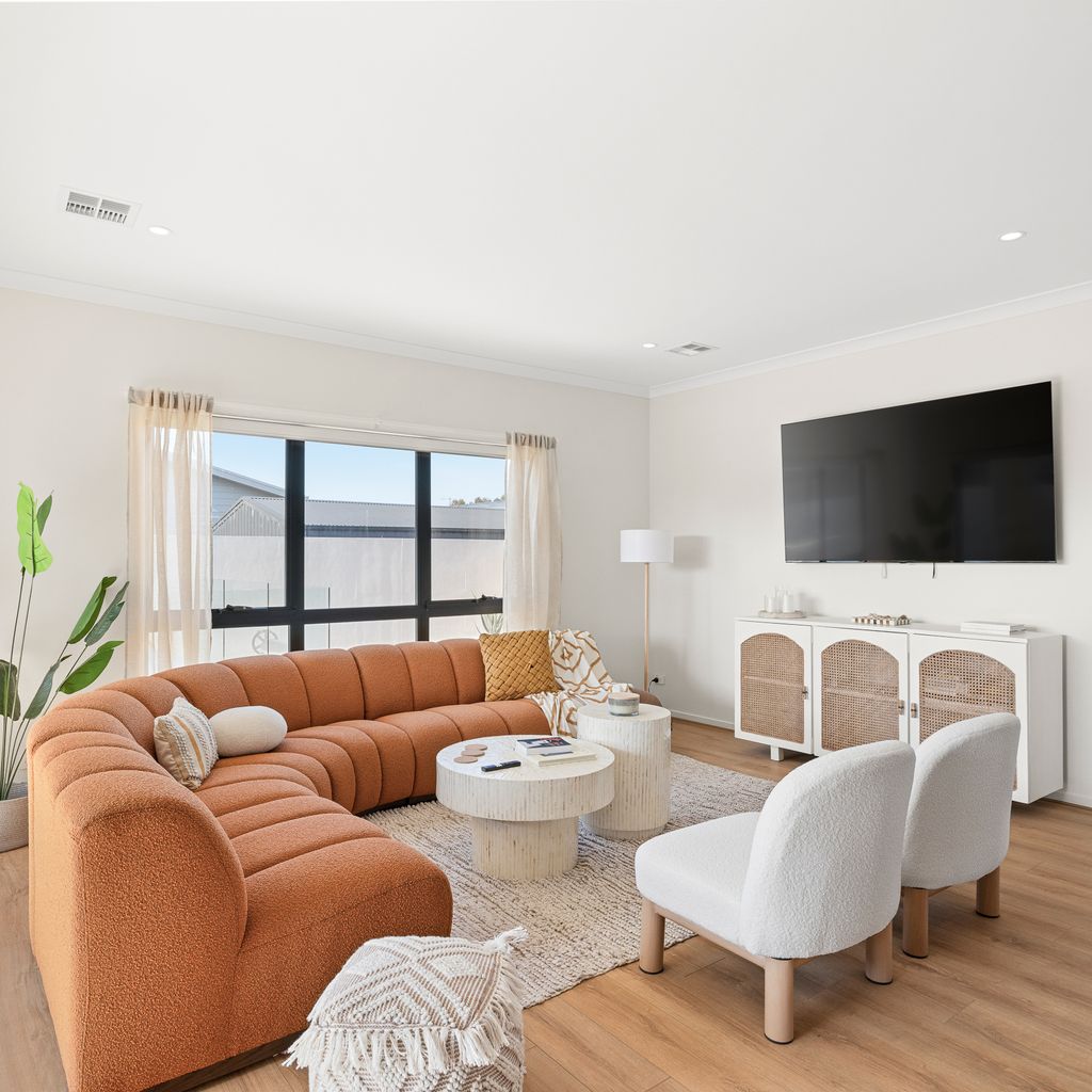 A central hallway provides access to Bedroom 5, a dual access Bathroom (with shower & toilet), a fully equipped Laundry (with washing machine & clothes dryer) and internal access to the Double Garage. At the rear of the home is the huge open plan Kitchen (with butlers pantry with all mod cons) Dining/Living Room (with 70" smart TV) with bi-fold windows overlooking the pool area, and opening up to the Alfresco entertaining area.