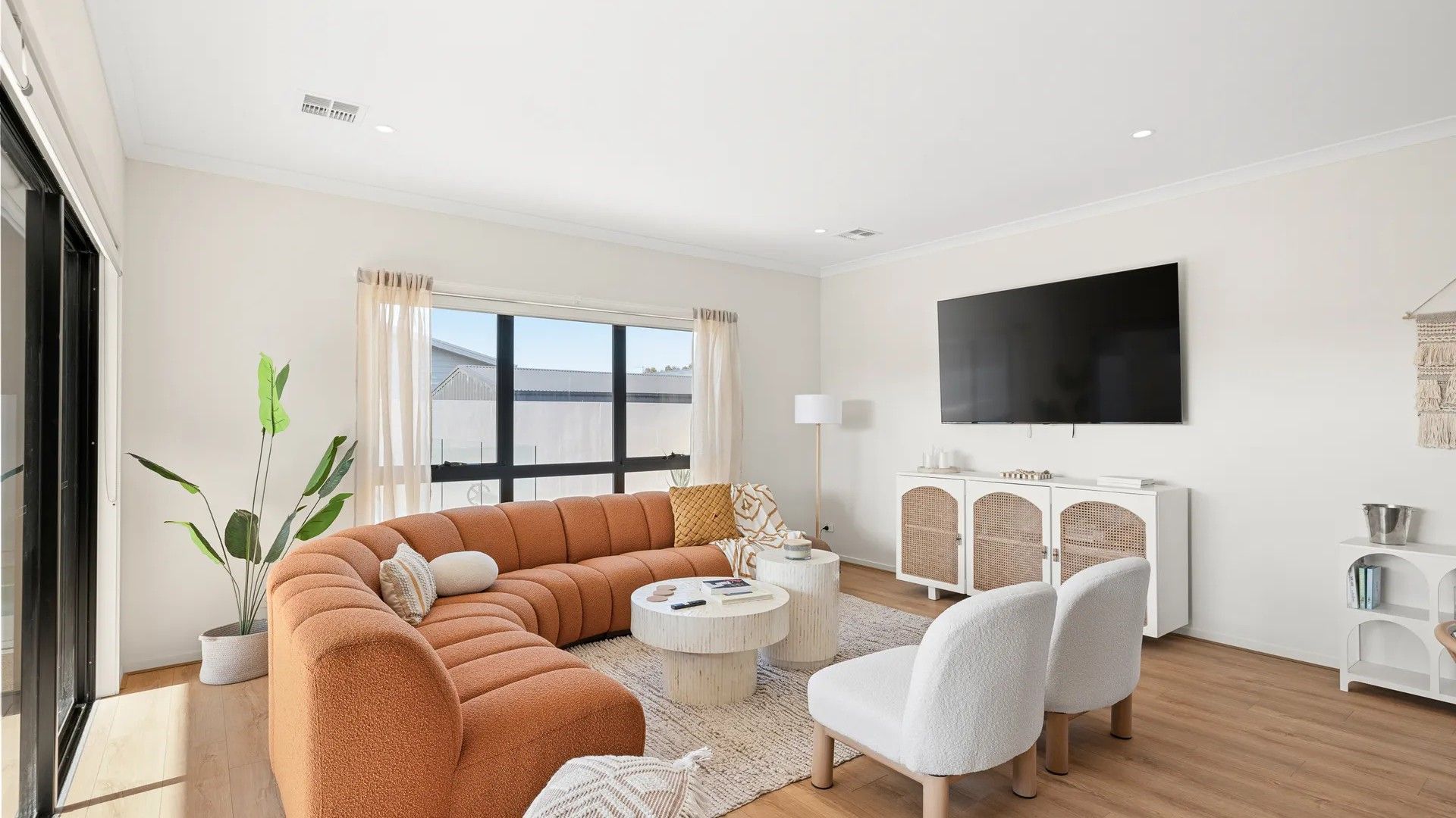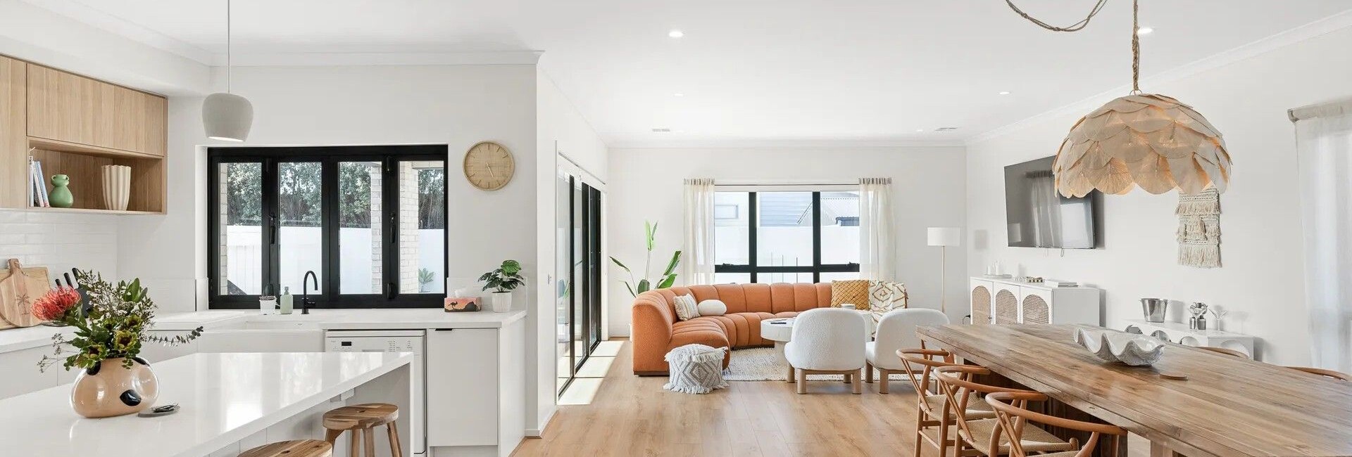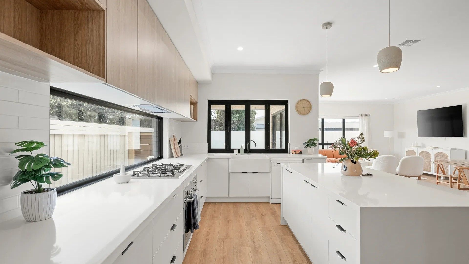 A central hallway provides access to Bedroom 5, a dual access Bathroom (with shower & toilet), a fully equipped Laundry (with washing machine & clothes dryer) and internal access to the Double Garage. At the rear of the home is the huge open plan Kitchen (with butlers pantry with all mod cons) Dining/Living Room (with 70" smart TV) with bi-fold windows overlooking the pool area, and opening up to the Alfresco entertaining area.
