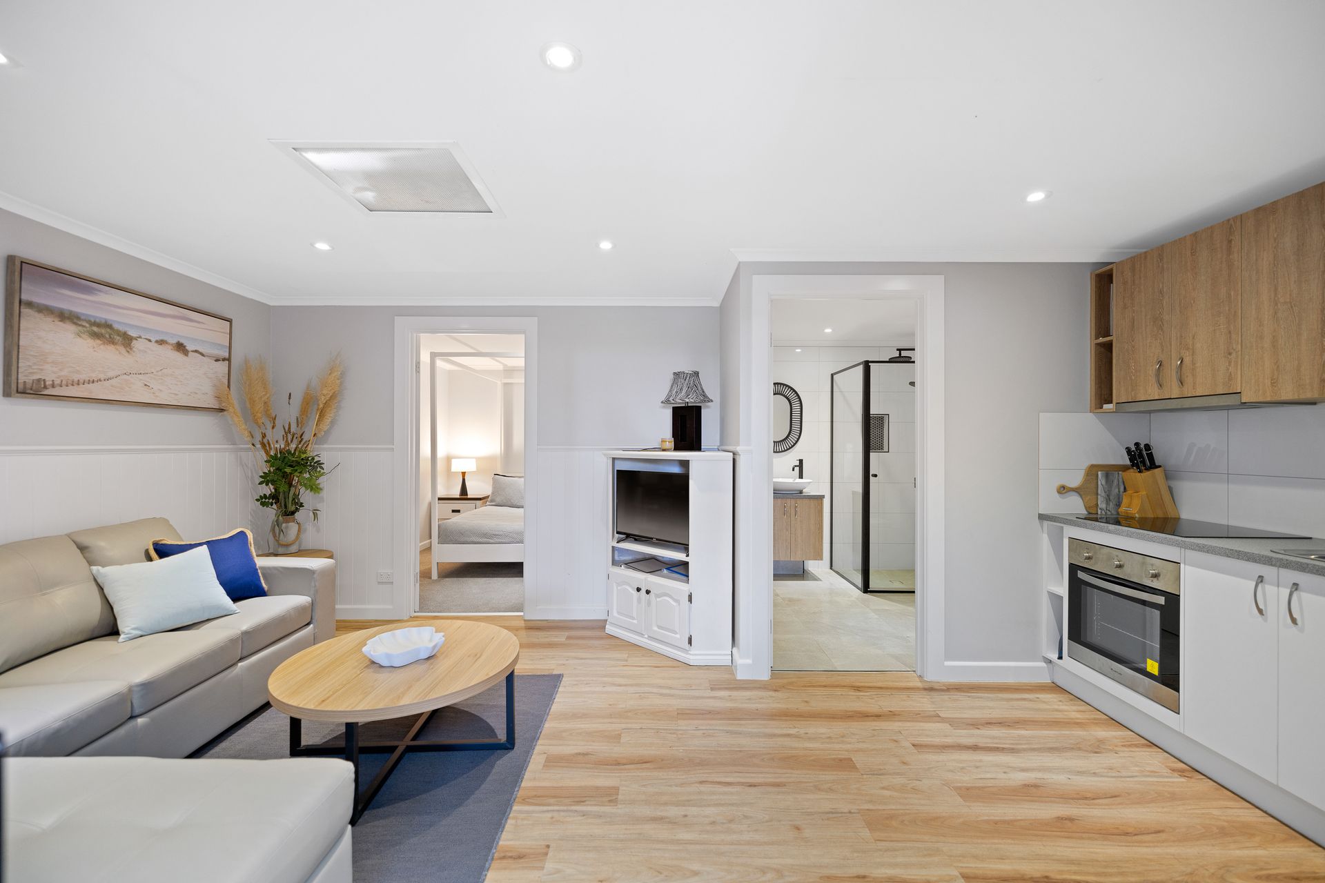 Upstairs is the enormous Bedroom 3/Retreat (with BIR & smart TV), a separate Kitchenette (with sink, bar fridge & kettle) and an ensuite (with shower & toilet). Sliding doors open to a balcony with ocean views.