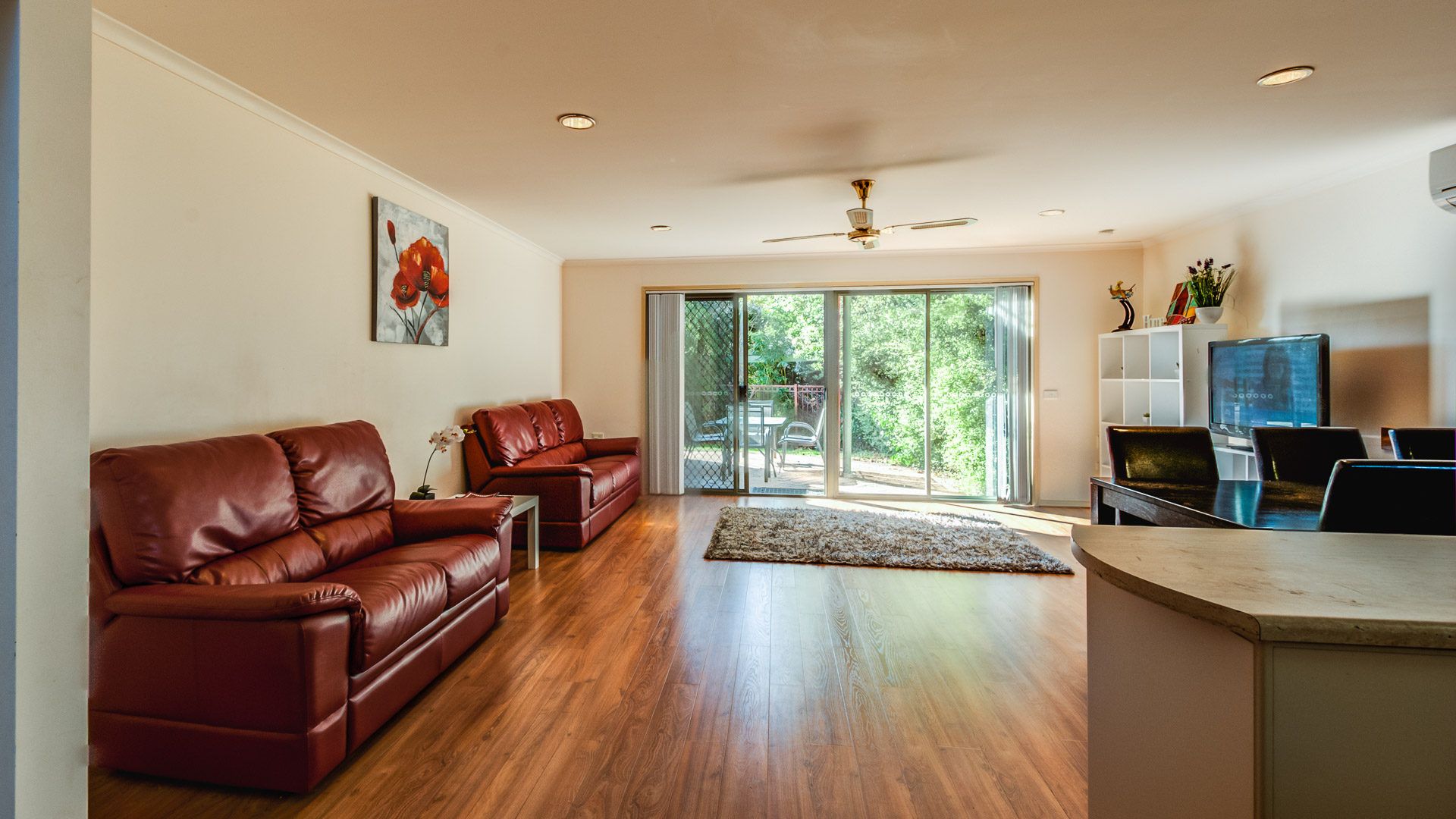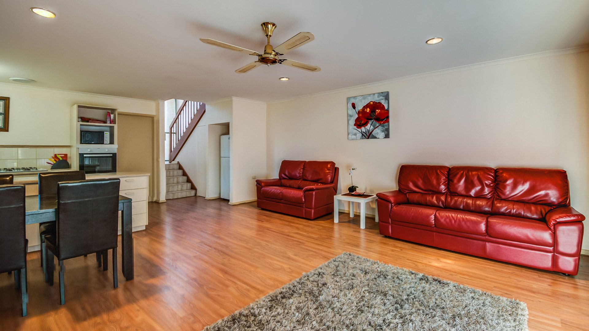 Downstairs is the open plan Kitchen/Dining/Living area (with TV and DVD player) opening onto a delightful patio. There is a combined Bathroom/fully equipped Laundry (with shower, toilet, washing machine & clothes dryer). A section of the Garage has been tastefully converted into a multipurpose Living Room (with smart TV, couch & desk) - perfect for working remotely. Upstairs is Bedroom 1 which features a TV, BIR and balcony, Bedrooms 2 and 3 (each with BIR) and a Bathroom (with shower over spa bath & toilet).