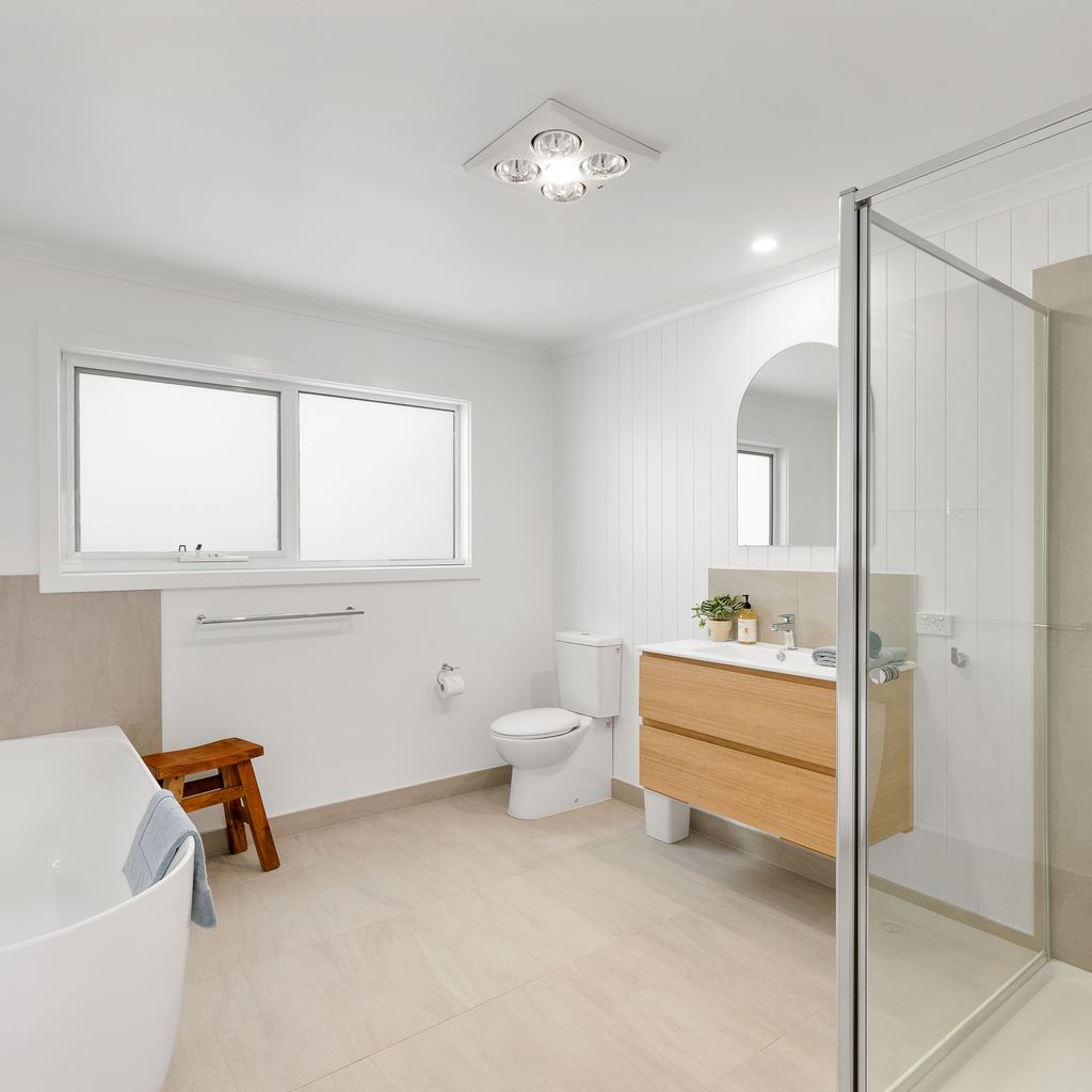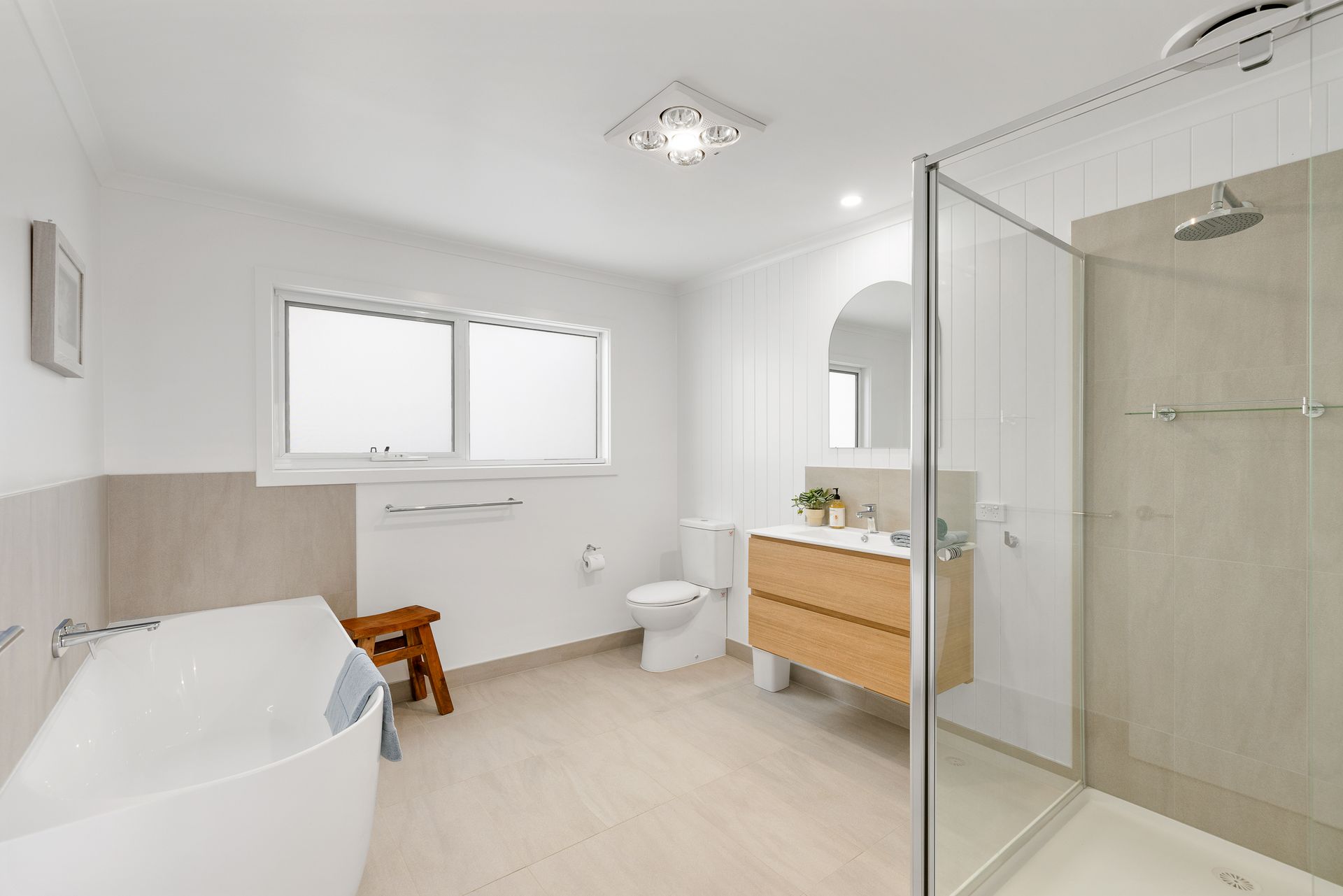 There are four wall mounted reverse cycle air-conditioners in the home; one each in the downstairs Lounge room, the upstairs Lounge Room and Bedrooms 1 and 5 and all three bathrooms have heat lamps.