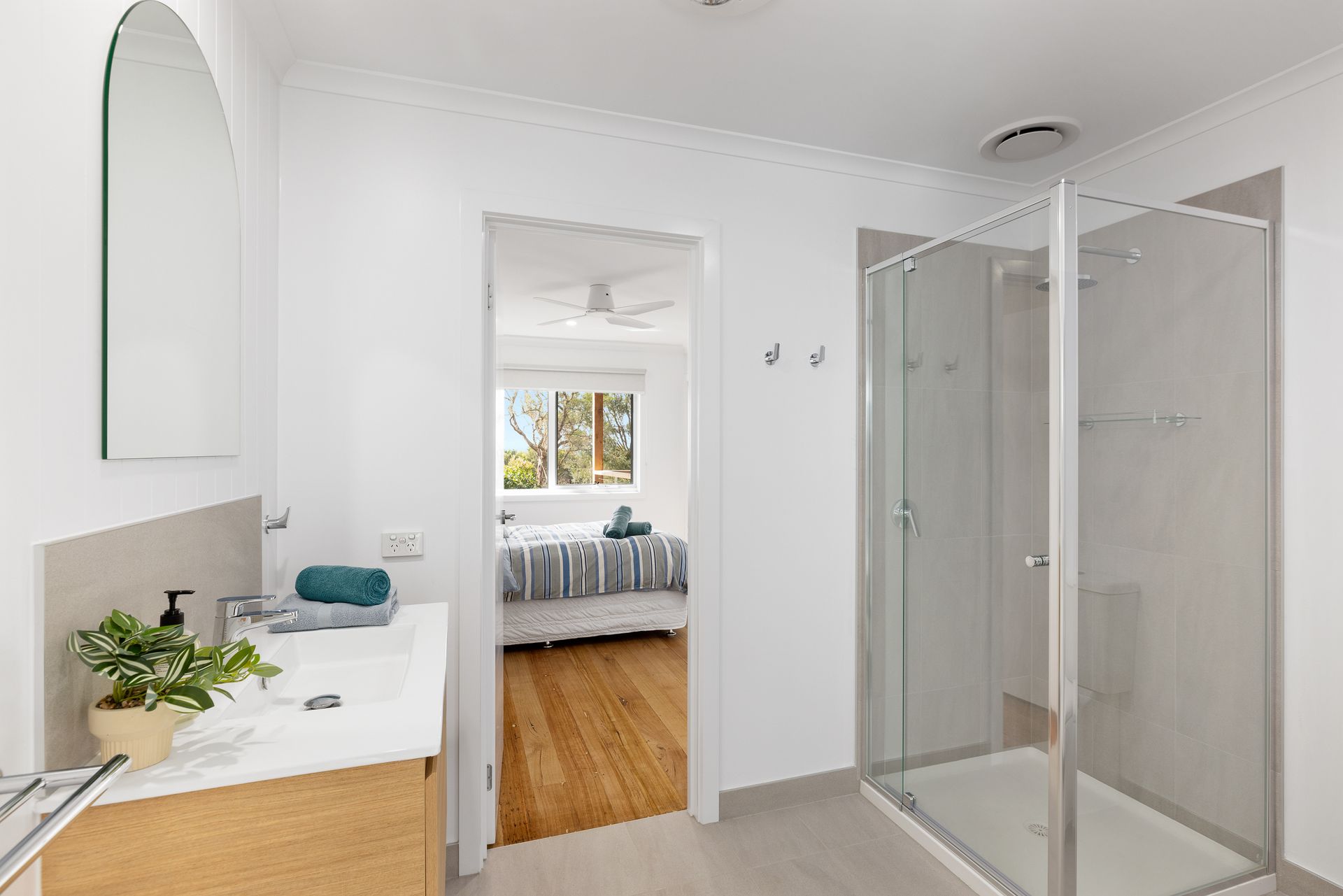 Downstairs is the large central Lounge Room (with 55" smart TV, DVD player and small library of movies) that provides access to Bedrooms 2 & 3 (each with BIR), a central Bathroom (with bath, shower & toilet), Bedroom 4 with BIR and dual-access ensuite (with shower & toilet) and a short hallway to Bedroom 5. The Lounge also provides access to the rear ground floor Deck and views to the water.