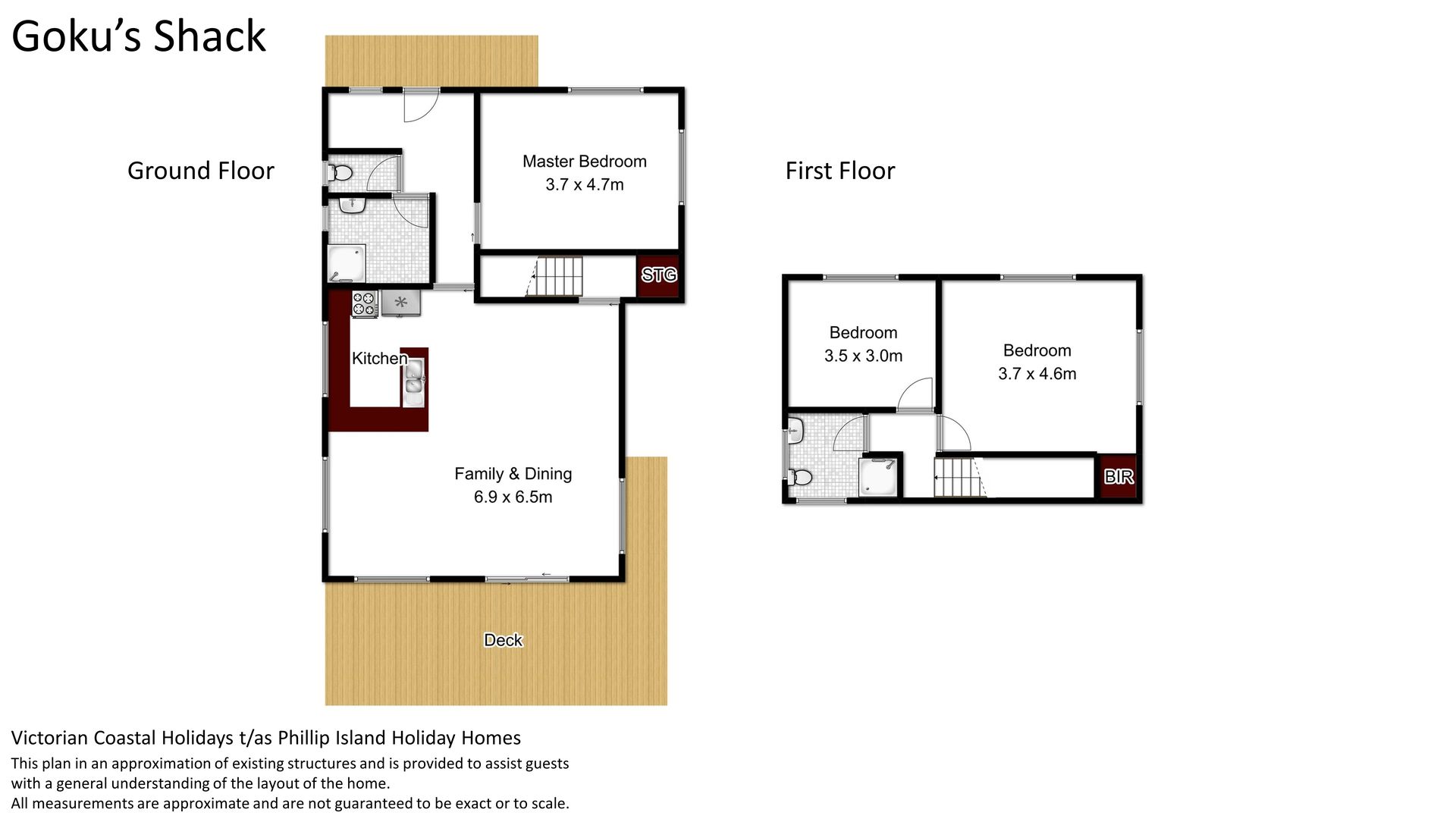 Downstairs is the Master bedroom, bathroom (with shower) and separate toilet, plus open plan kitchen/dining/living room (with coonara-style wood heater, large smart TV and a Chromecast) that leads out to the large deck. Upstairs are two bedrooms (Bedroom 3 has a TV) and Bedroom 2 (with a small BIR) plus a second bathroom (with shower and toilet).