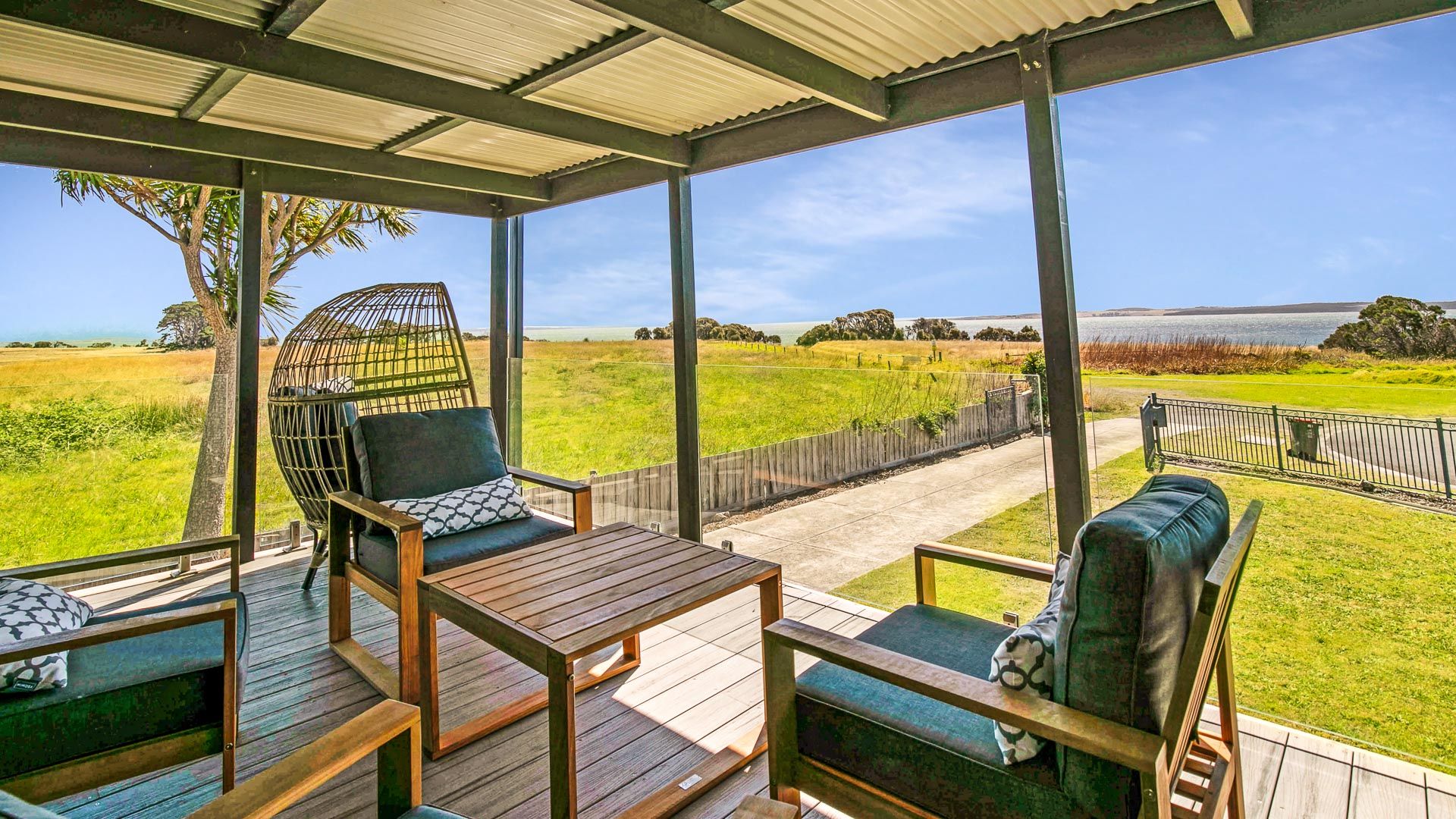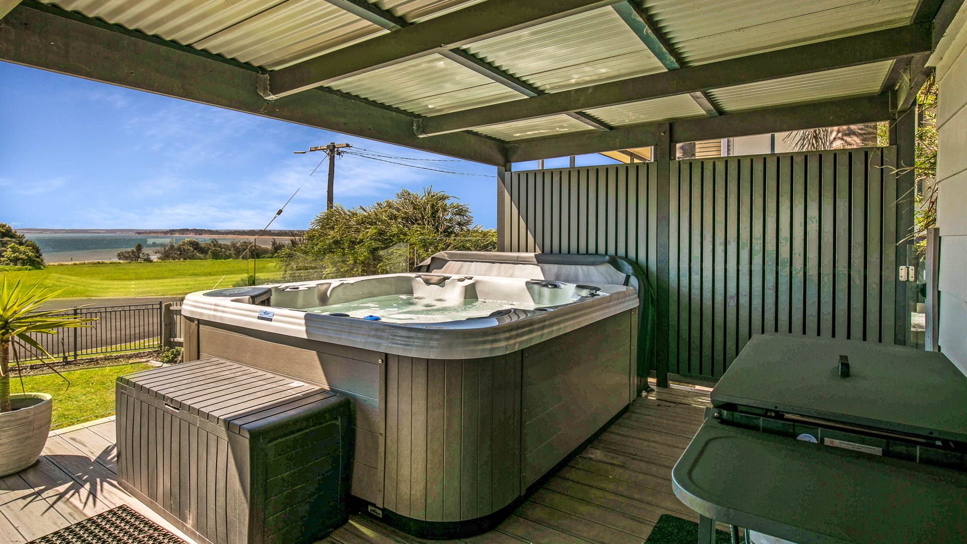 The large covered deck with BBQ features the home's star attraction - a 6-seater electric heated spa with uninterrupted views of the rural landscape, Phillip Island, French Island and Westernport Bay. Goku's Shack is listed as pet friendly but please note that the front fence would probably allow small dogs to escape. The long driveway and carport provides parking space for up to 4 vehicles (cars and/or a boat).