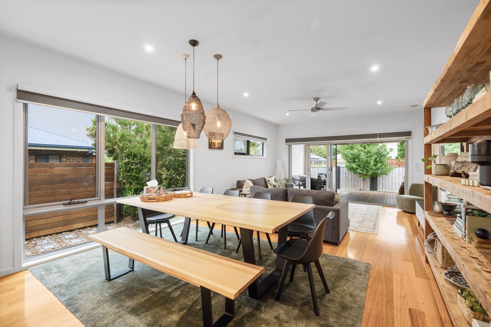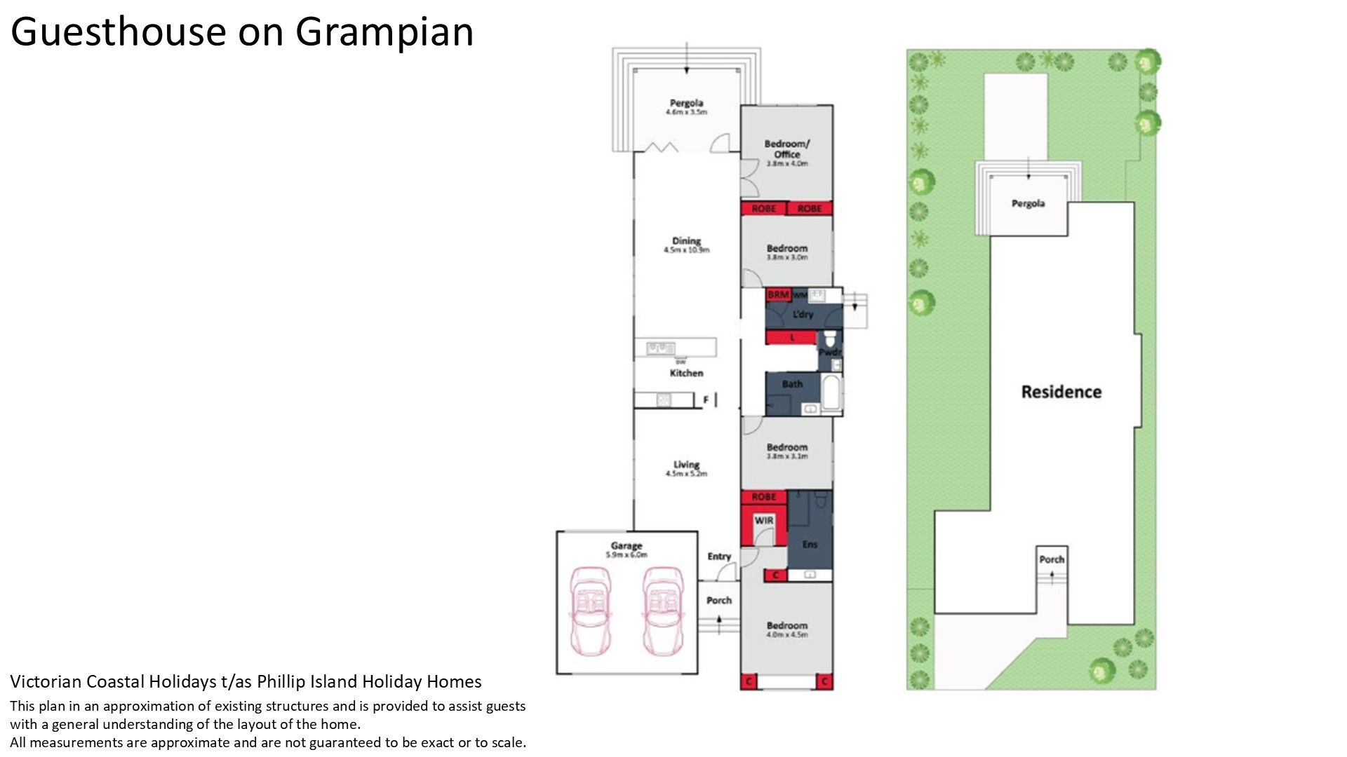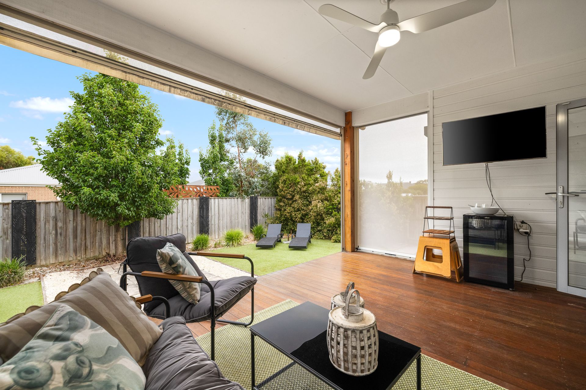 Entry to the home is via the front Porch, leading into the front Living room (with 55" Smart TV, books and a selection of card & board games), which flows through to the central open plan Kitchen/Dining and rear Living area (with 65" Smart TV) and opens directly out to the rear Pergola enhancing the indoor–outdoor connection. Bedroom 1 is accessed from the front Living room and features a WIR and ensuite (with shower & toilet). A central hallway provides access to Bedrooms 2 and 3 (each with BIR), which are serviced by the main Bathroom (with bath and shower) a separate Toilet and a fully equipped Laundry (with washing machine and clothes dryer - located in the Garage) with external access. Bedroom 4 (with BIR) is accessed from the rear Living Area.