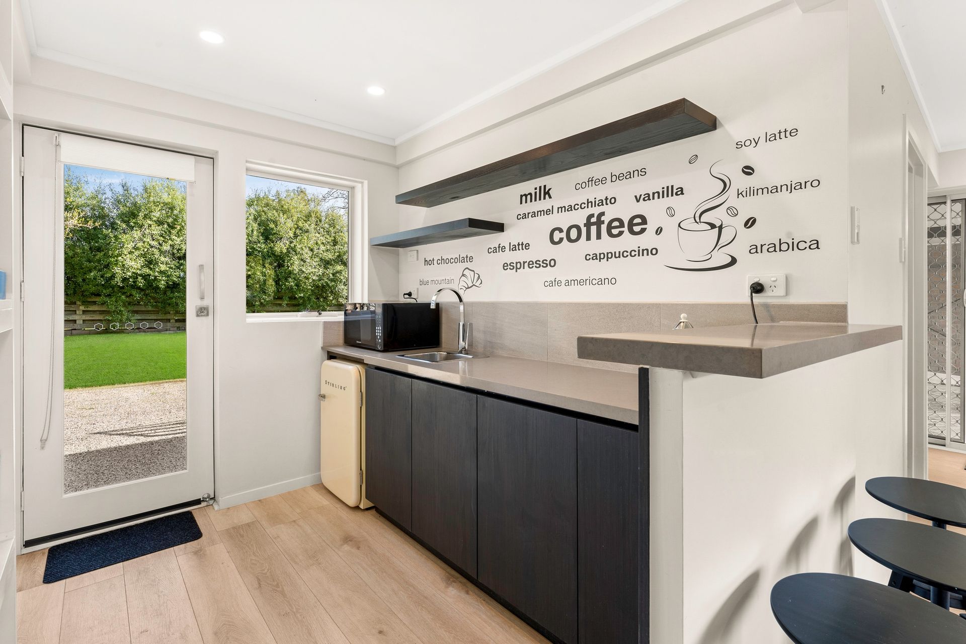 The fully appointed upstairs kitchen is equipped with cooking utensils, crockery, cutlery, microwave, a Nespresso pod coffee machine, toaster, kettle, etc. plus a double sink, fridge (and a 2nd bar fridge in the kitchenette downstairs), dishwasher, electric oven with gas cook top.