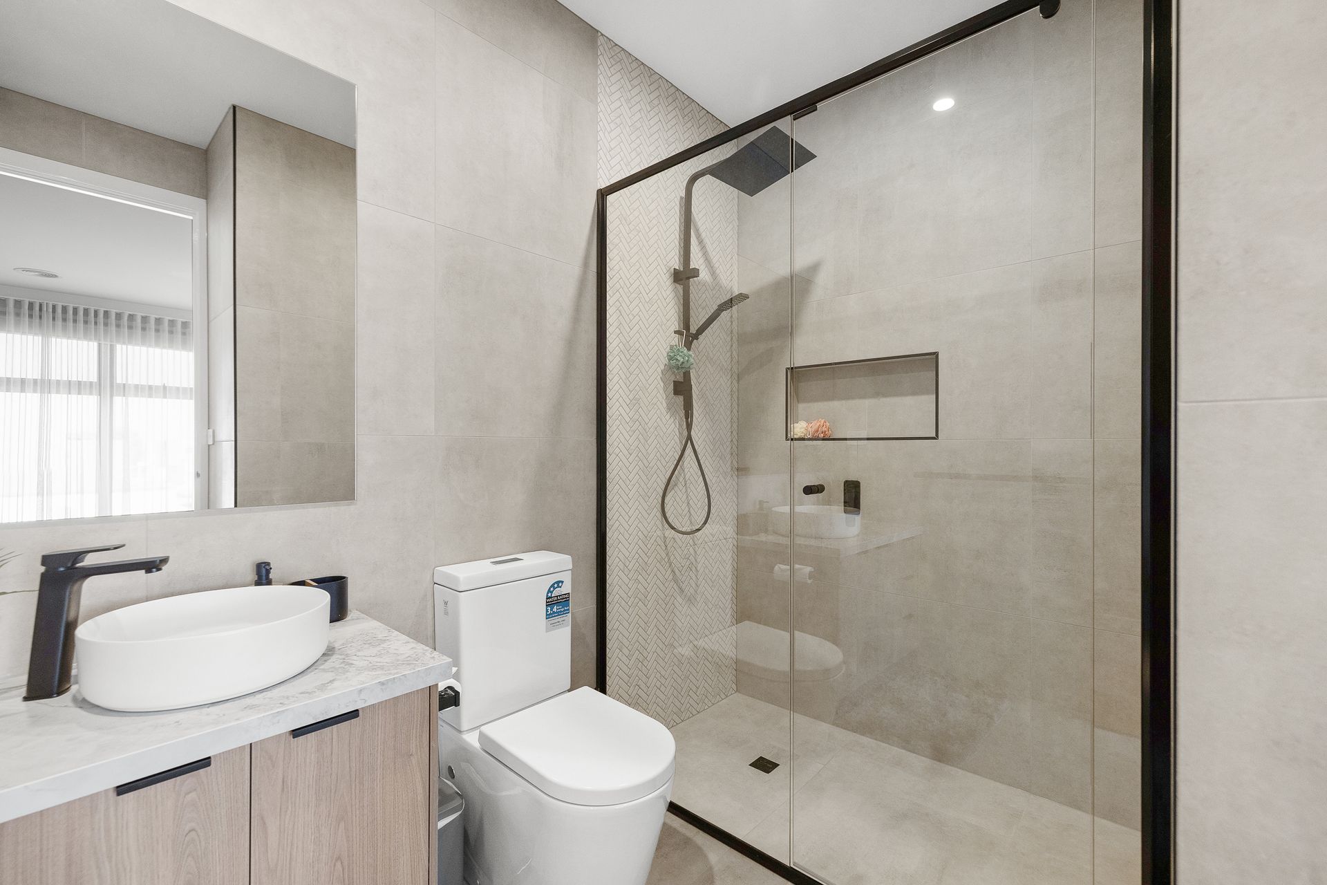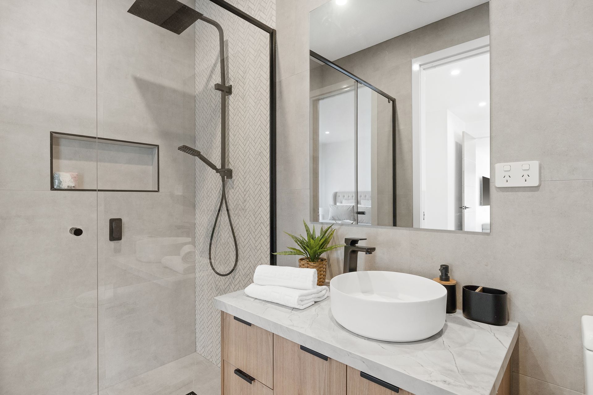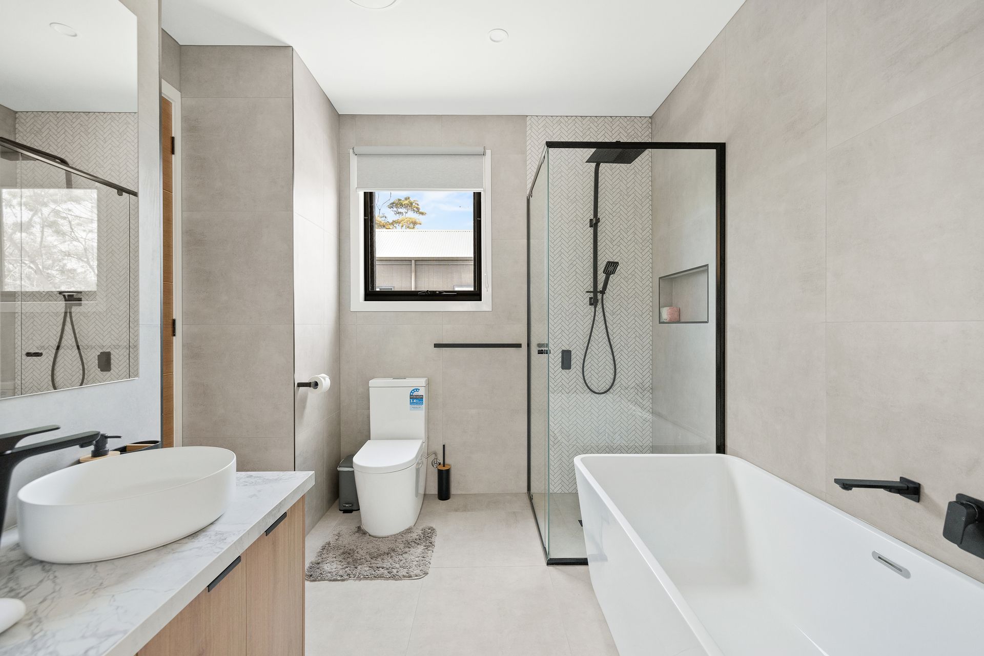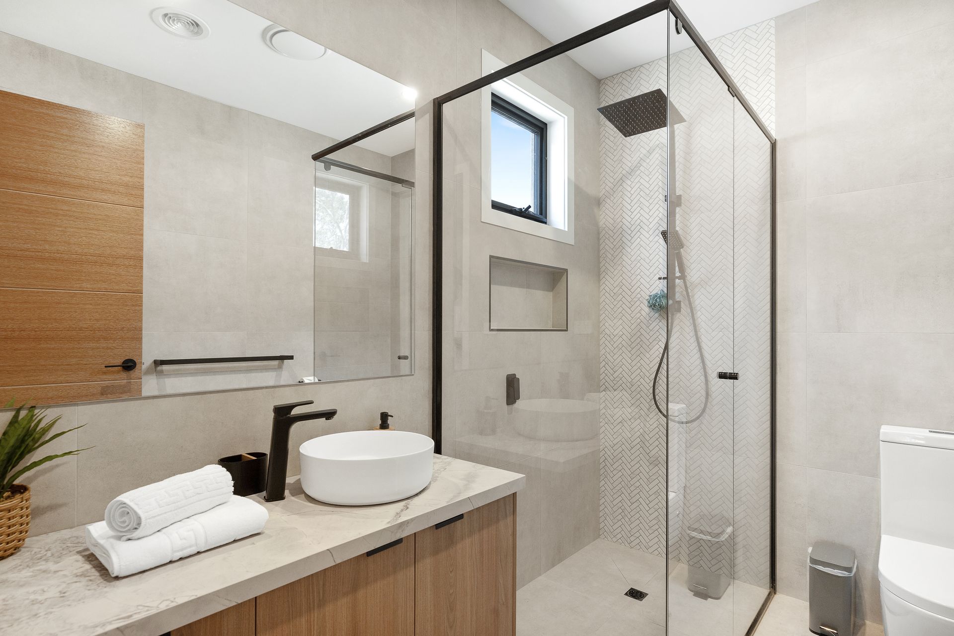 Downstairs is the huge open plan Kitchen/Dining/Living Room (with smart TV & gas fireplace) that flows out the covered Deck. Also downstairs is Bedroom 1, which features a WIR and ensuite (with shower & toilet) plus a separate Toilet and internal access to the Garage.