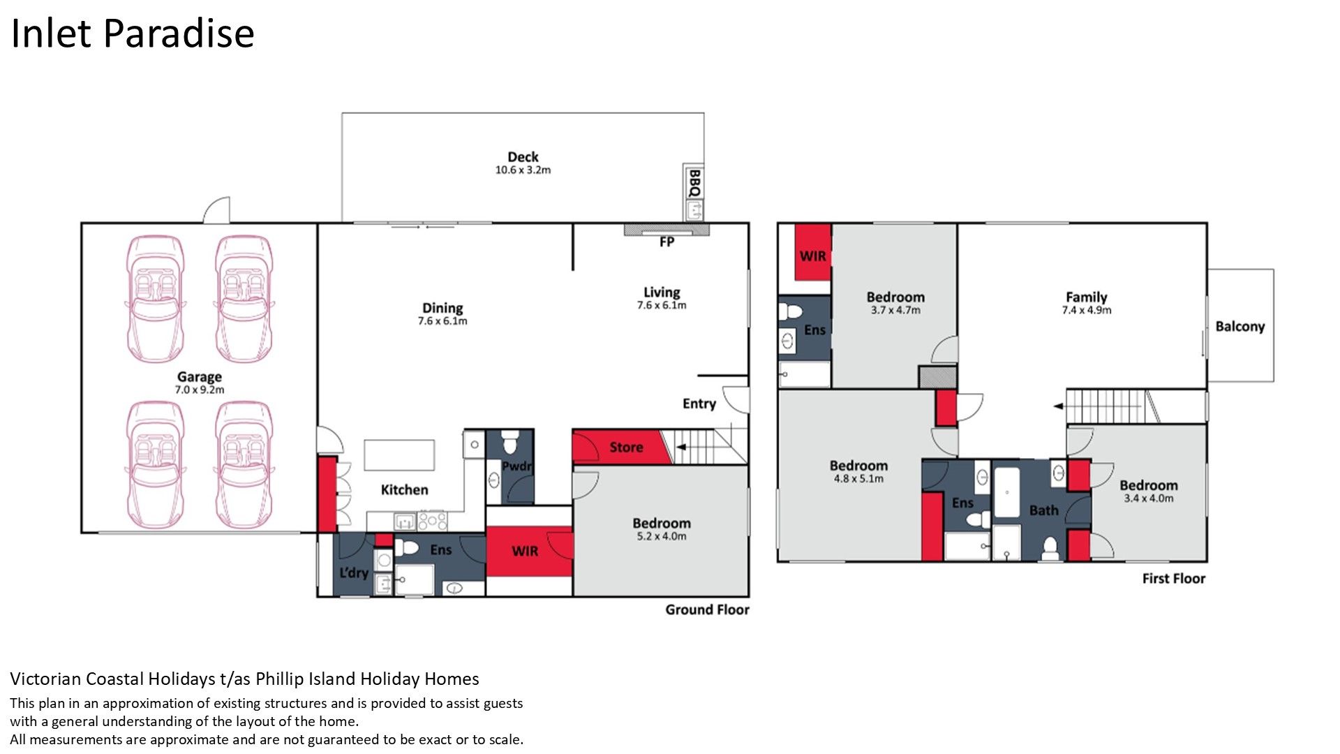 Upstairs is a large Family Room (with smart TV) providing access to a Balcony, Bedroom 2 - which features BIR and a dual-entry Bathroom (with bath, shower & toilet), as well as Bedrooms 3 and 4, each with BIR and ensuite (with shower & toilet).
