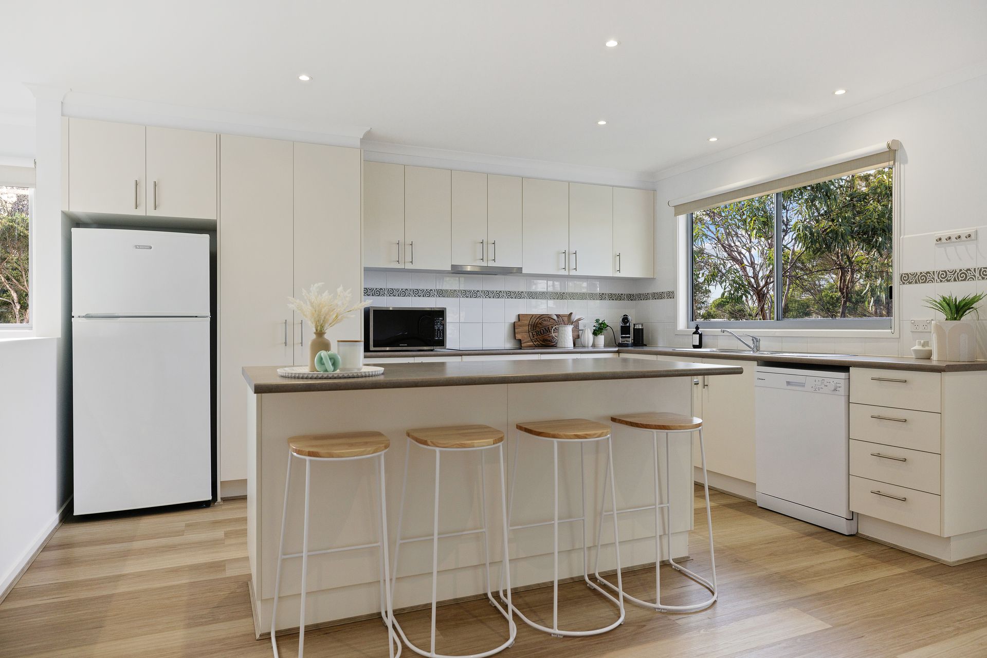 The fully appointed kitchen is equipped with cooking utensils, crockery, cutlery, microwave, Nespresso pod coffee machine, toaster, kettle, etc. plus a double sink, fridge, dishwasher, electric oven and cook top.