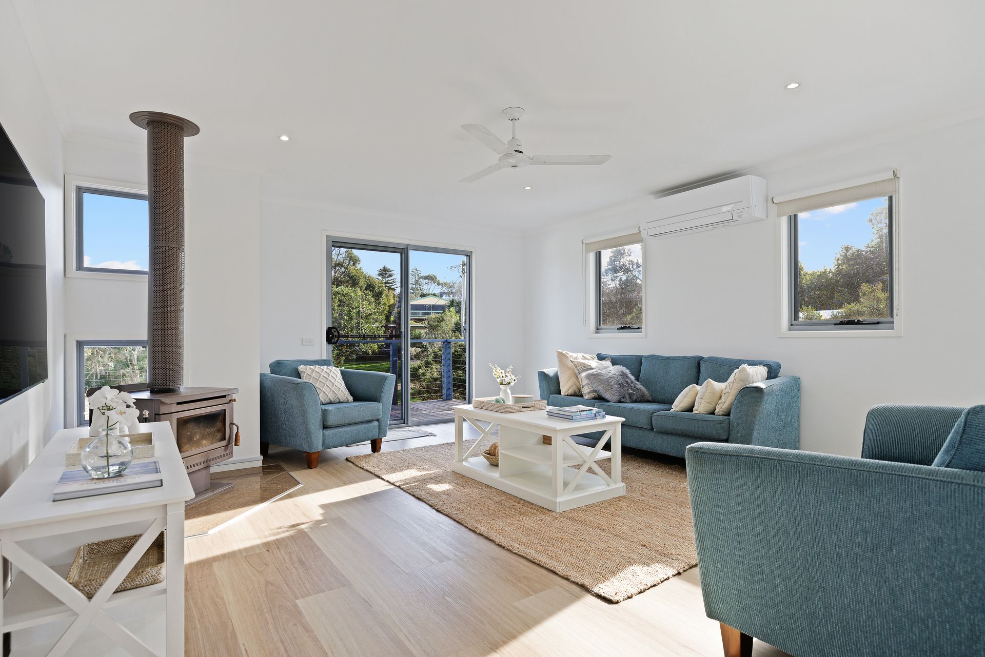 There is a wall mounted reverse cycle airconditioner, a ceiling fan in the upstairs Living Room and a ceiling fan in each bedroom 1, 2 &4, plus four additional stand-alone heaters and three fans which can be used where required. There is also a Coonara-style wood heater in the upstairs Living Room (wood provided).