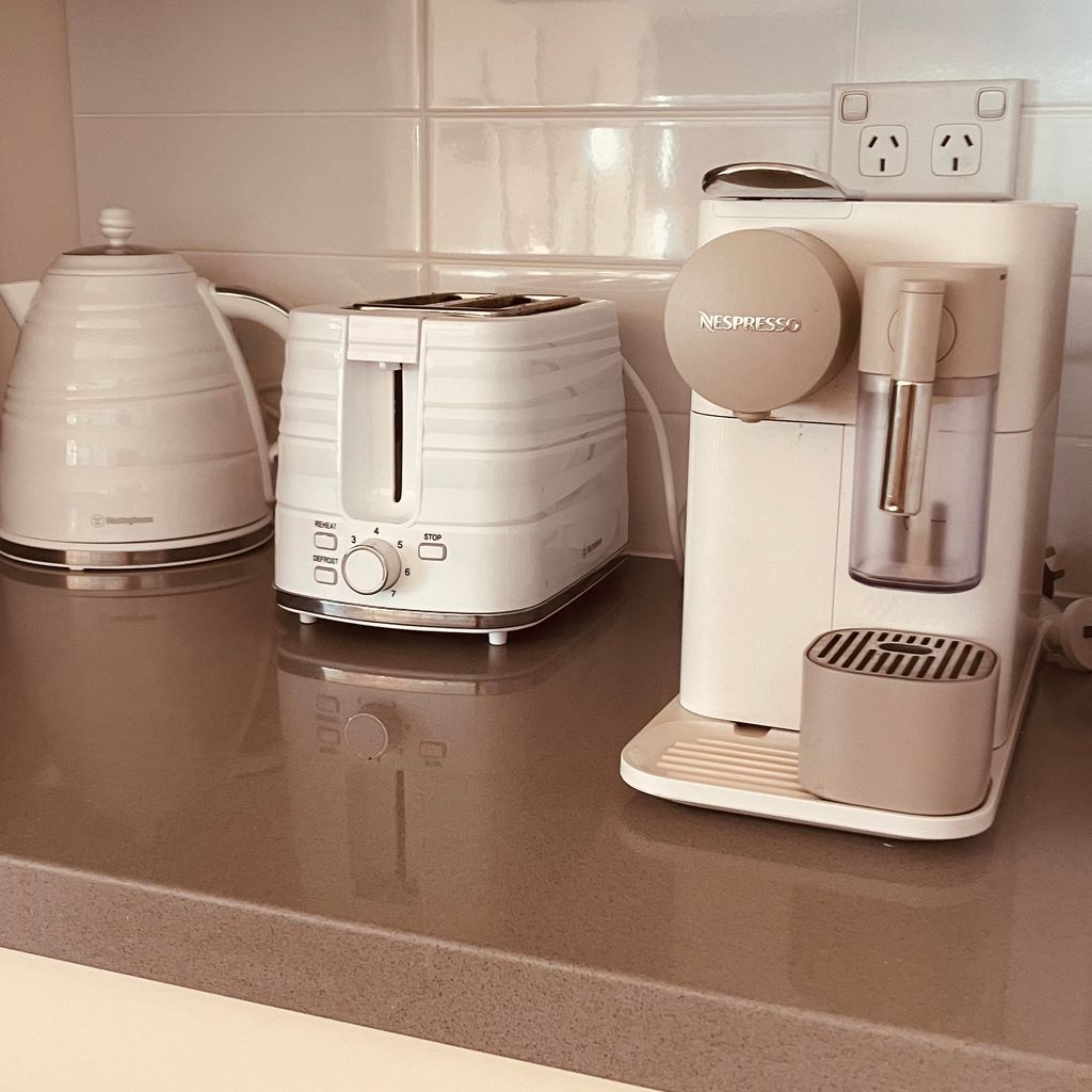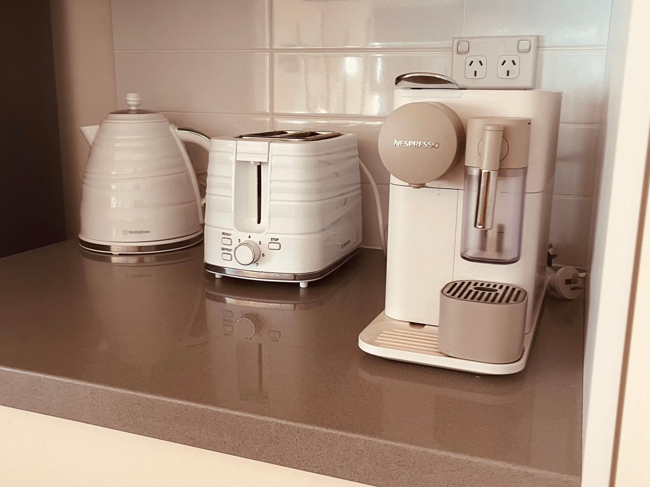 The fully appointed kitchen is equipped with standard cooking utensils, crockery, cutlery, microwave, Nespresso compatible coffee machine, toaster, sandwich grill, kettle, electric sandwich maker, plus a double sink, walk in pantry, large fridge, stainless steel dishwasher, stainless steel electric oven and cook top, and stone bench tops. The kitchen is also equipped with an airfyrer, slow cooker and commercial grade kitchen knives.