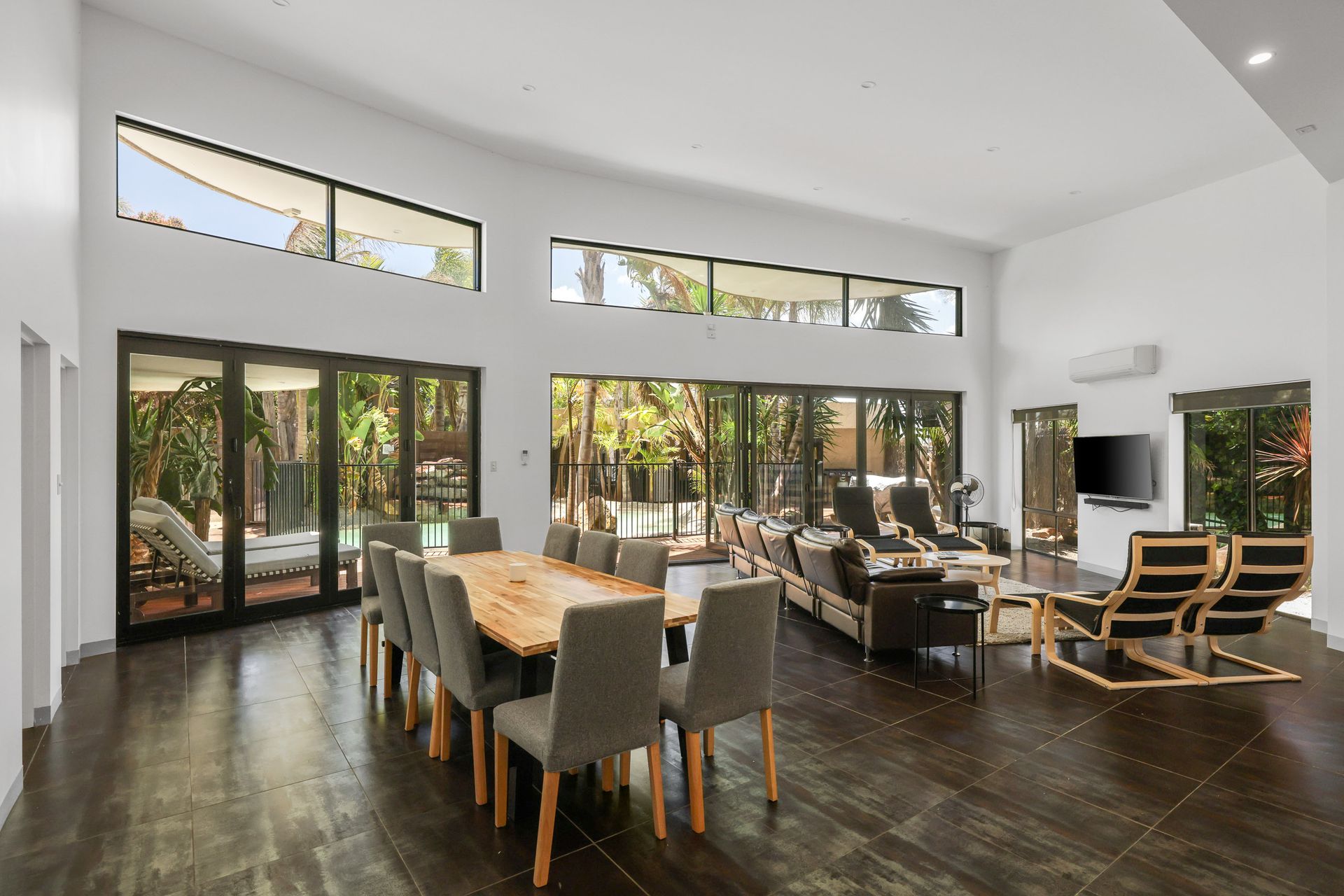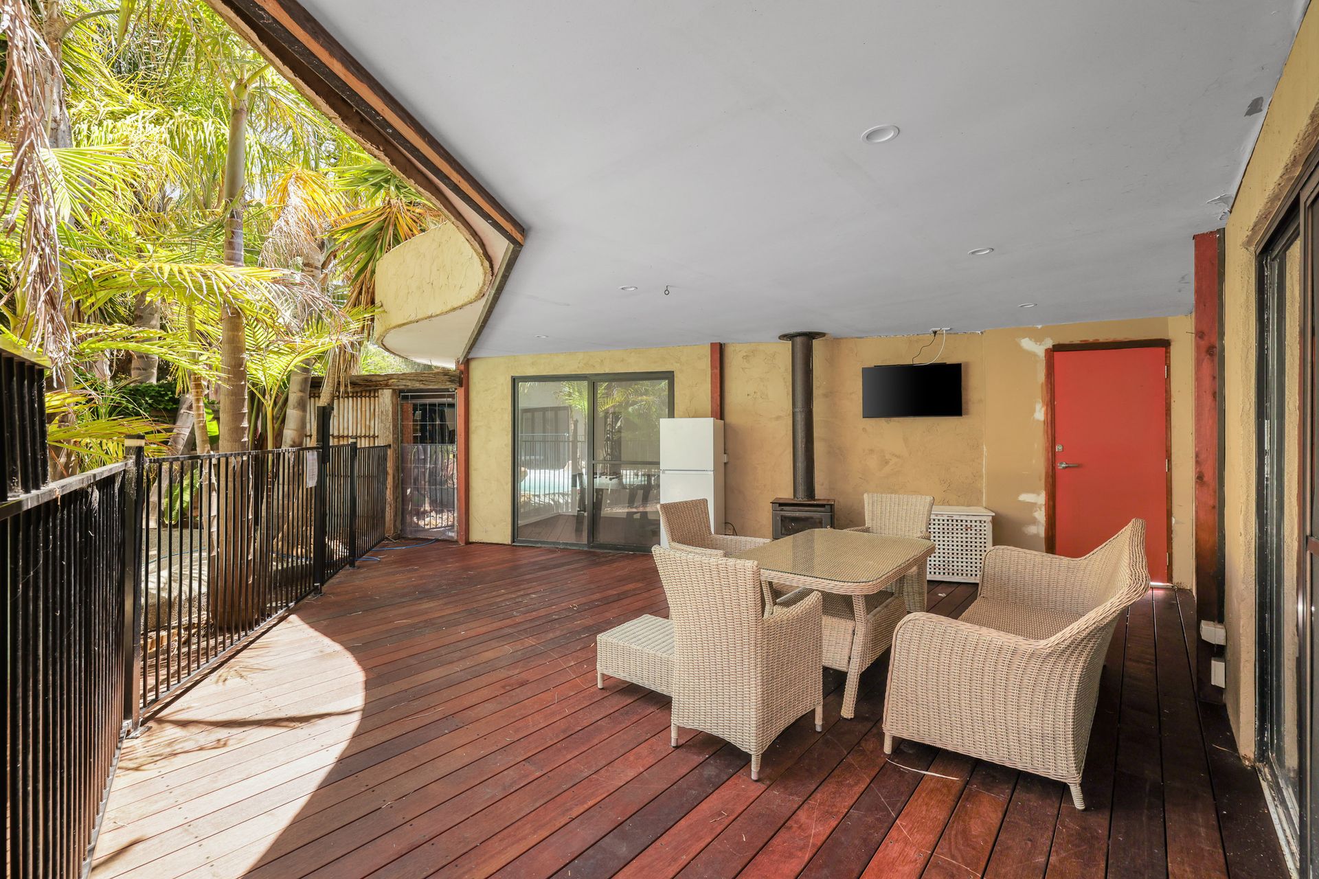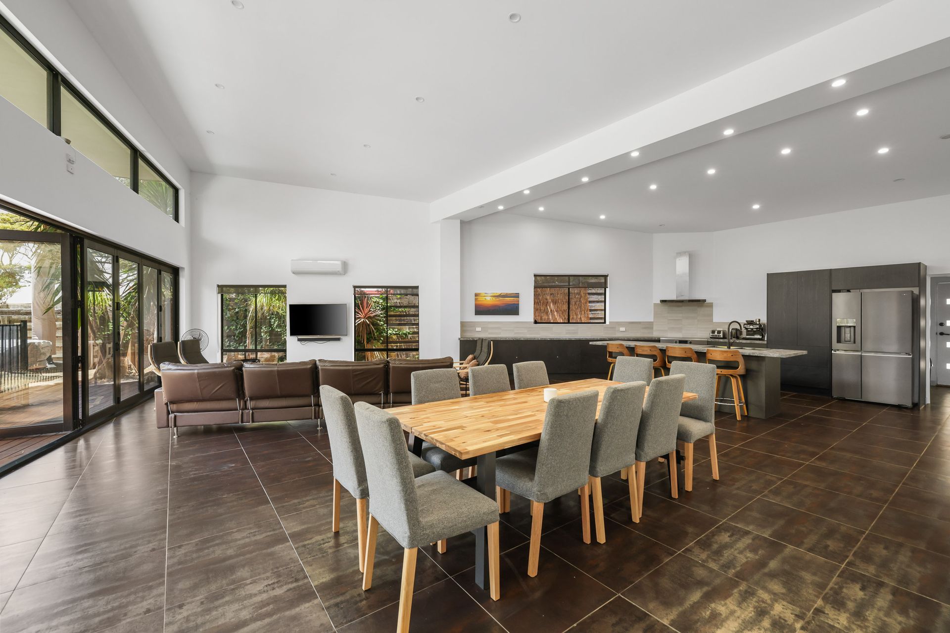 A large bank of stacker doors opens up to the enormous open plan Kitchen/Dining/Living Room (with 50" HiSense smart TV, bluetooth sound bar & speaker). Bedroom 1 features a BIR and a dual access ensuite (with shower & toilet) - also accessible from the deck area. Also accessed off the Living Room are Bedrooms 2, 3 and 4 (all with BIR) plus another large Bathroom (with shower, toilet and a fully equipped European Laundry with washing machine & clothes dryer).