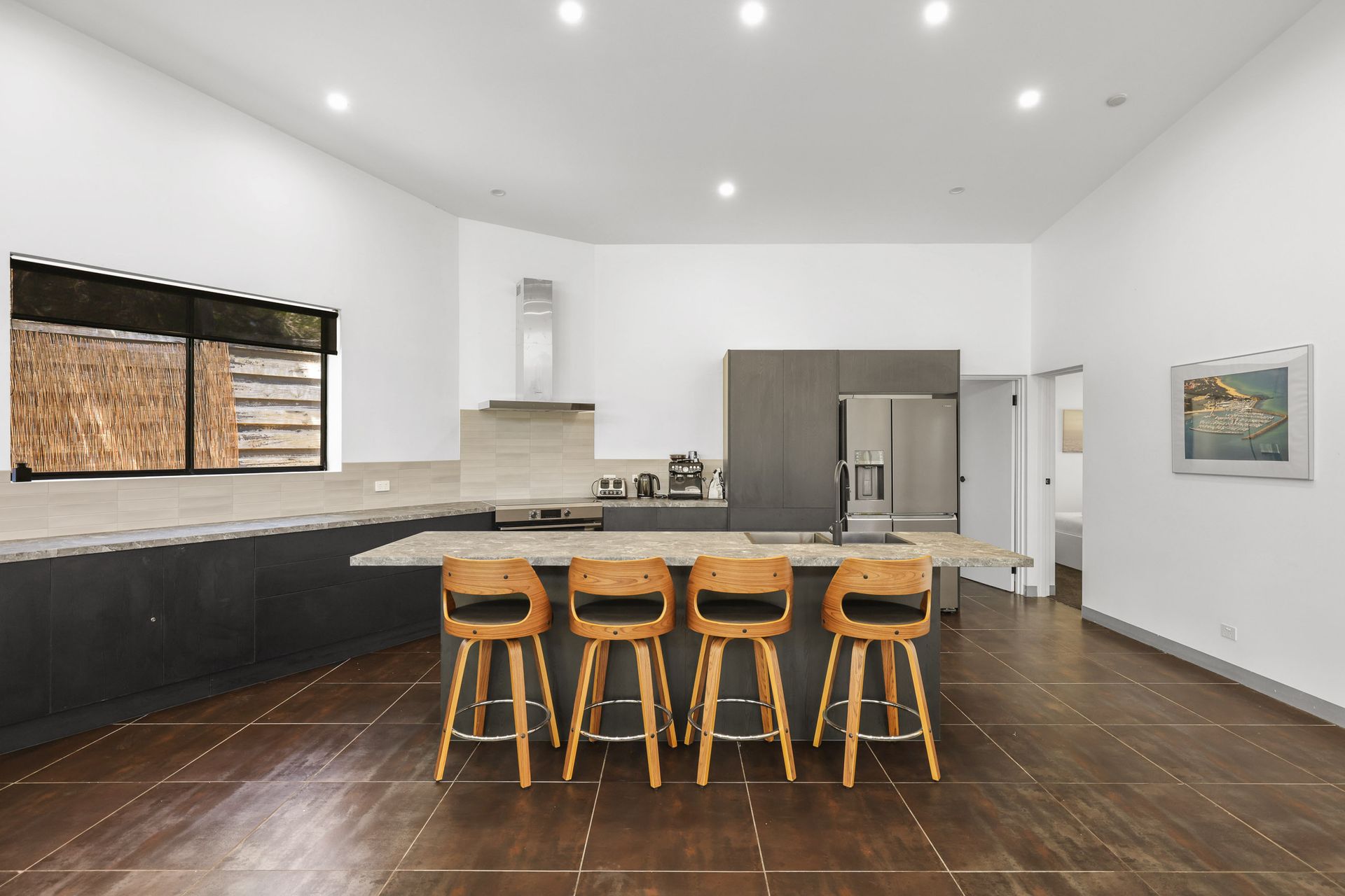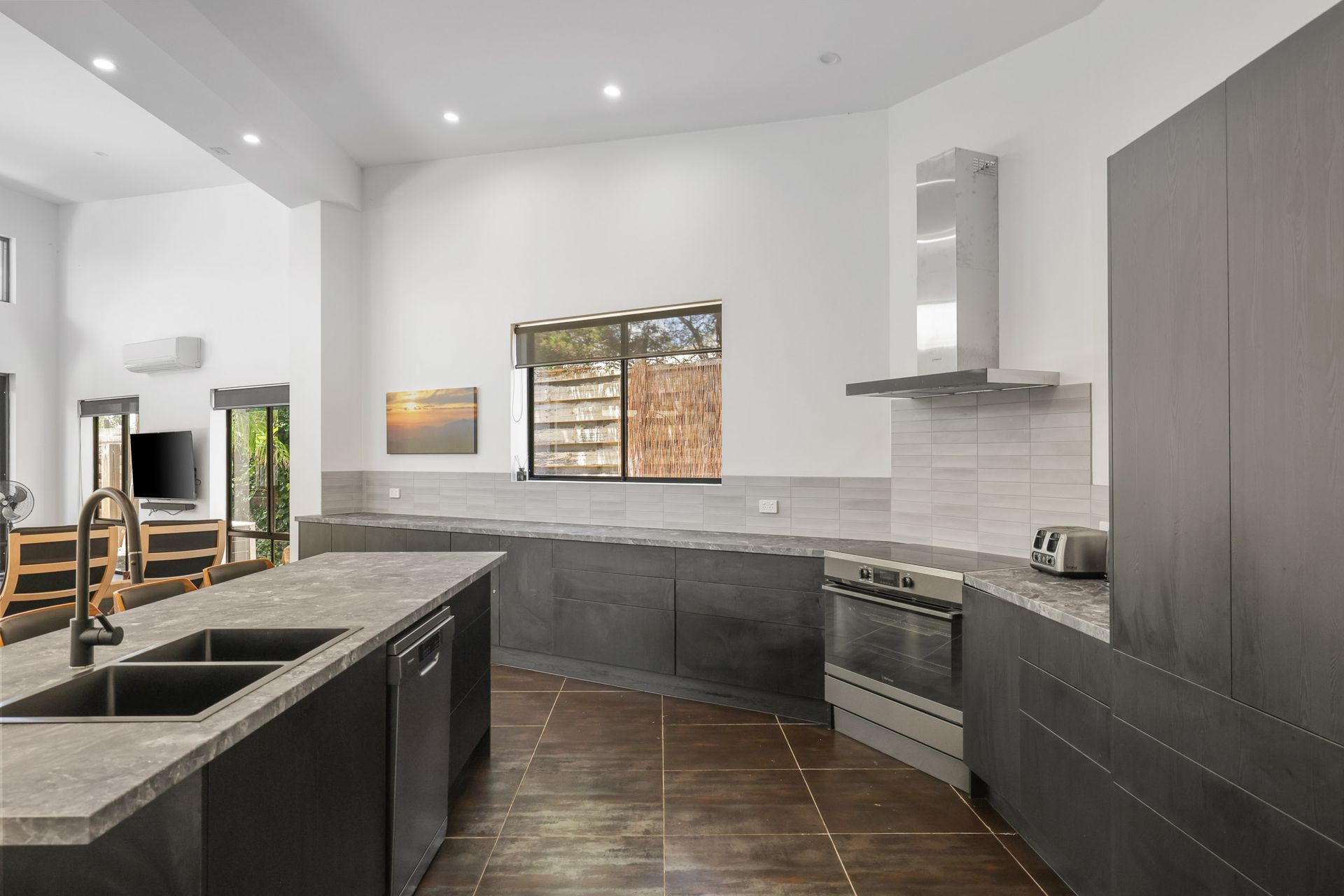 The fully appointed kitchen is equipped with cooking utensils, crockery, cutlery, microwave, Breville bean coffee machine, air fryer, rice cooker, 4-slice sandwich press, toaster, kettle, etc. plus a double sink, large French double door fridge with ice maker, dishwasher, 900mm electric oven and 6-point induction cook top.