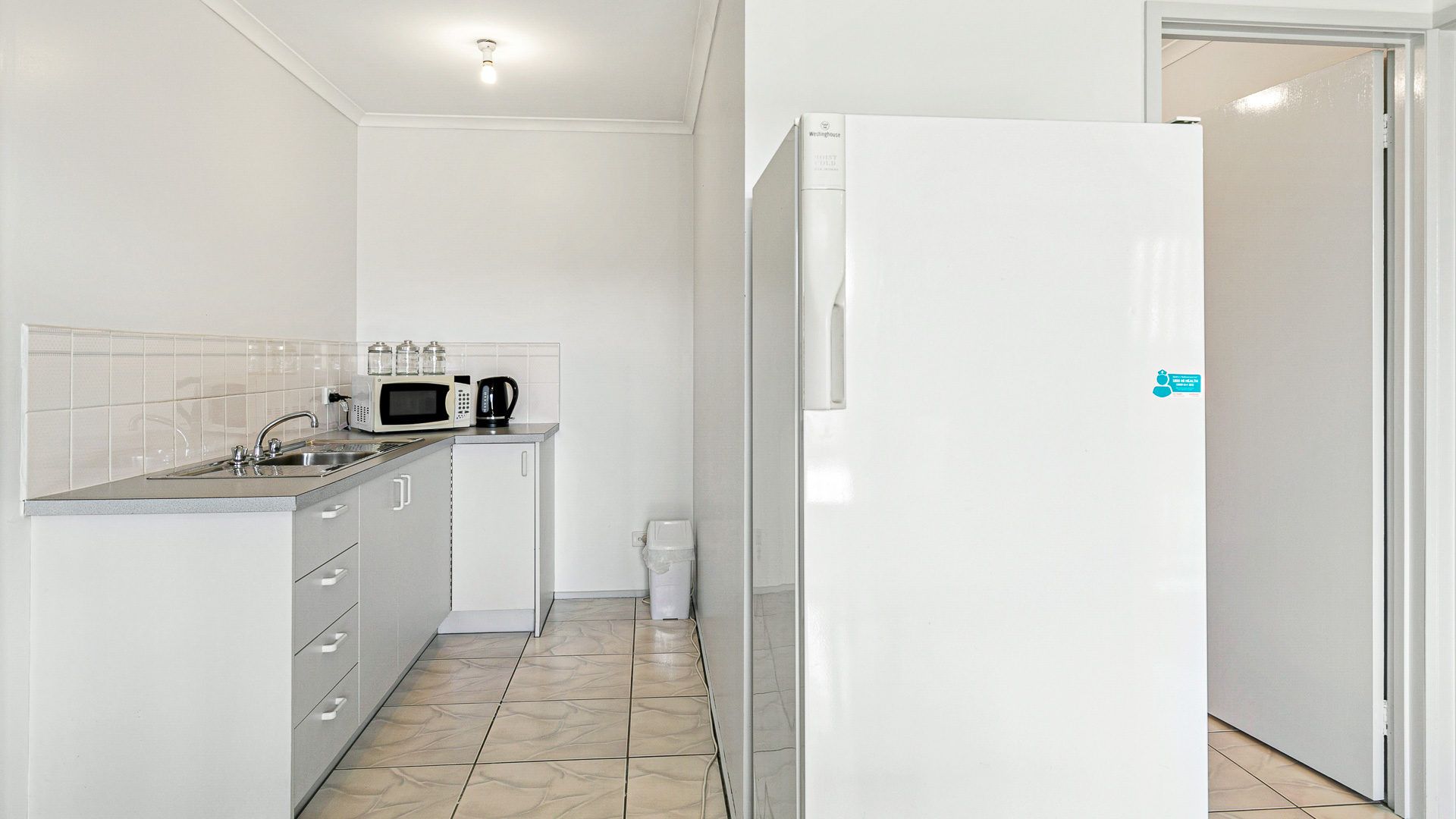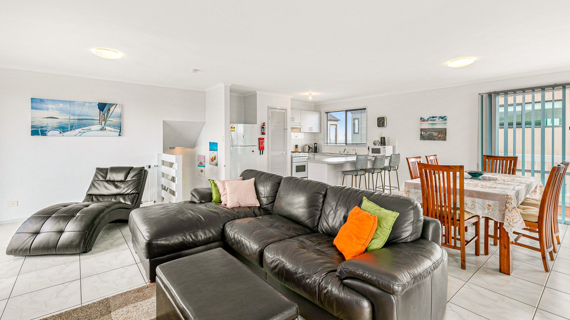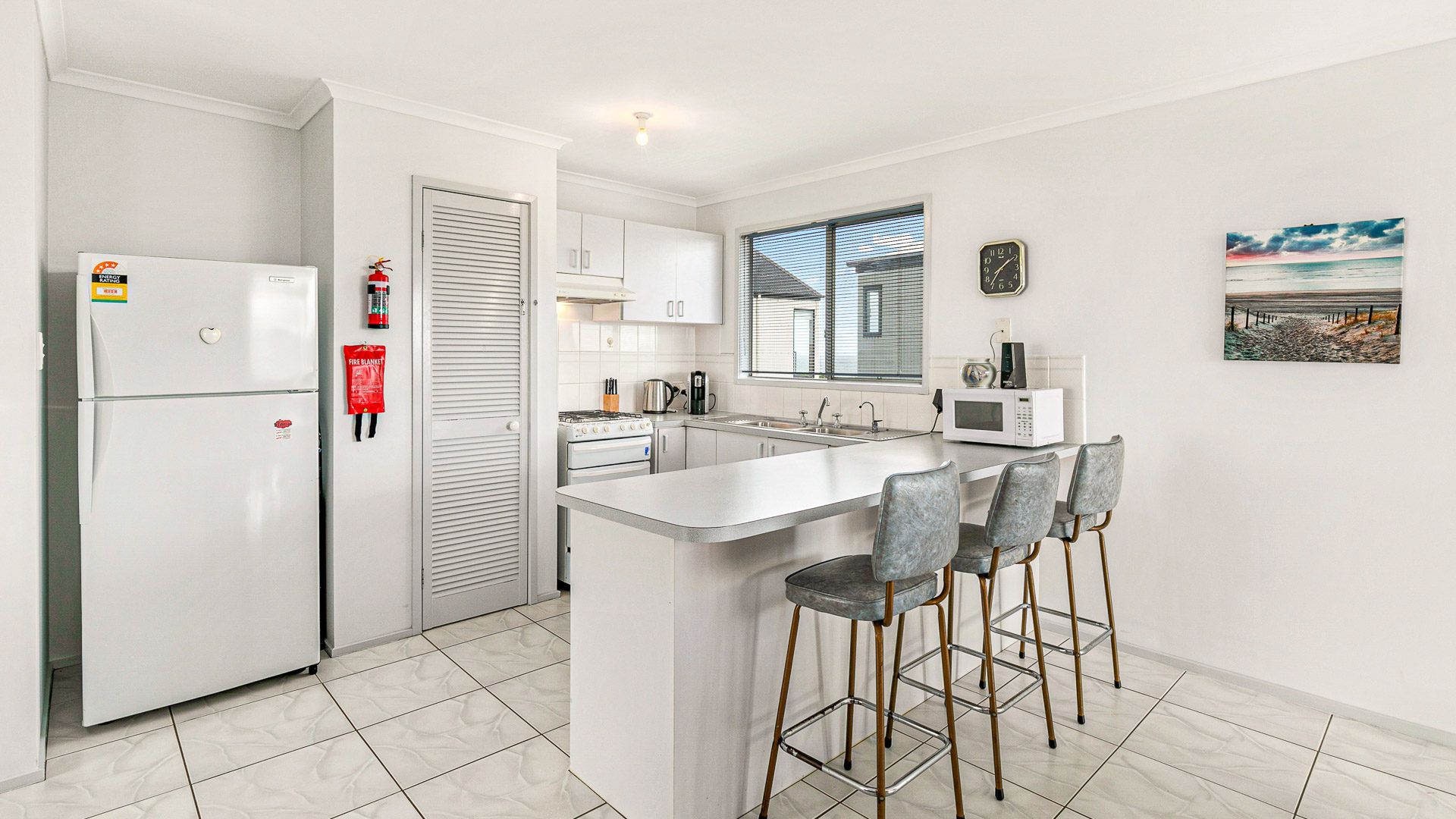 The fully appointed upstairs kitchen is equipped with standard cooking utensils, crockery, cutlery, microwave, Aldi pod coffee machine, toaster, kettle, etc. plus a double sink, pantry, large fridge, electric oven and cook top.