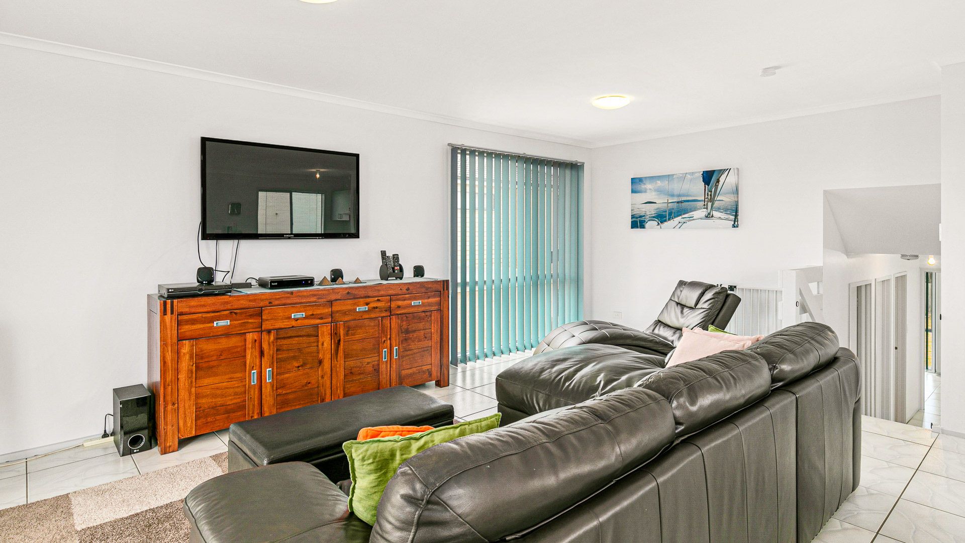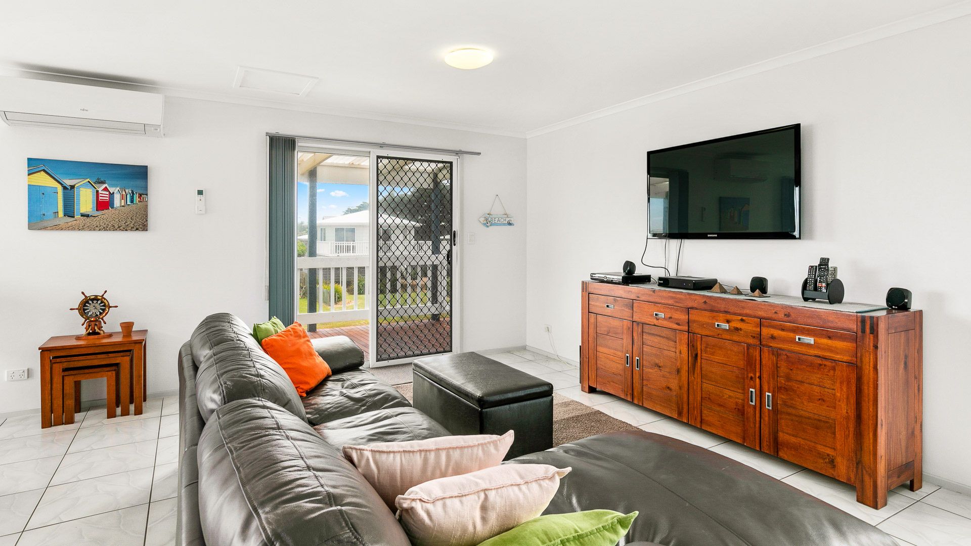 The upstairs Living room home has a wall mounted reverse cycle air conditioner and the downstairs Living room has a wall mounted heater. There are also mobile fans and electric heaters in all the bedrooms.