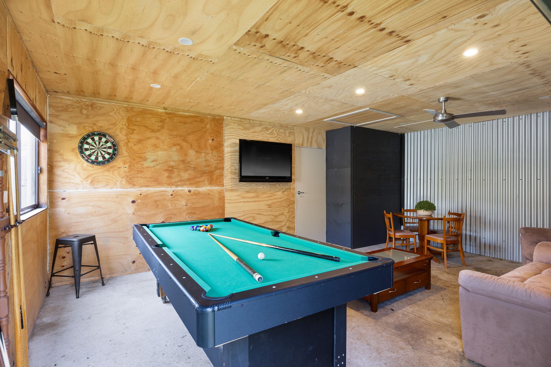 There is a separate Bungalow in the back yard which has a huge Lounge/Games Room (with TV, pool table, couches and dart board), as well as Bedroom 4 which has a kitchenette and an ensuite (with shower & toilet).