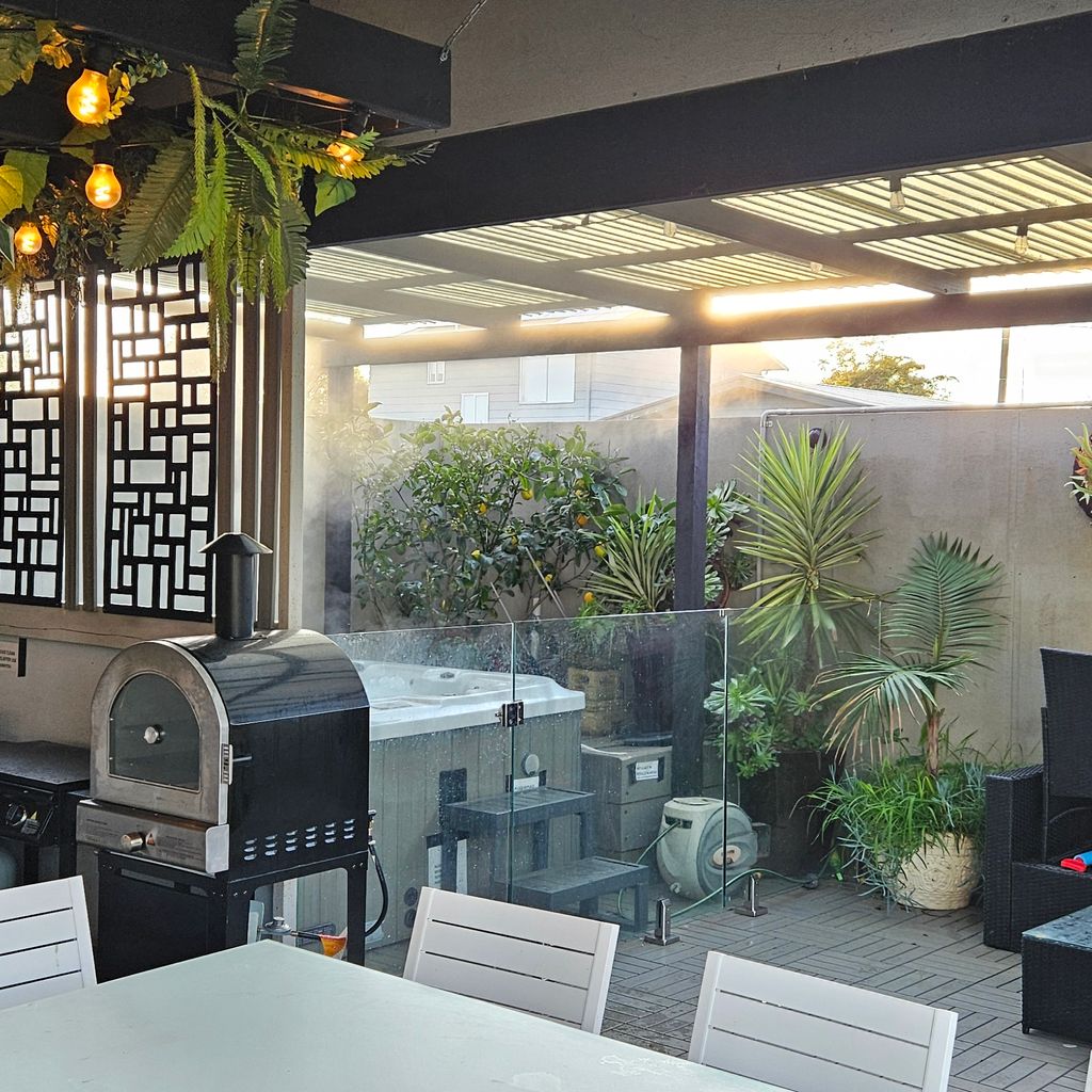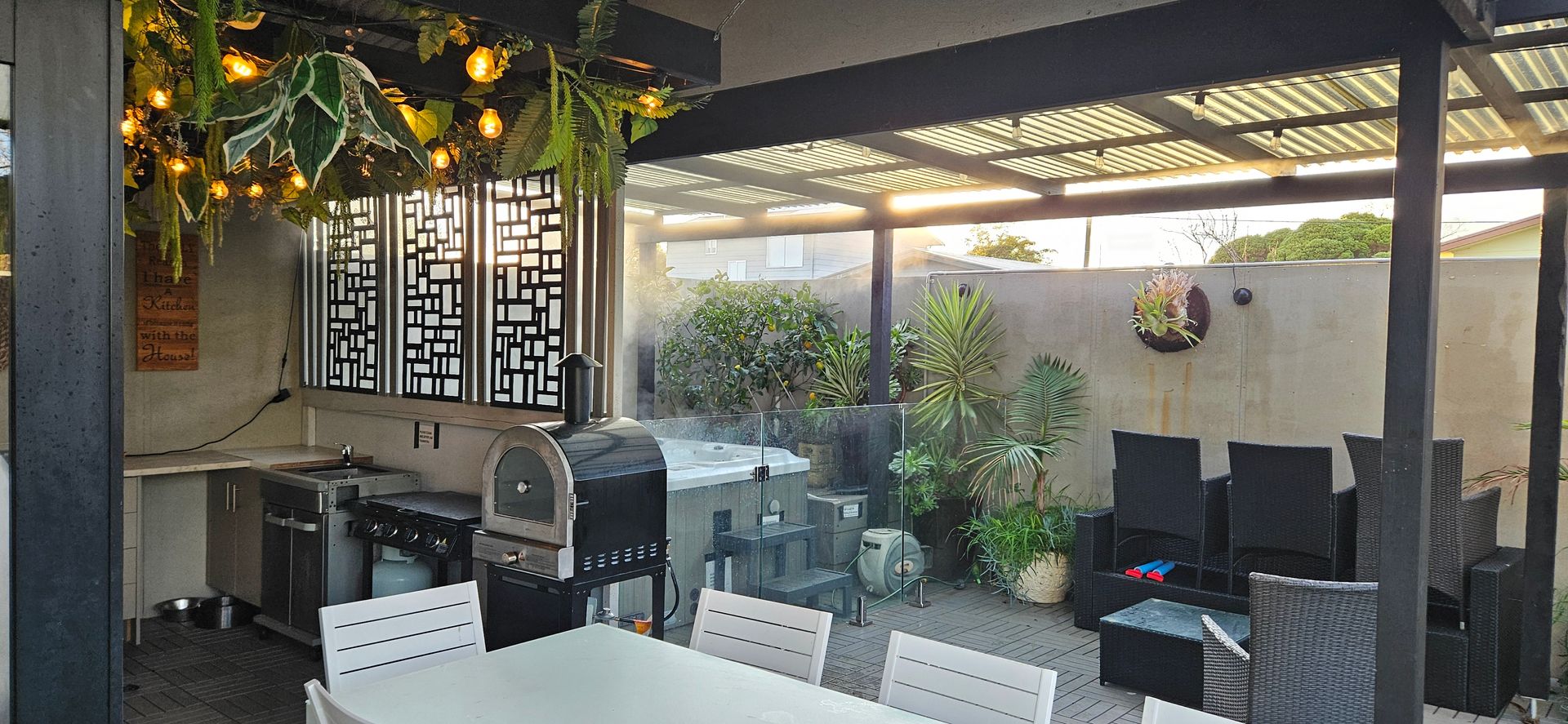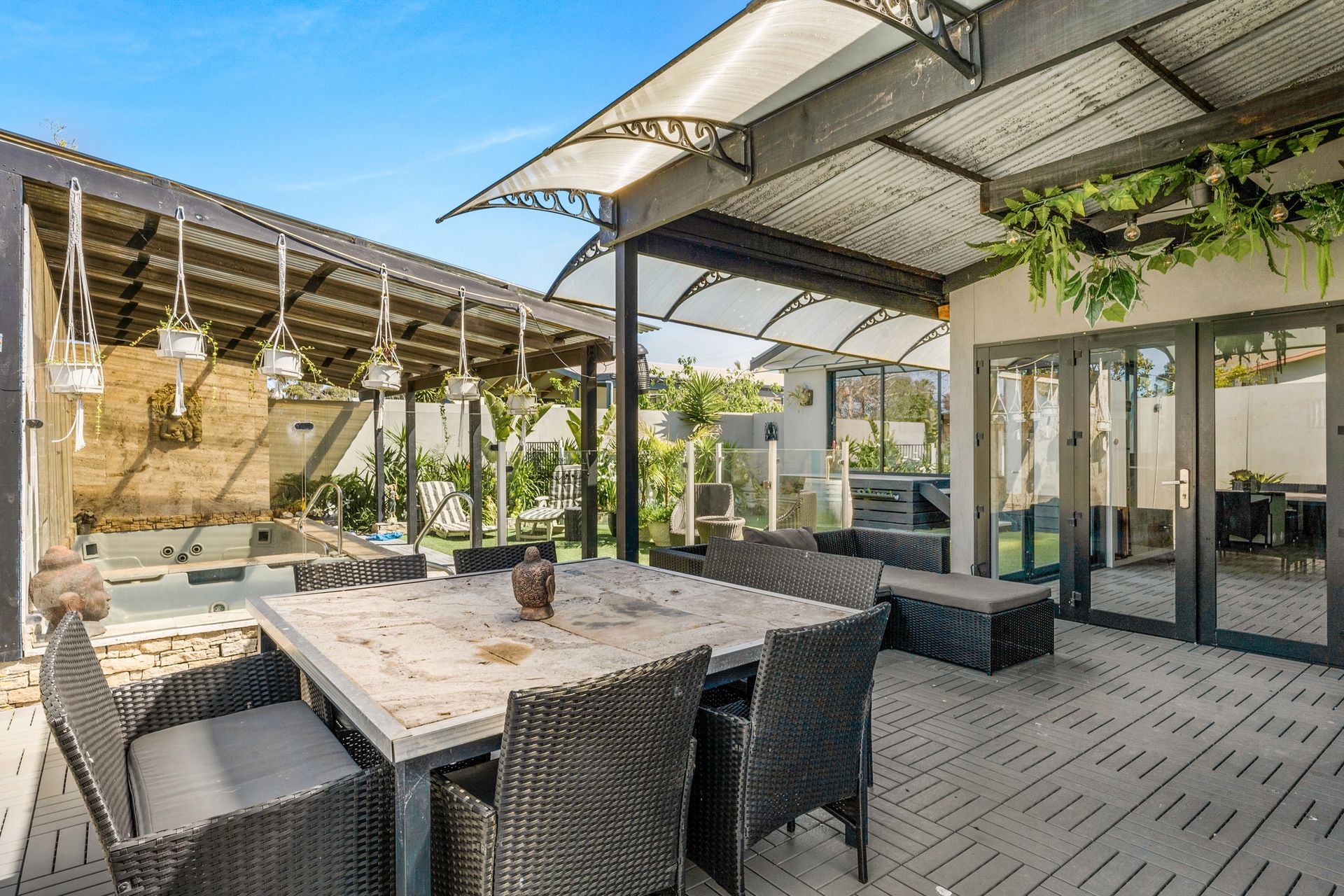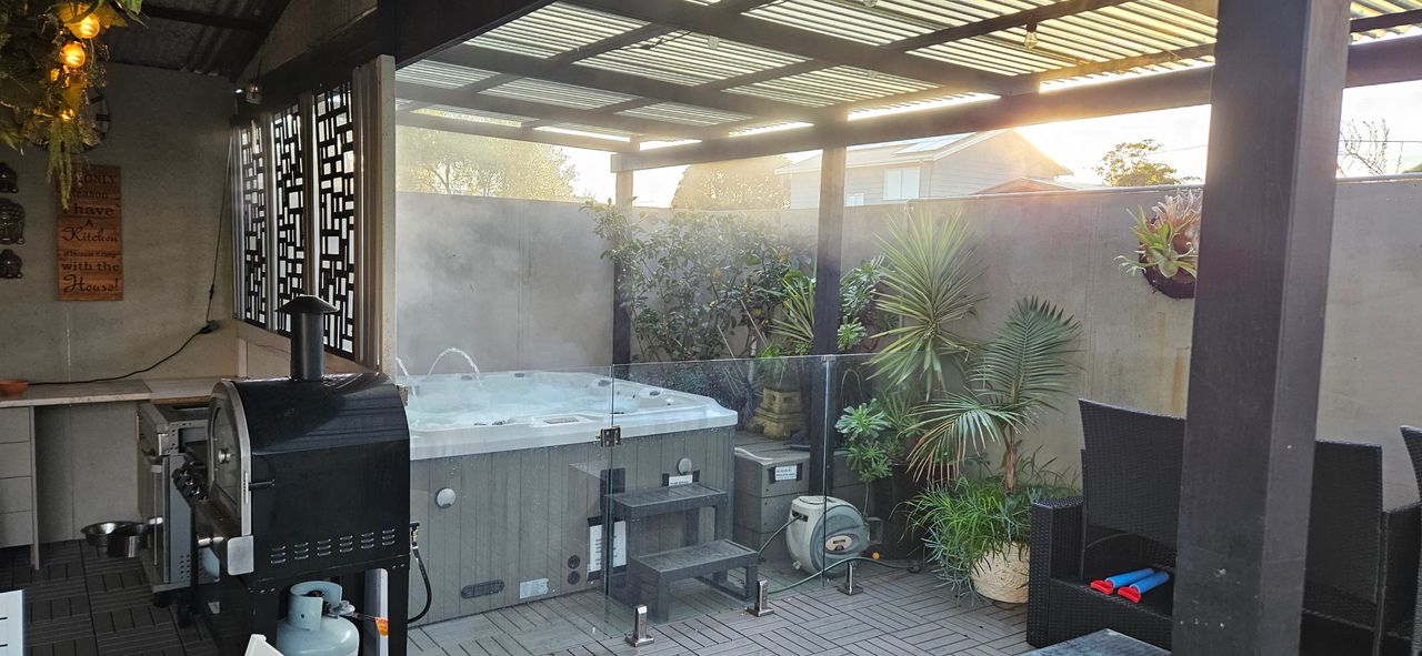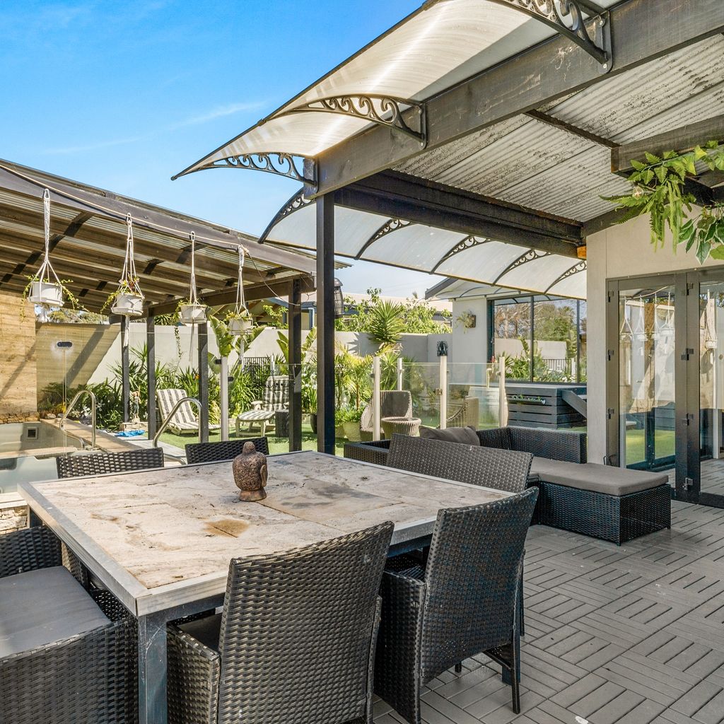 The rear yard is fully enclosed and is perfect for children and pets alike. The fully covered outdoor kitchen features a sink with hot/cold water, gas pizza oven, large table with 8 seats, 3 bar stools, an outdoor couch and some lounge beds. The key attraction is the rear yard with its covered pergola housing the electric heated 8-seater spa (2.3m x 2.3m) and heated (electric heat pump) kids wading pool (2.3m x 2.5m, 300mm deep), and swim-spa/pool (4.5m x 2.2m), each with a waterfall feature.